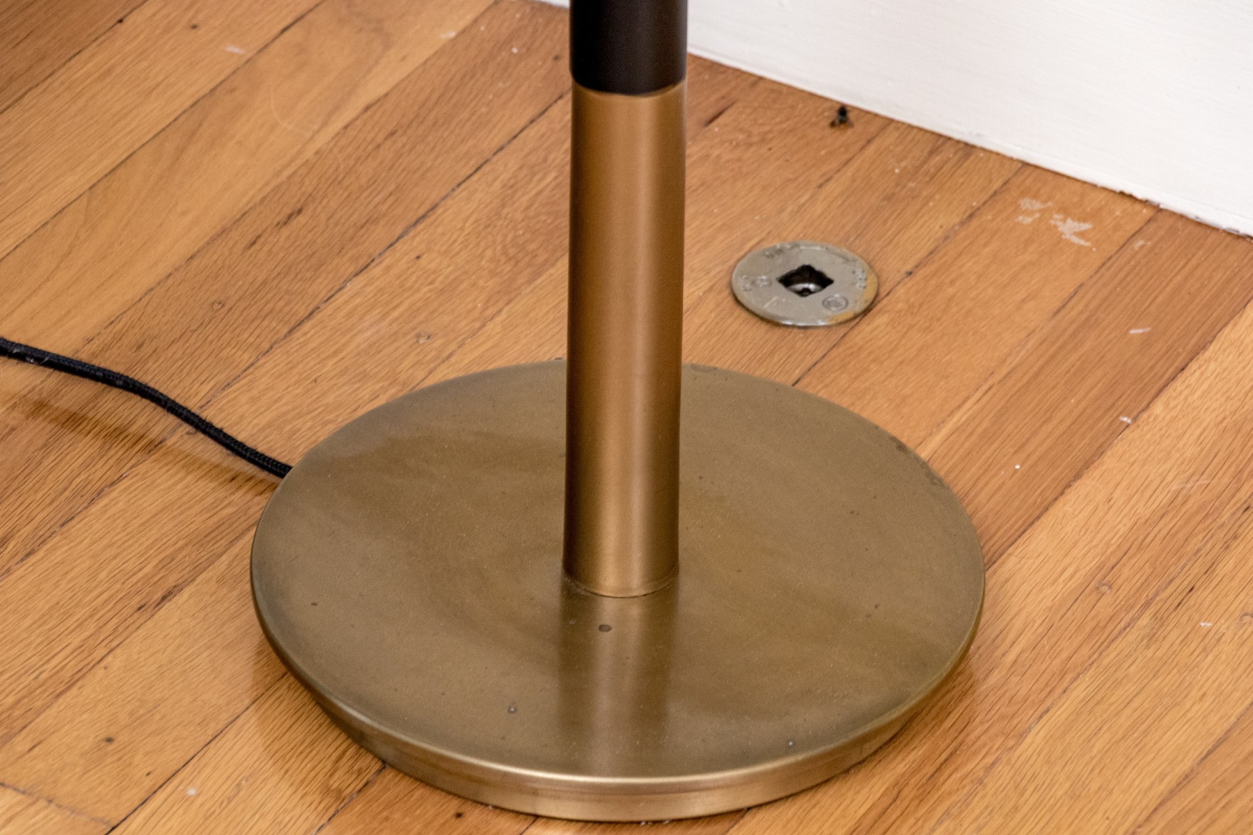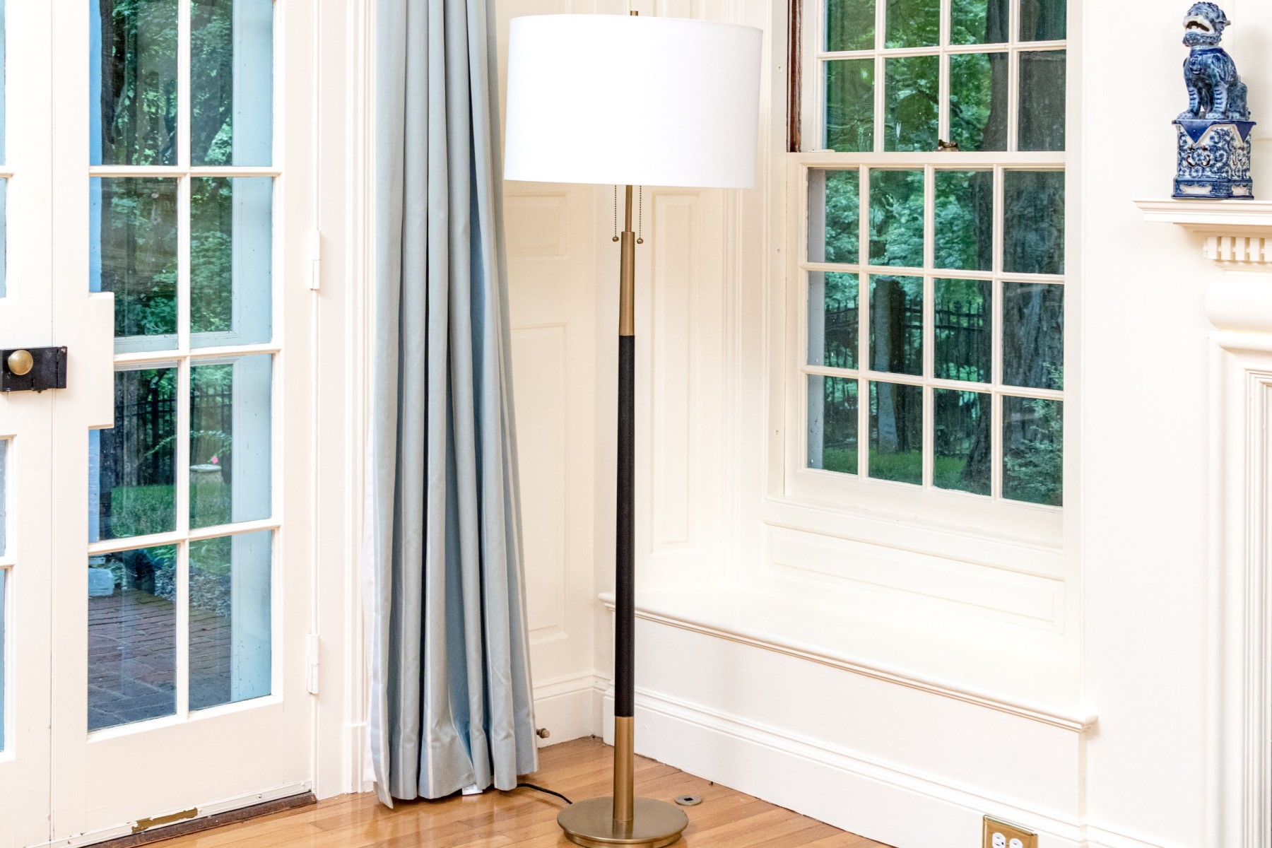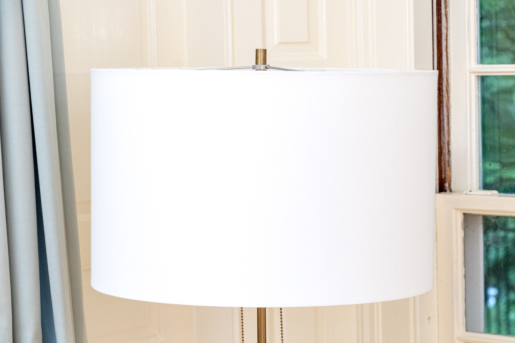 A gorgeous Pottery Barn for Williams-Sonoma "Reese" floor lamp showcasing a white drum shade surmounting a timeless brass and black column subtly tapering out to a circular foot.