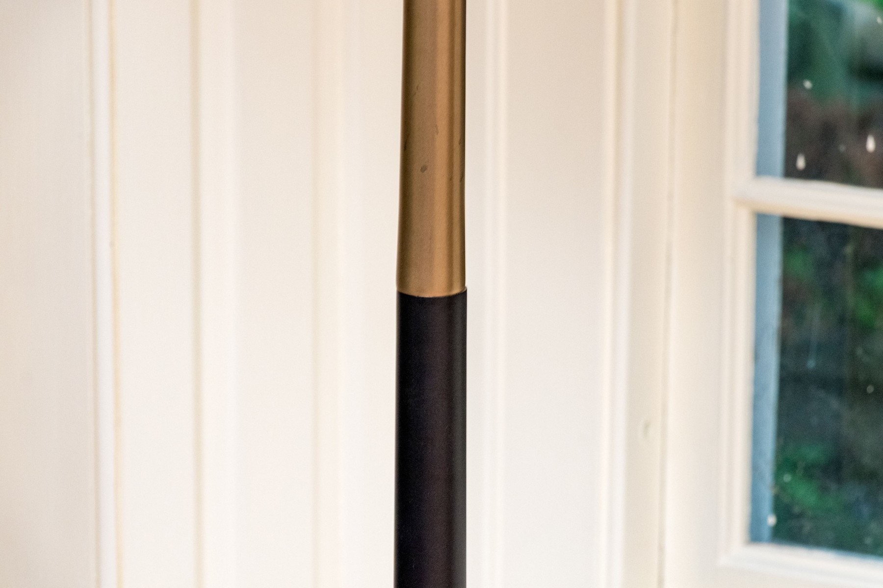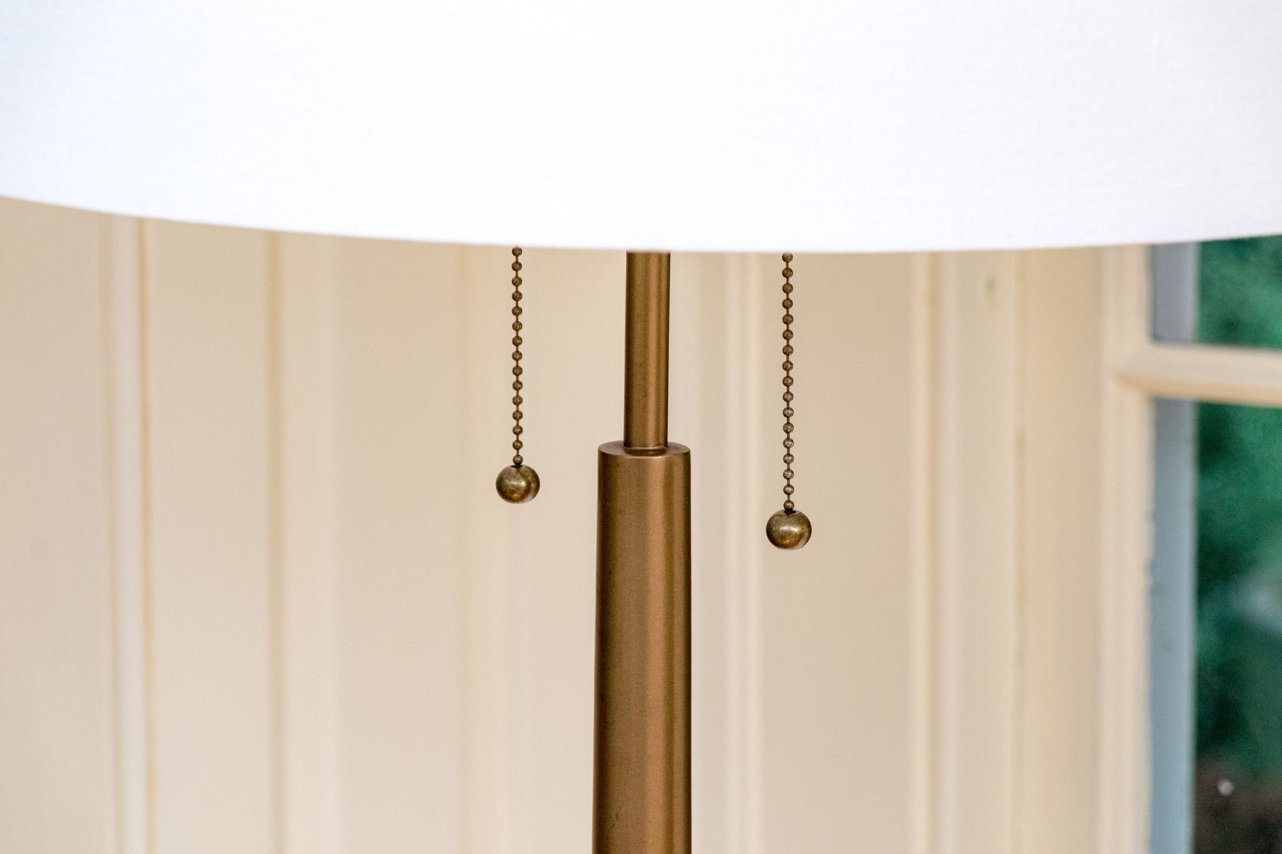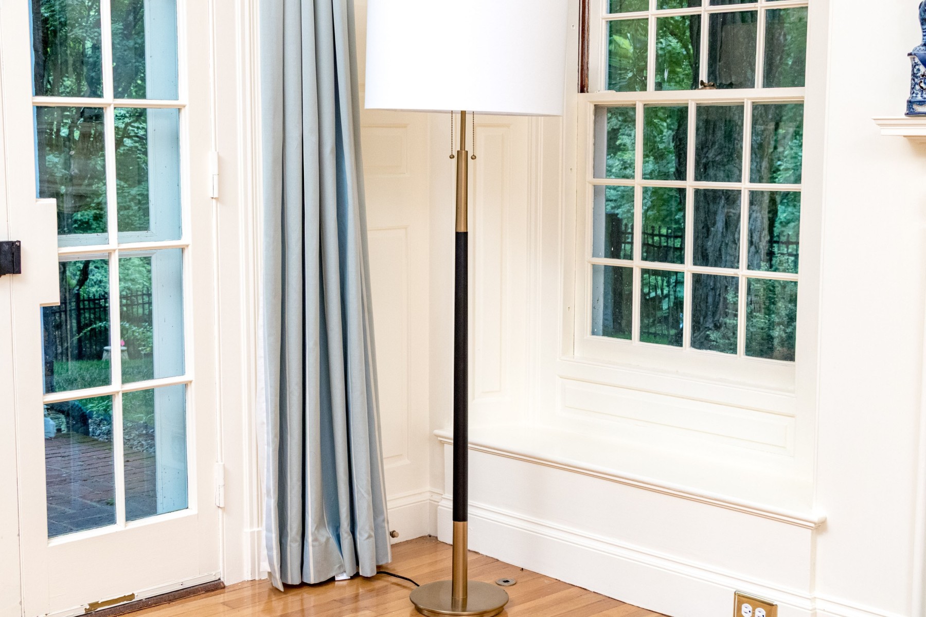 A gorgeous Pottery Barn for Williams-Sonoma "Reese" floor lamp showcasing a white drum shade surmounting a timeless brass and black column subtly tapering out to a circular foot.