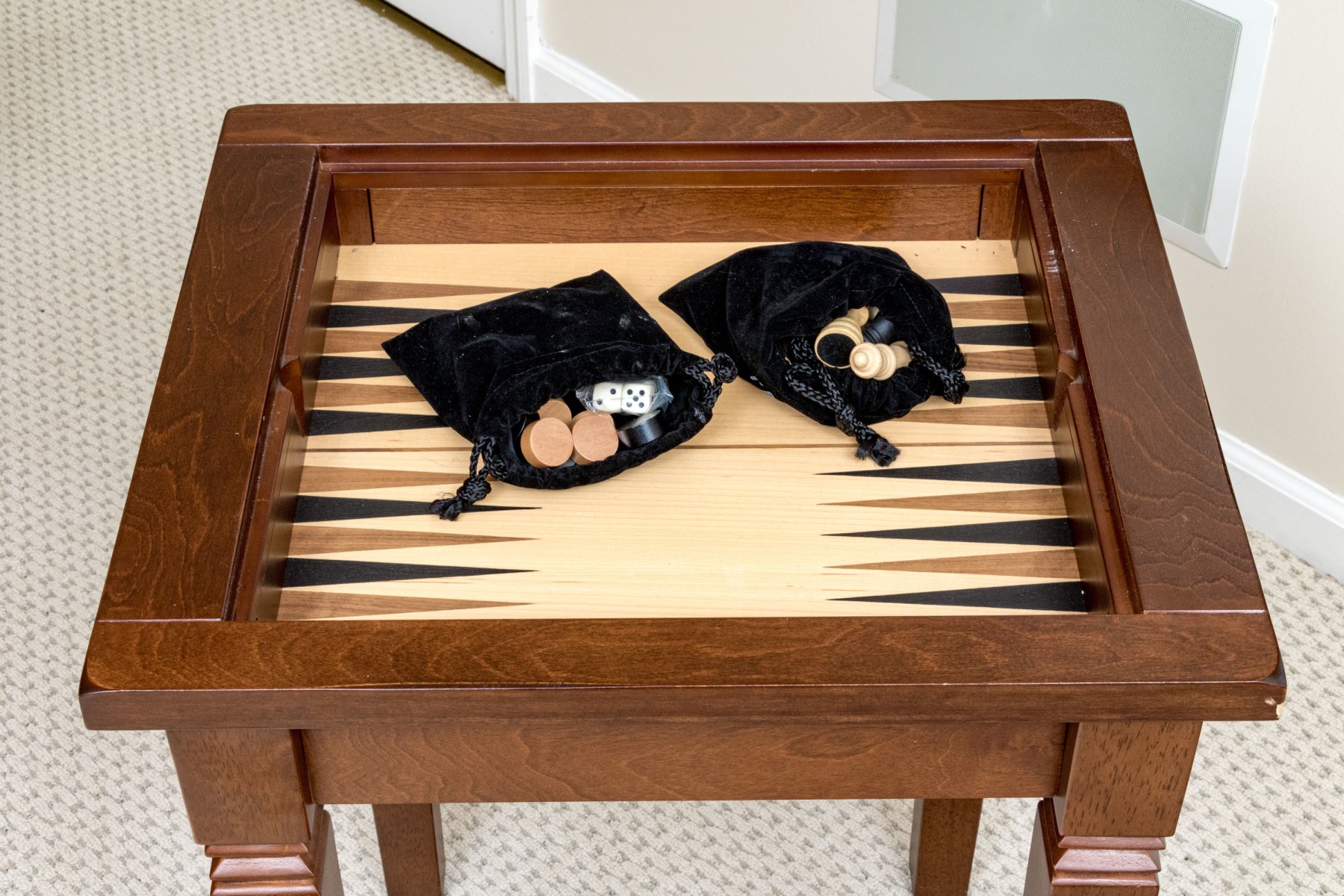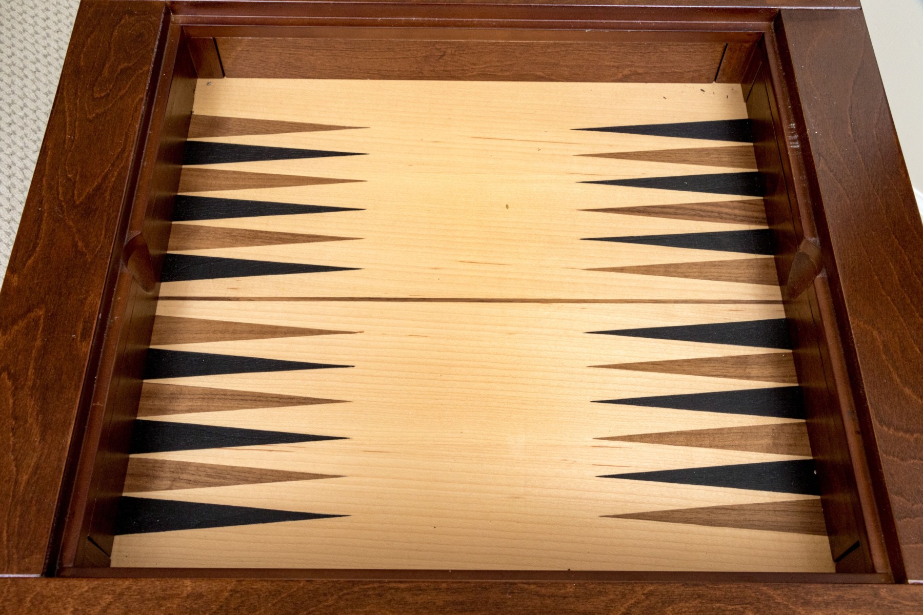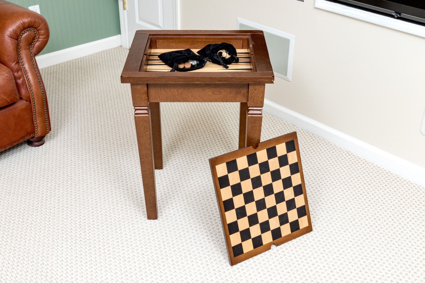 A handsome Pottery Barn games table in a warm medium brown finish. Features an inset table center with a chess/checkers lid opening to a recessed backgammon board. Simply detailed at the tops of tapered legs.