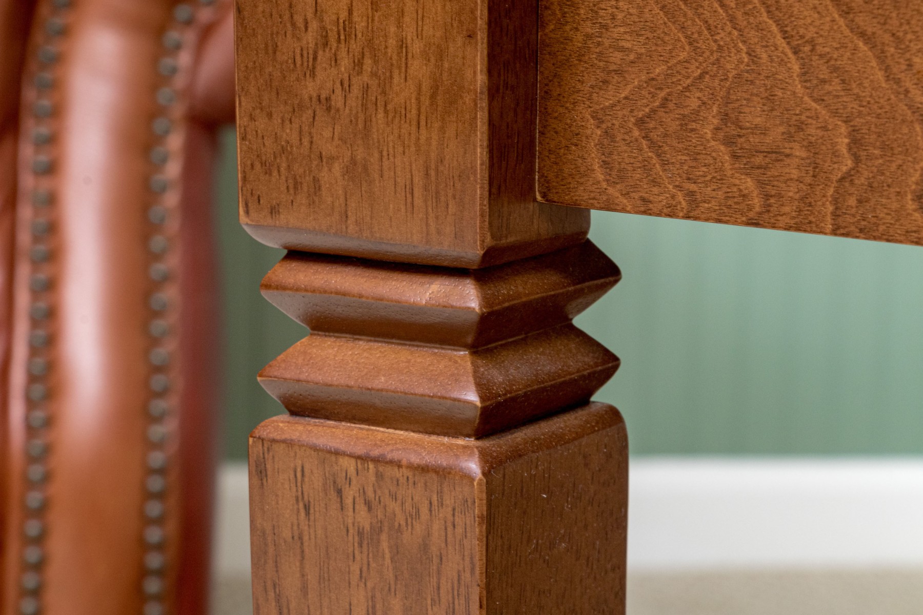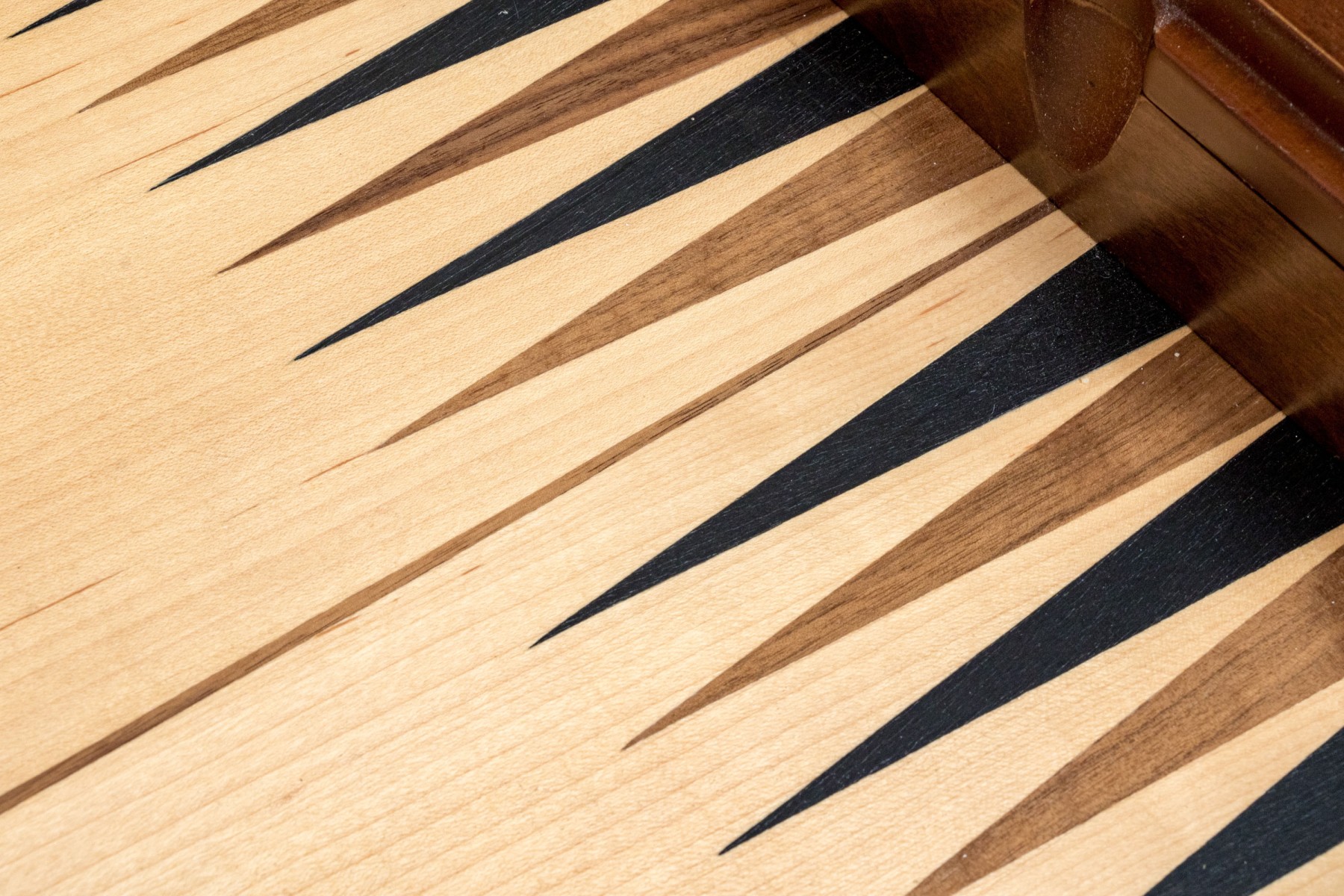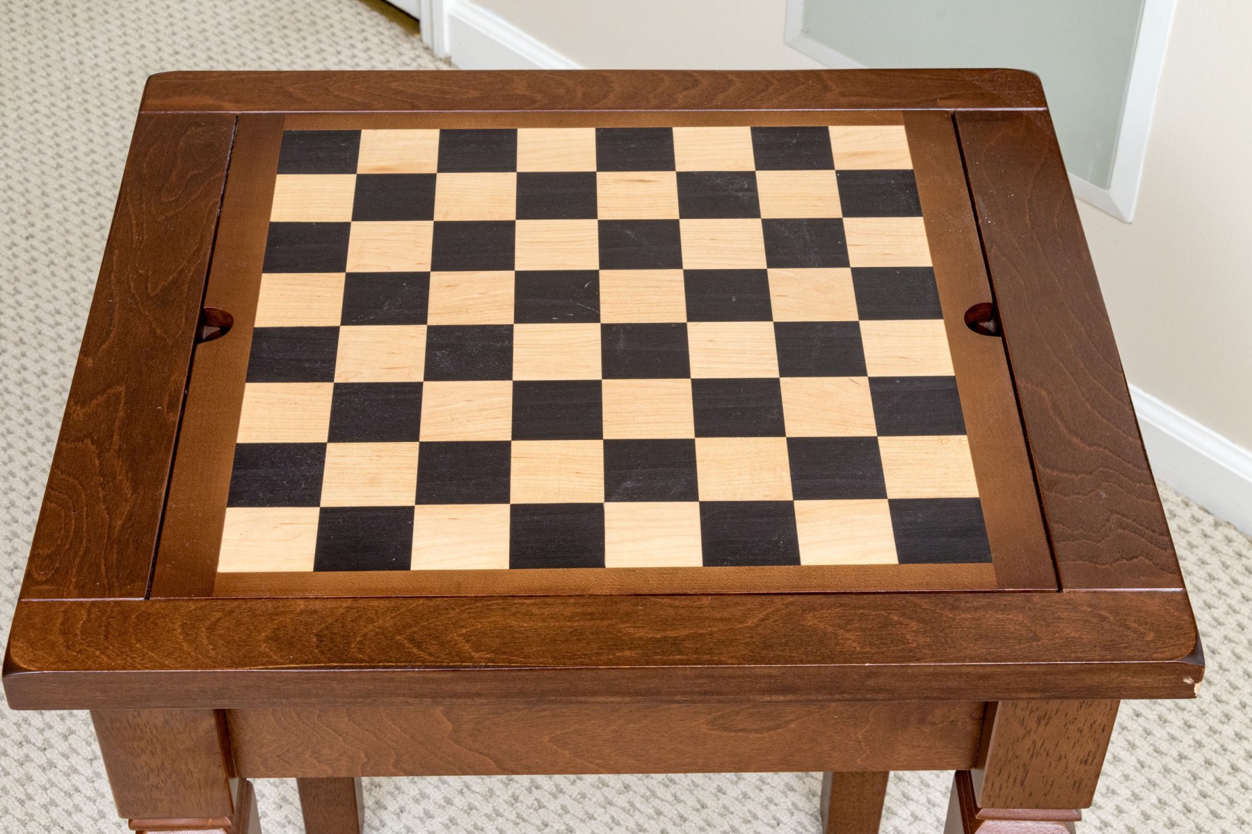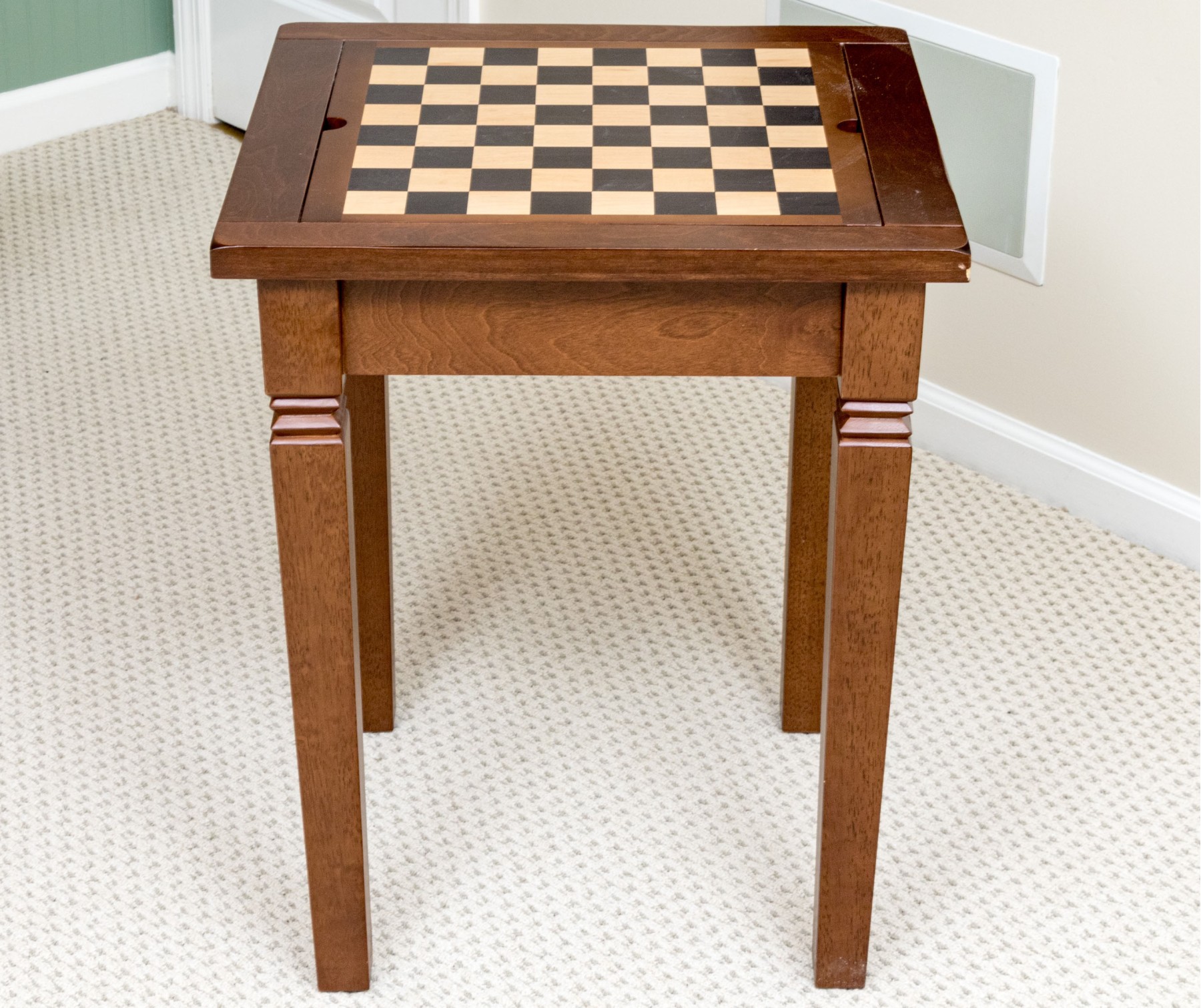 A handsome Pottery Barn games table in a warm medium brown finish. Features an inset table center with a chess/checkers lid opening to a recessed backgammon board. Simply detailed at the tops of tapered legs.
