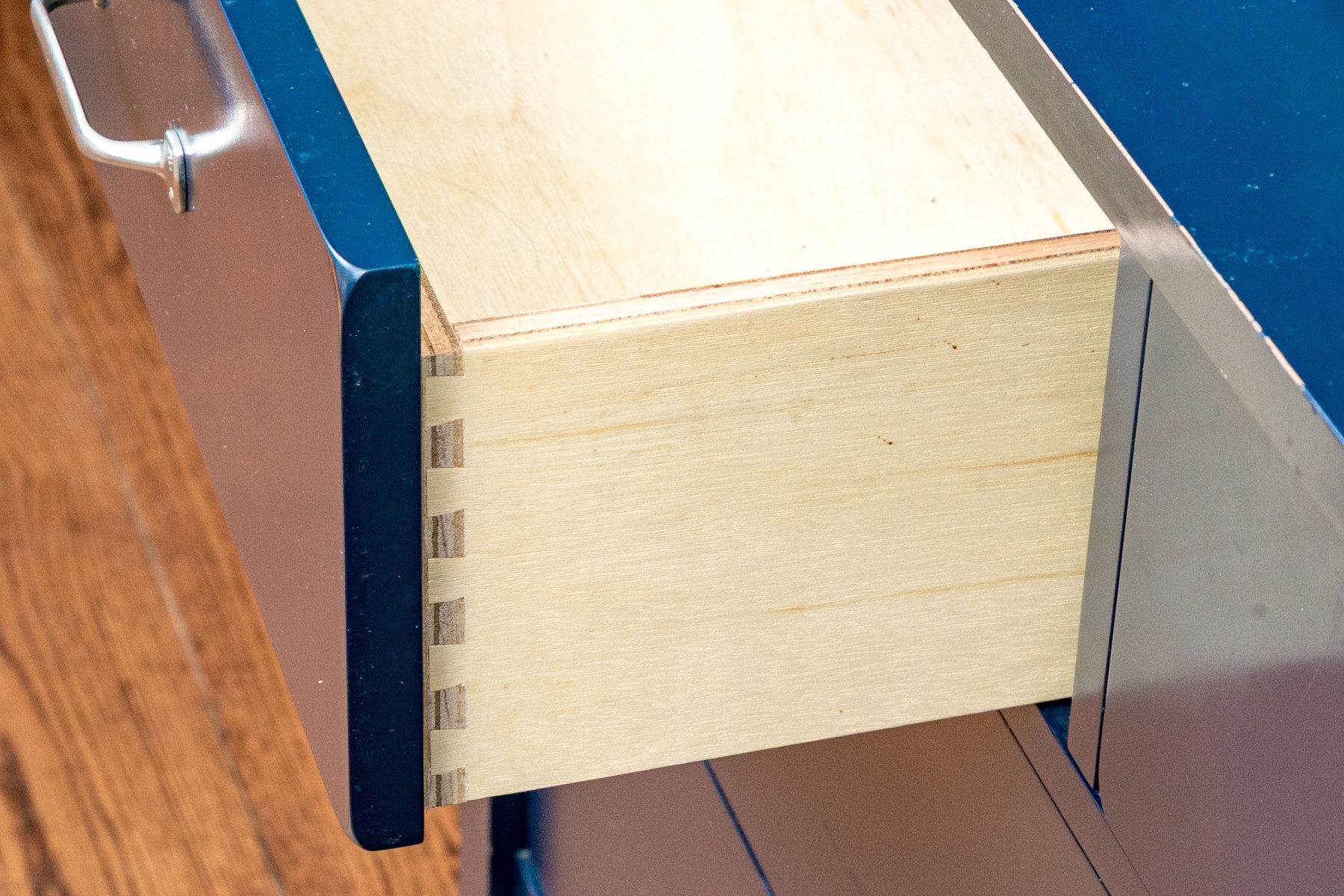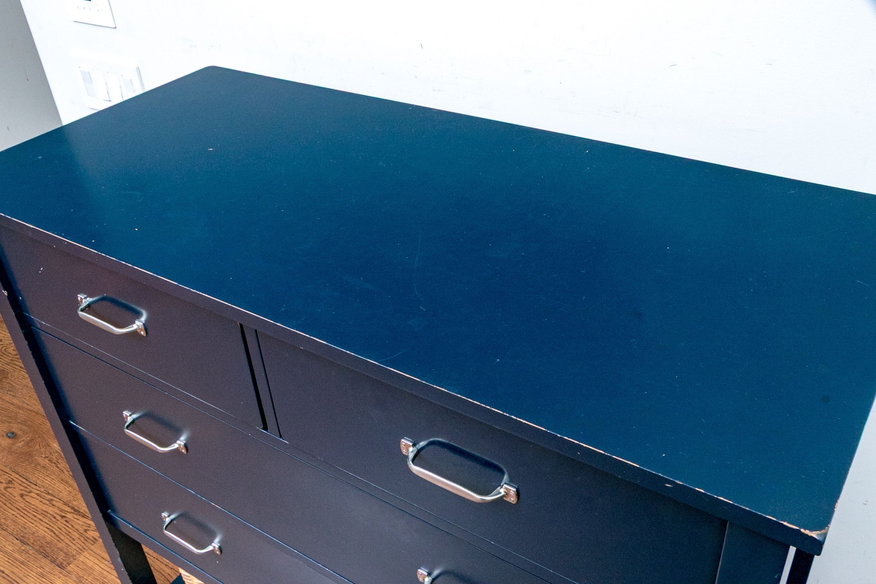 A delightful Pottery Barn Kids Camp dresser with great wonderful vibrant indigo blue finish in a transitional style with a strong sense of coastal charm.