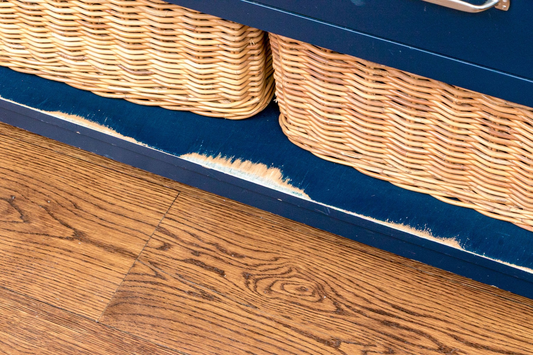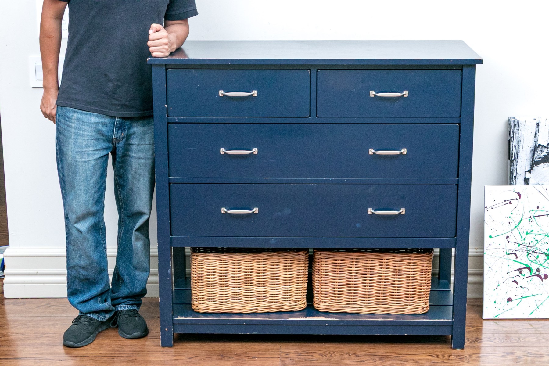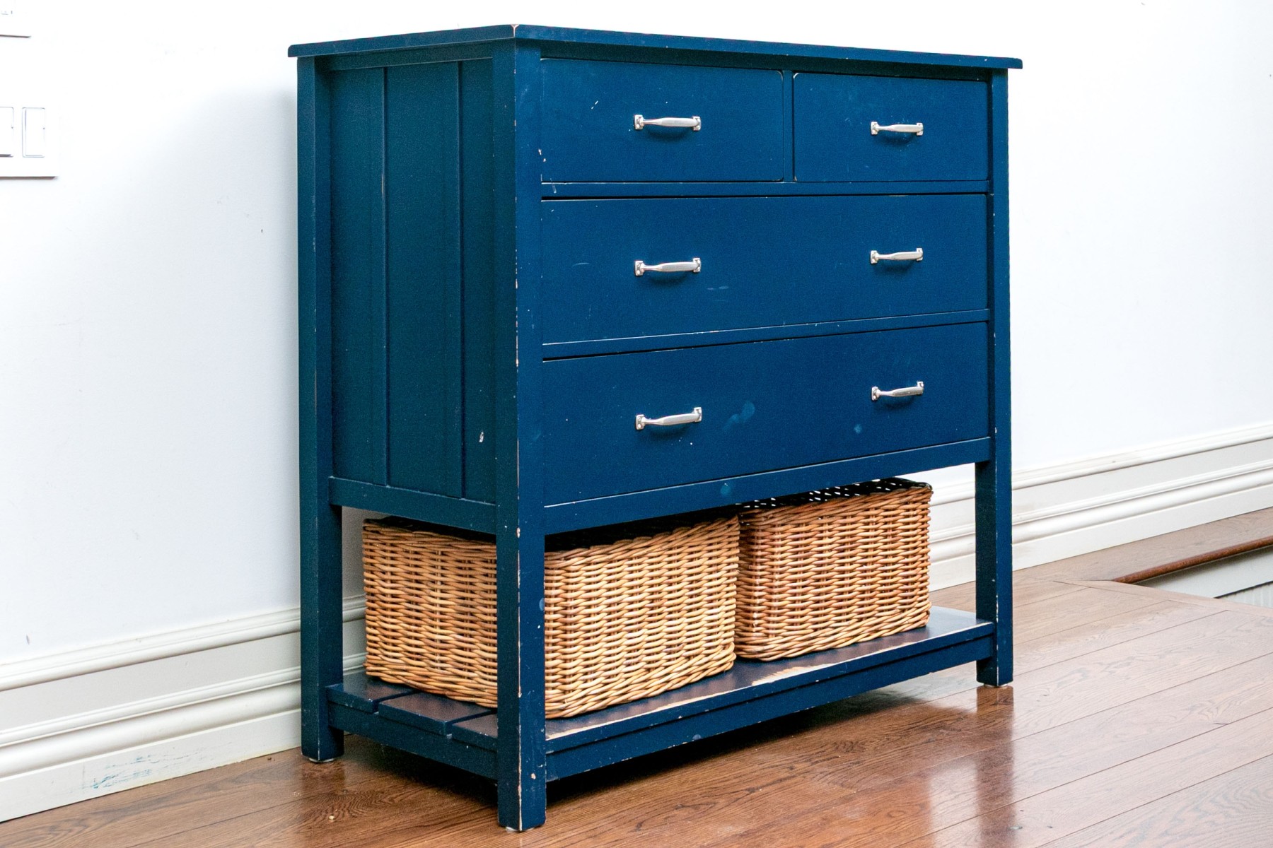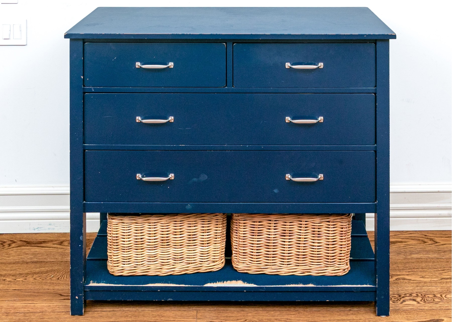 The chest features a two-over-two arrangement of drawers with nickel handles over a planked lower shelf with two wicker baskets.