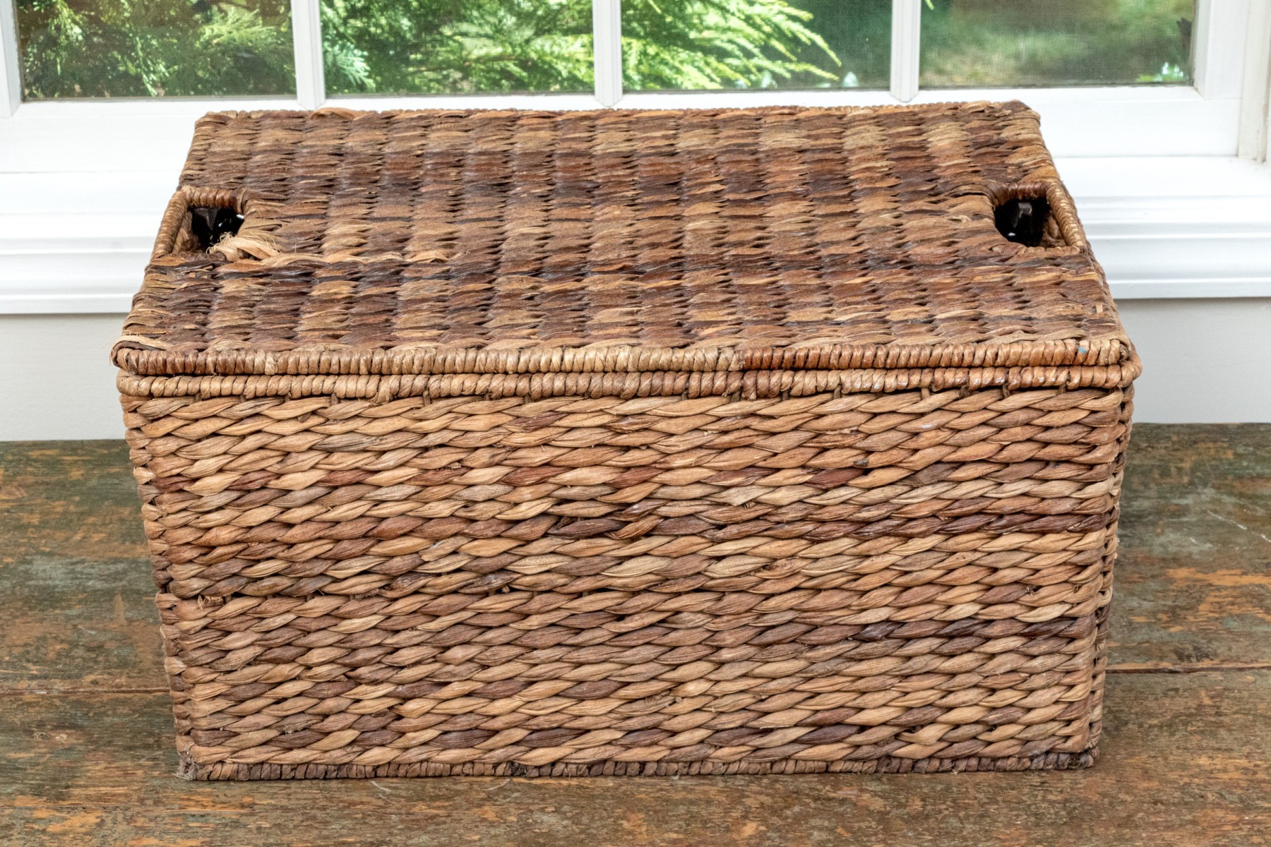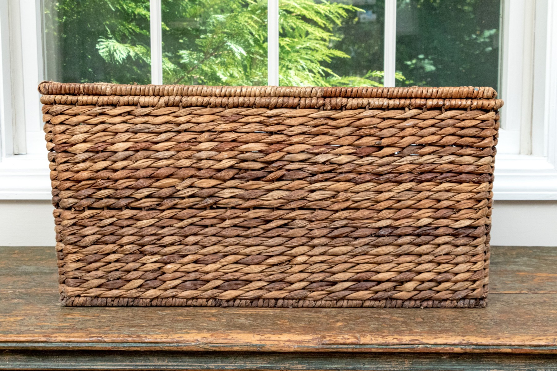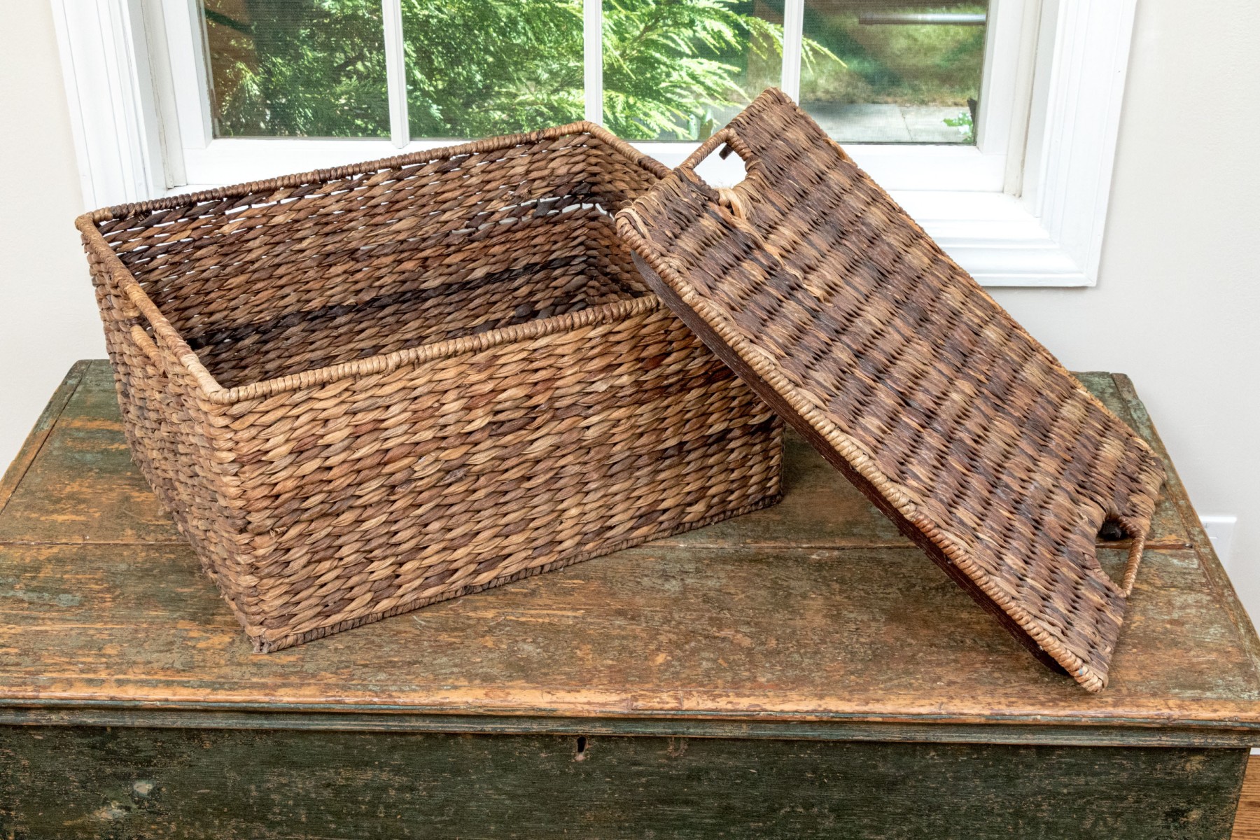 A delightful Pottery Barn "Savannah" handwoven seagrass storage basket featuring a lid with integrated handles and a rectangular body with integrated handles.