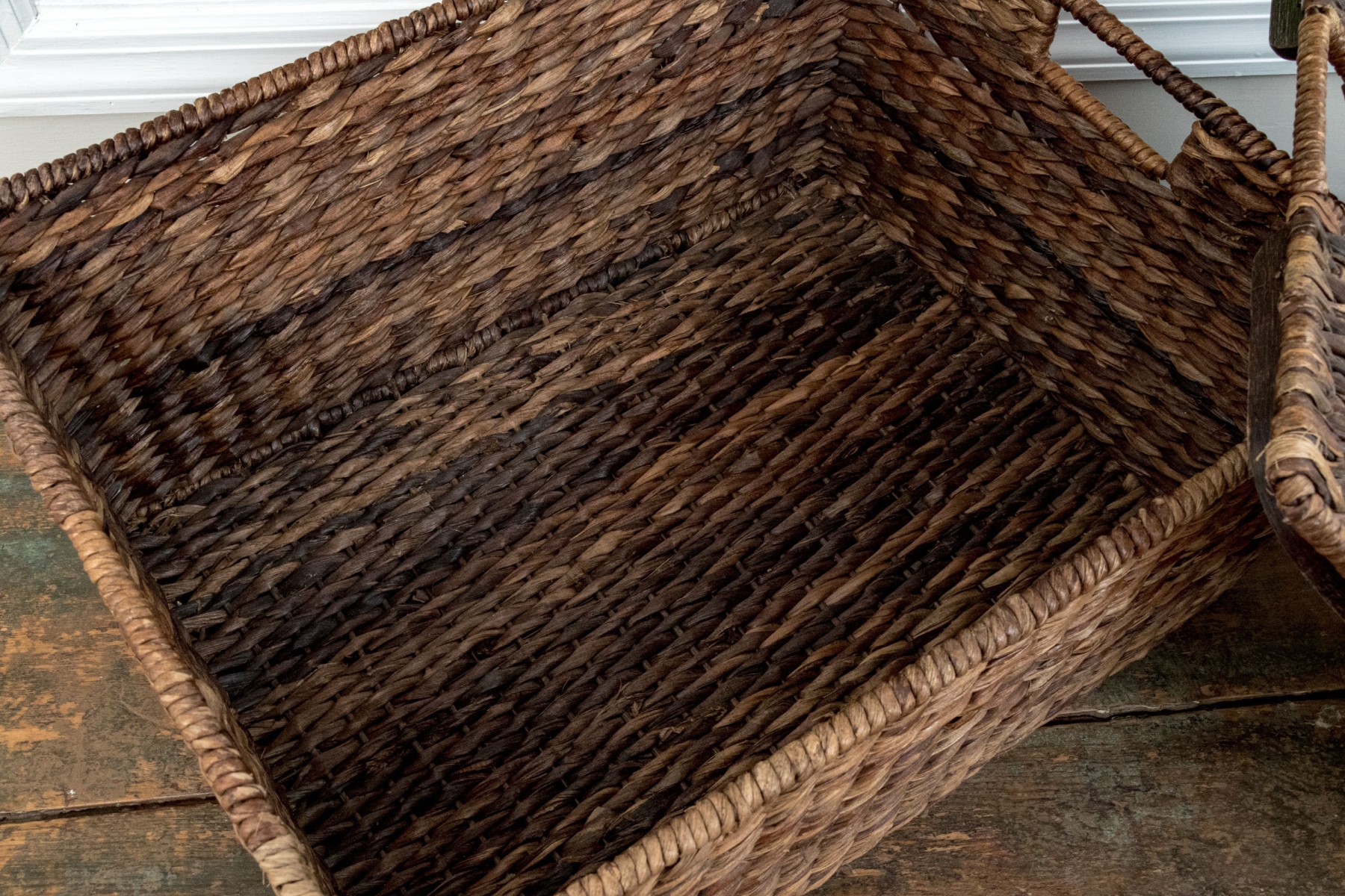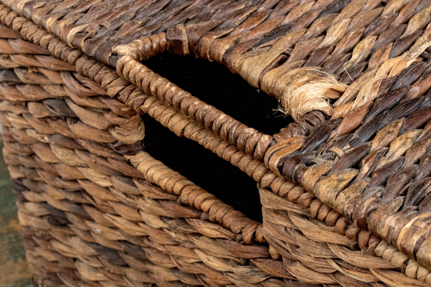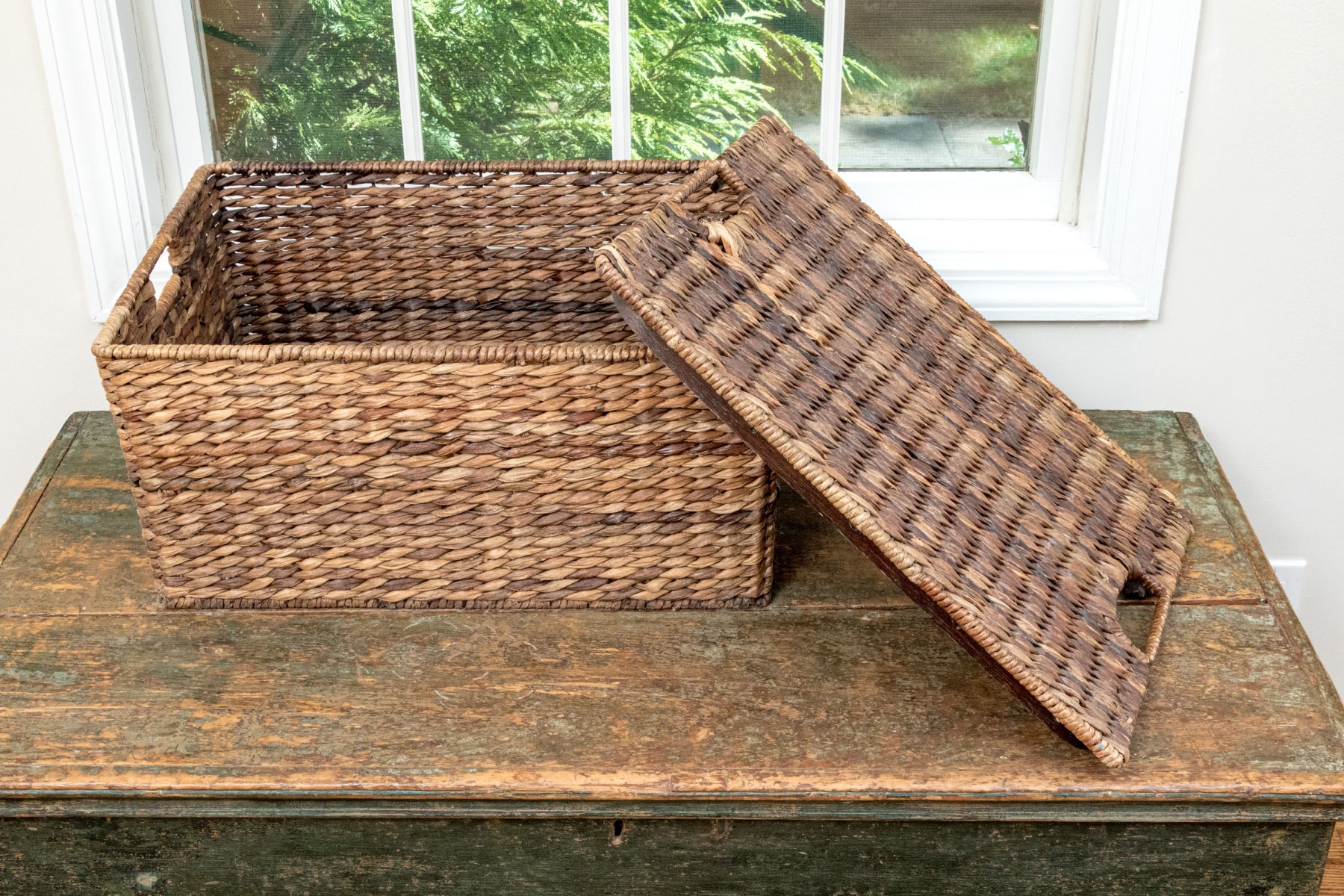 A delightful Pottery Barn "Savannah" handwoven seagrass storage basket featuring a lid with integrated handles and a rectangular body with integrated handles.