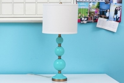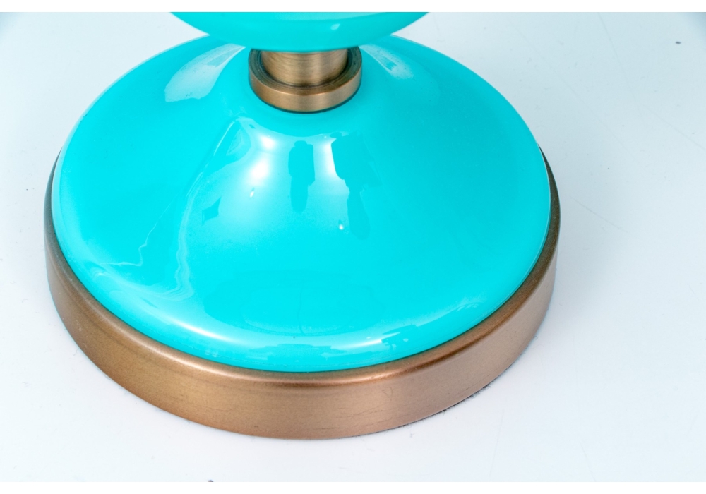 Turquoise blue graduated balls and brass tone metal form the standard and mounts. With a white fabric drum shade.
