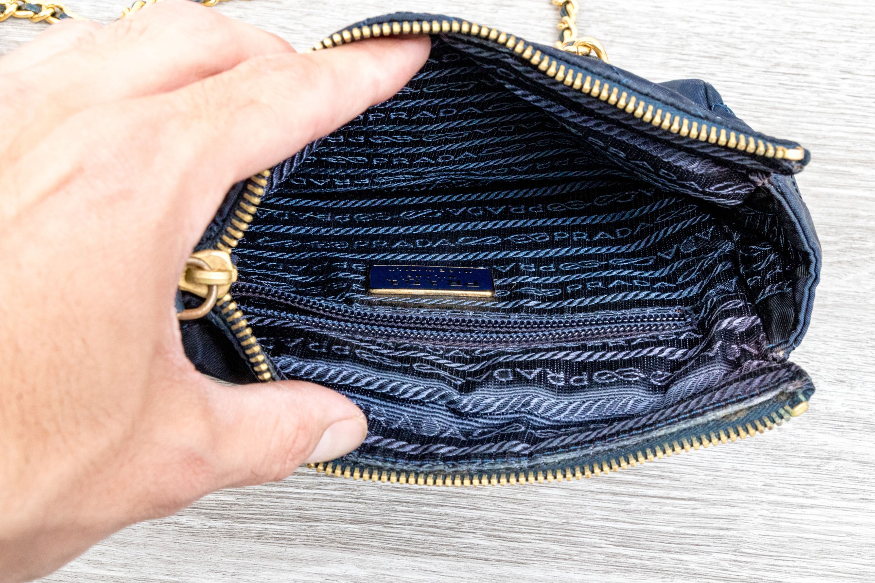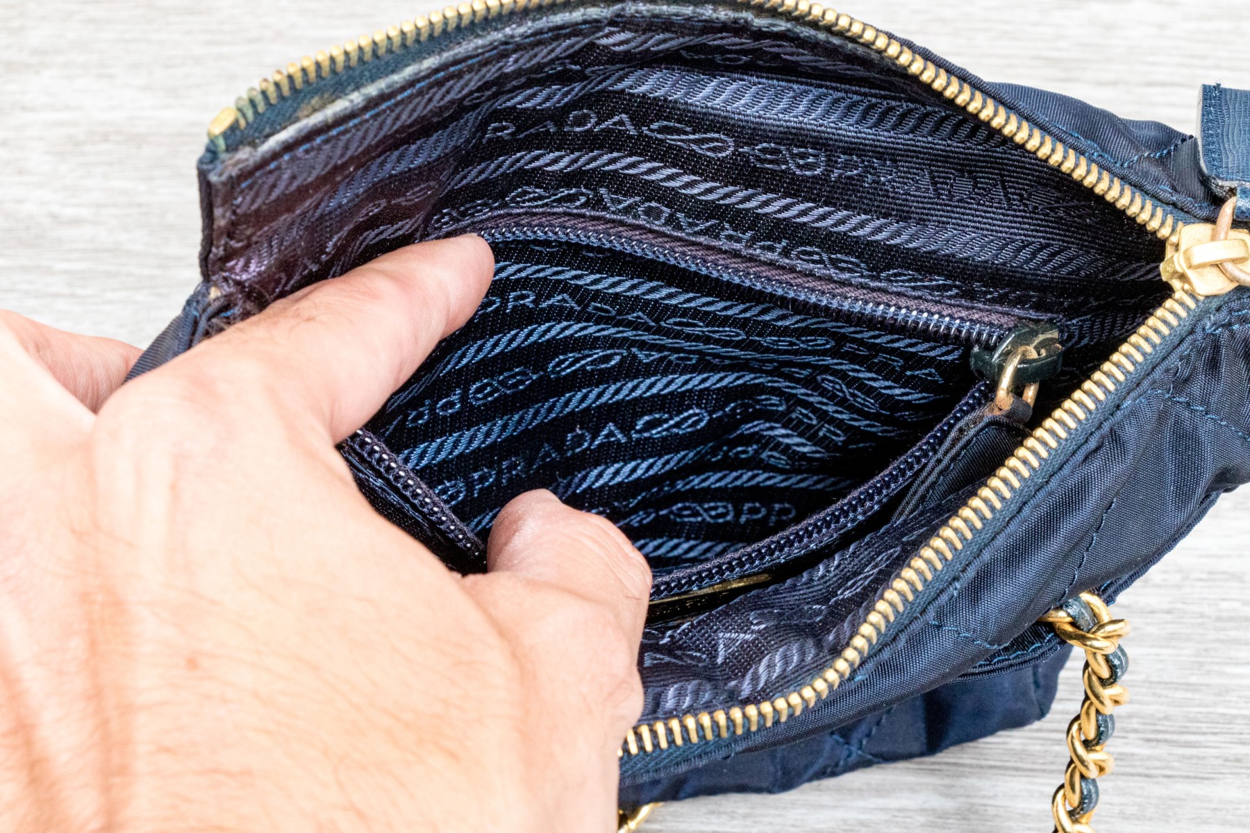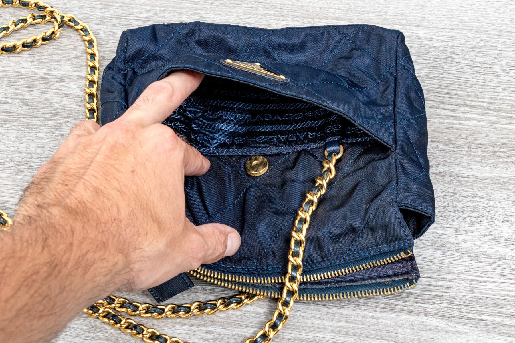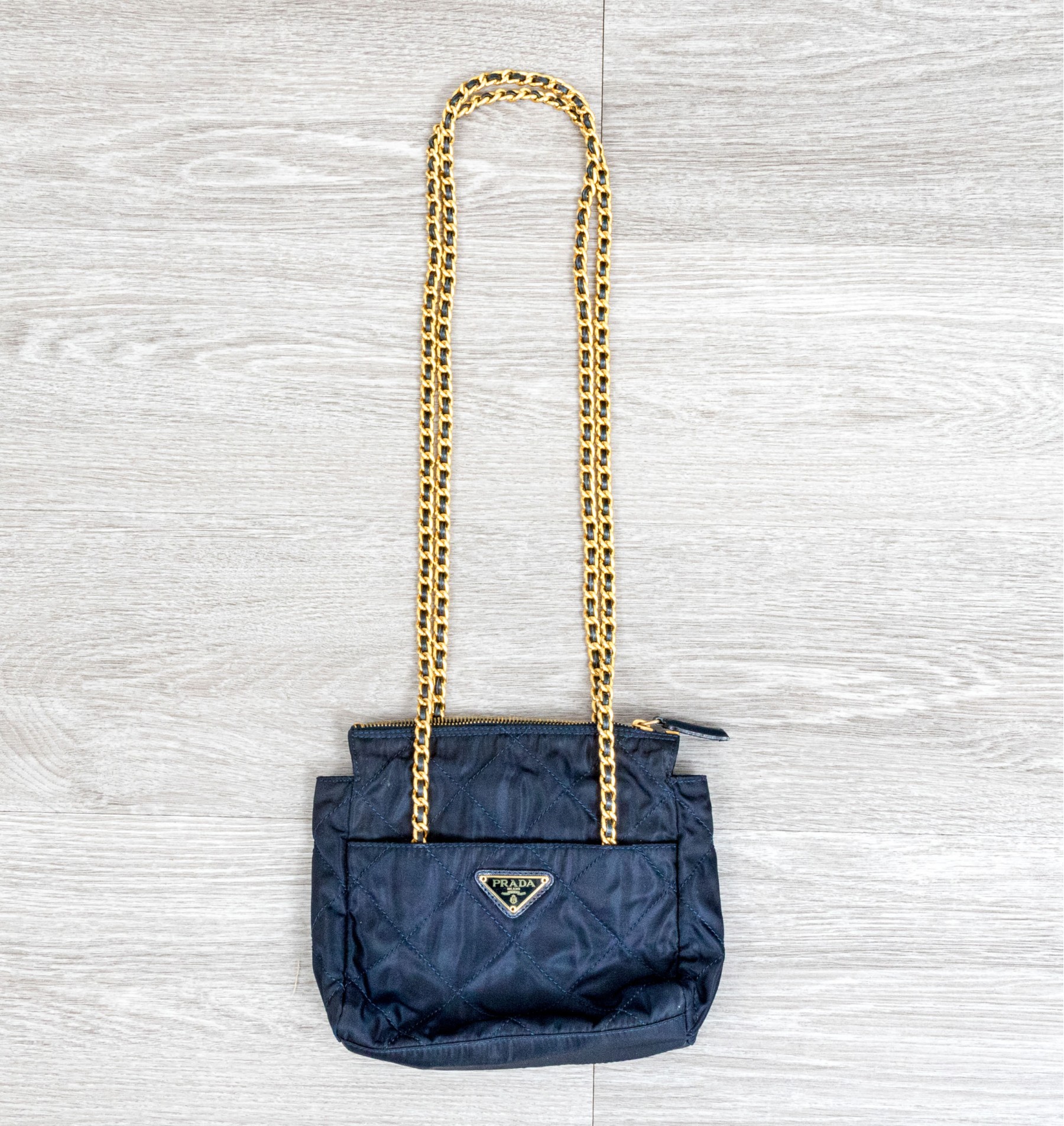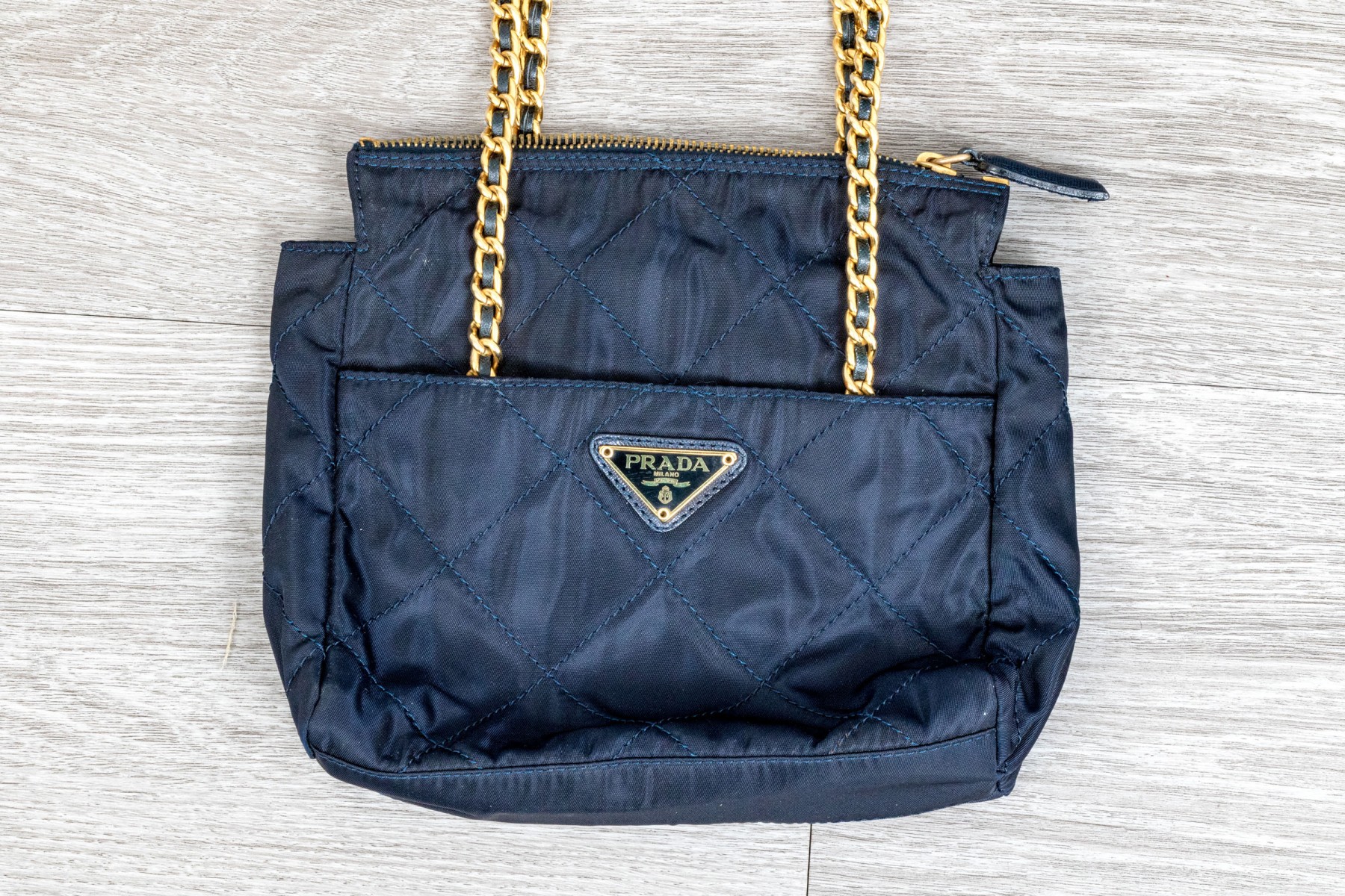 A stylish Prada shoulder bag in quilted blue nylon, sporting a large open exterior pocket, zipper closure, and zippered interior pocket. Finished with a chic chain strap threaded with a strip of navy blue leather.