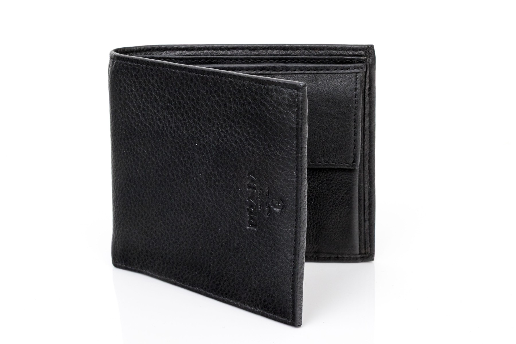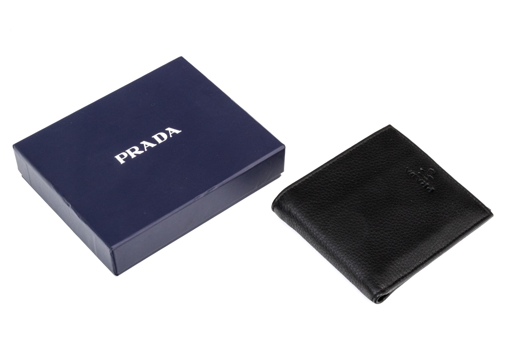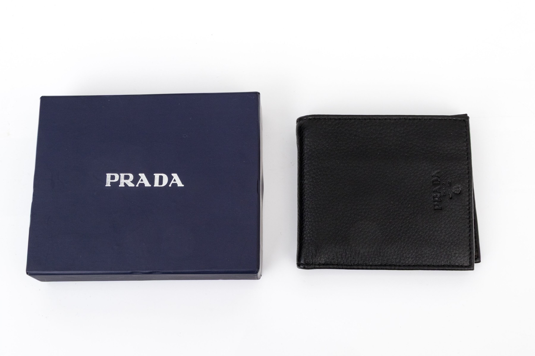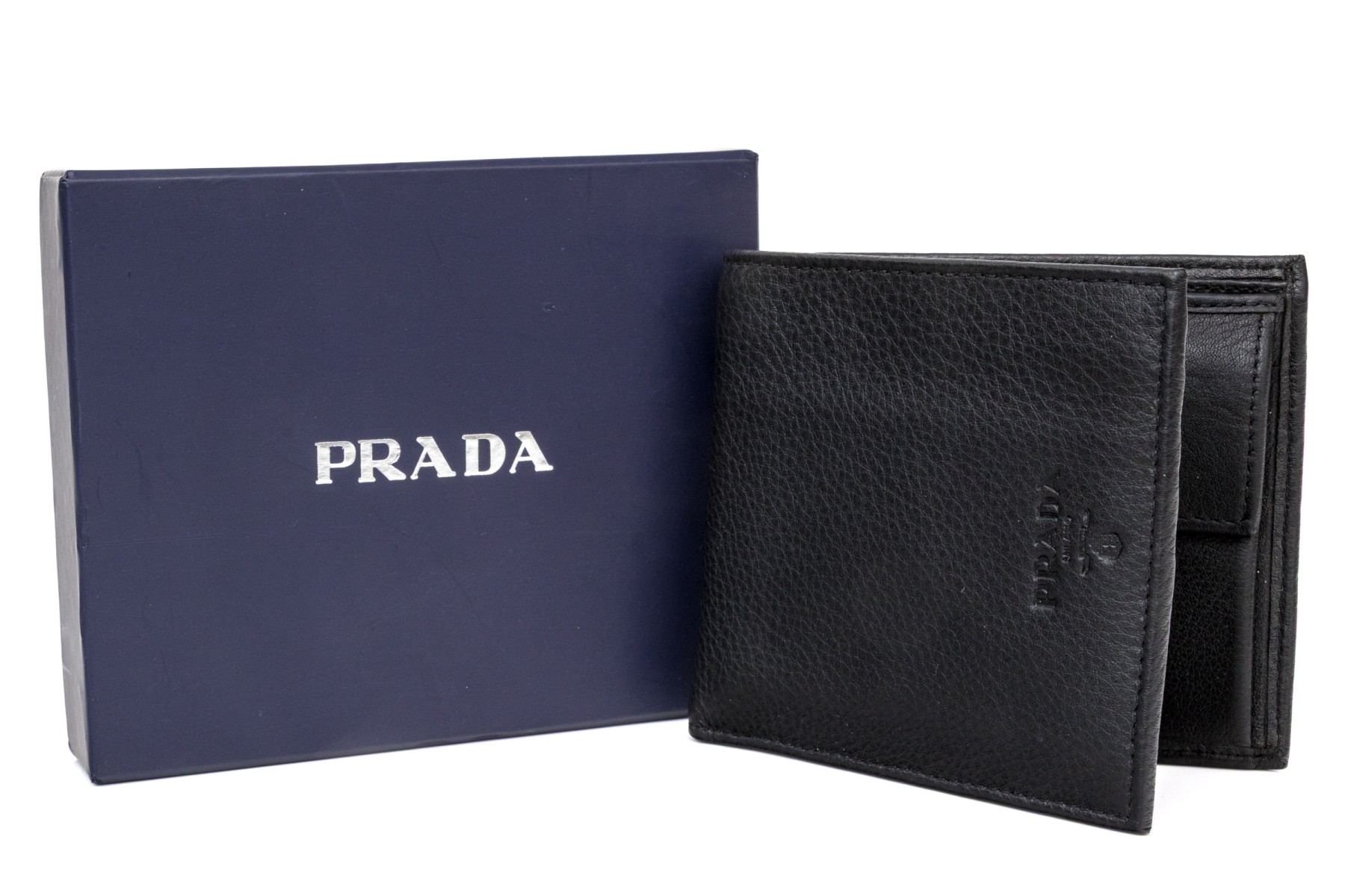 Prada handsome black leather billfold and credit card holder, with box