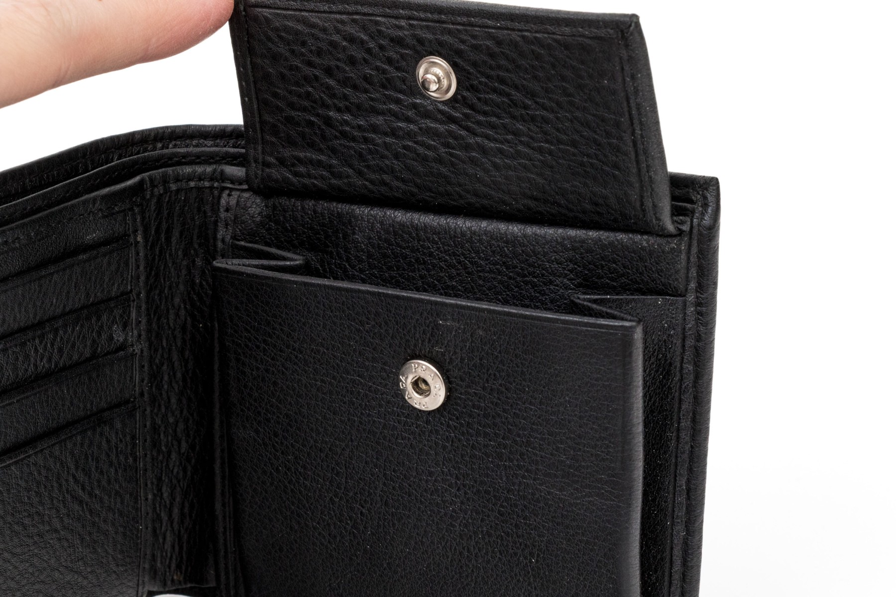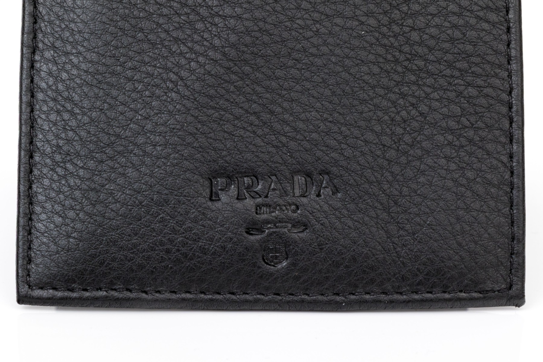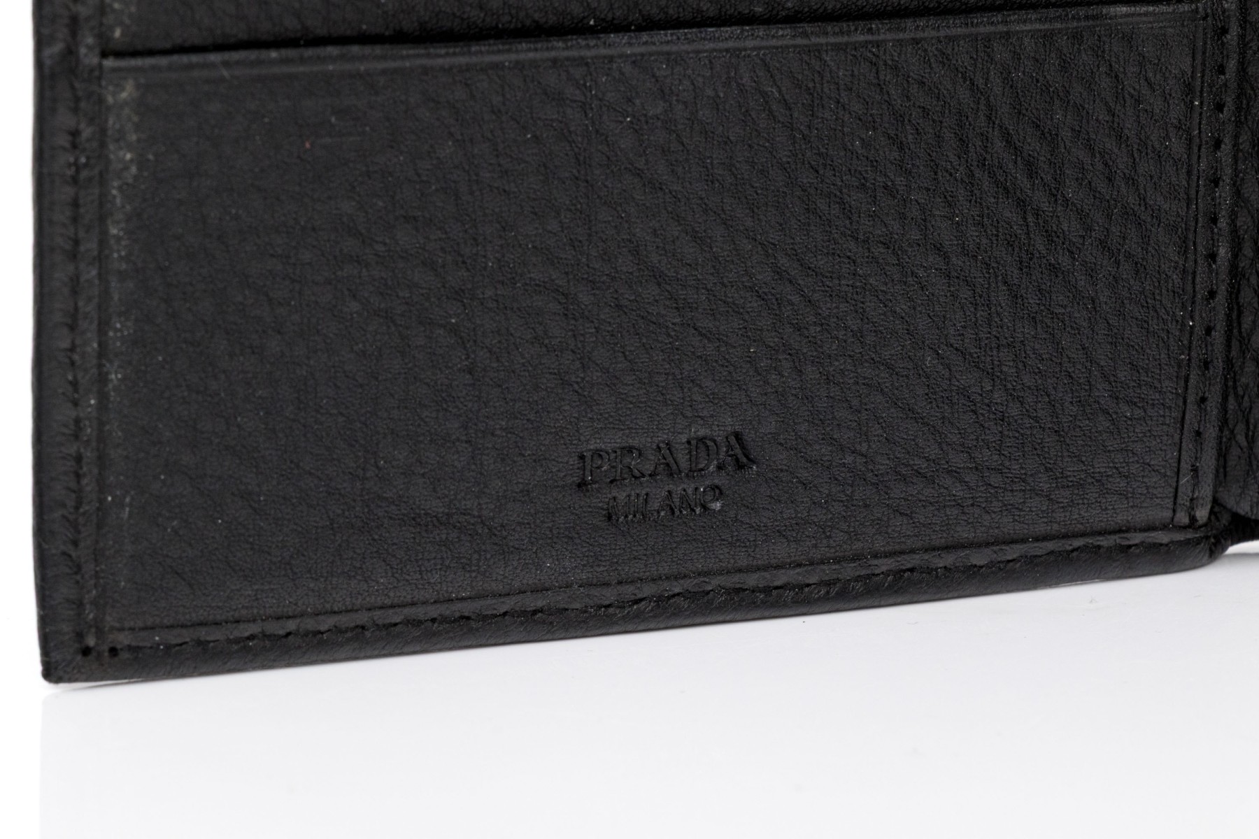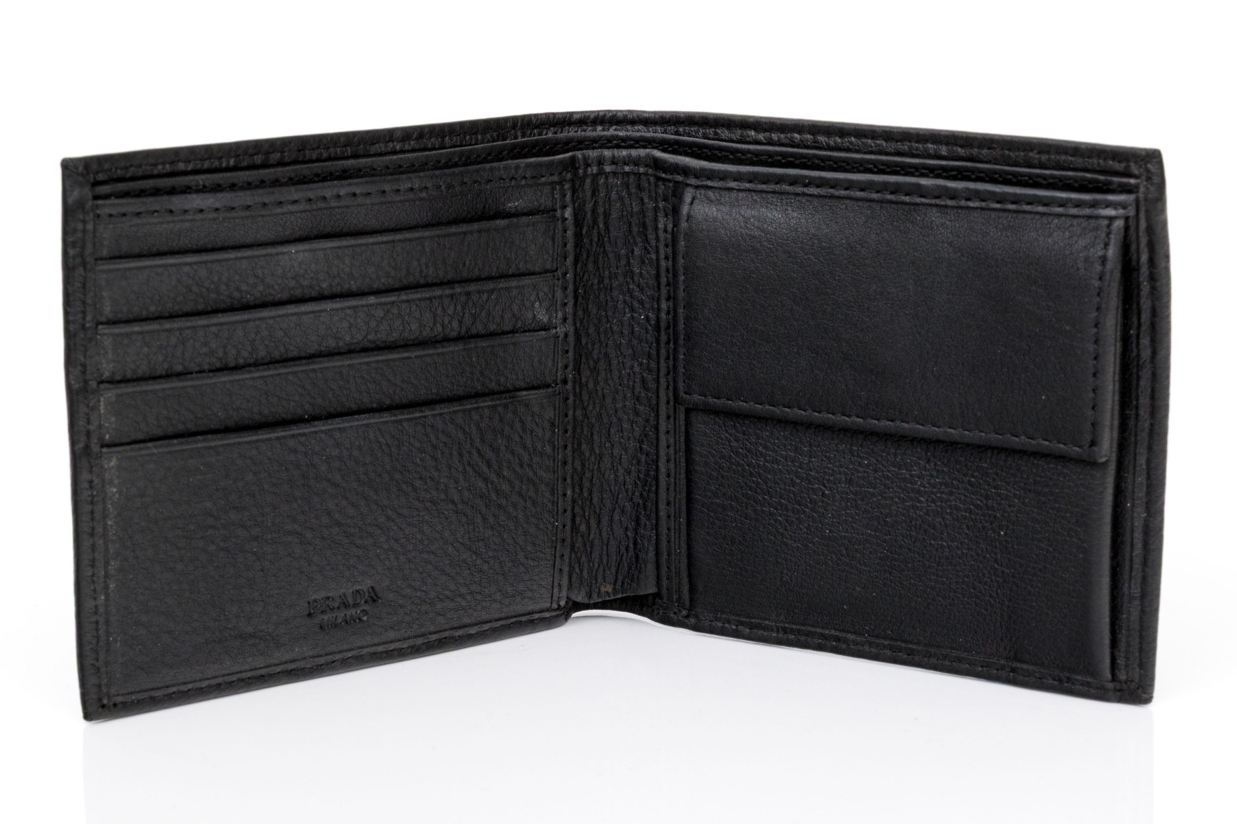 Prada handsome black leather billfold and credit card holder, with box