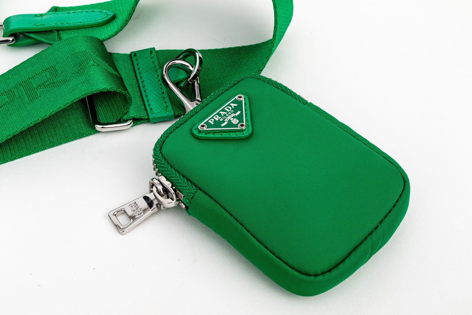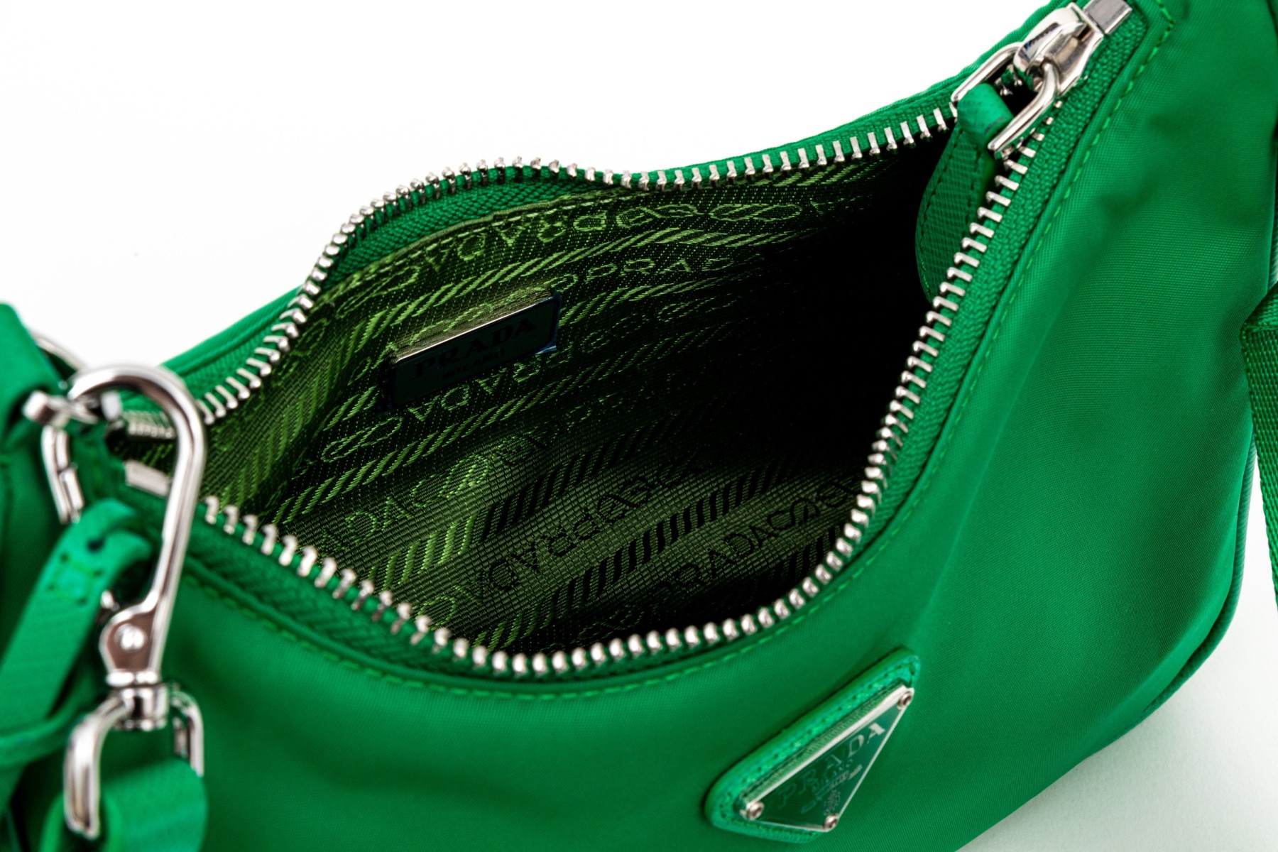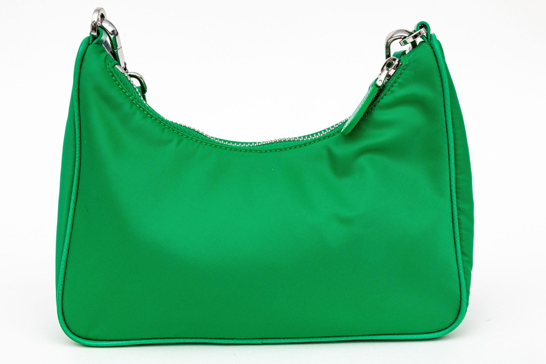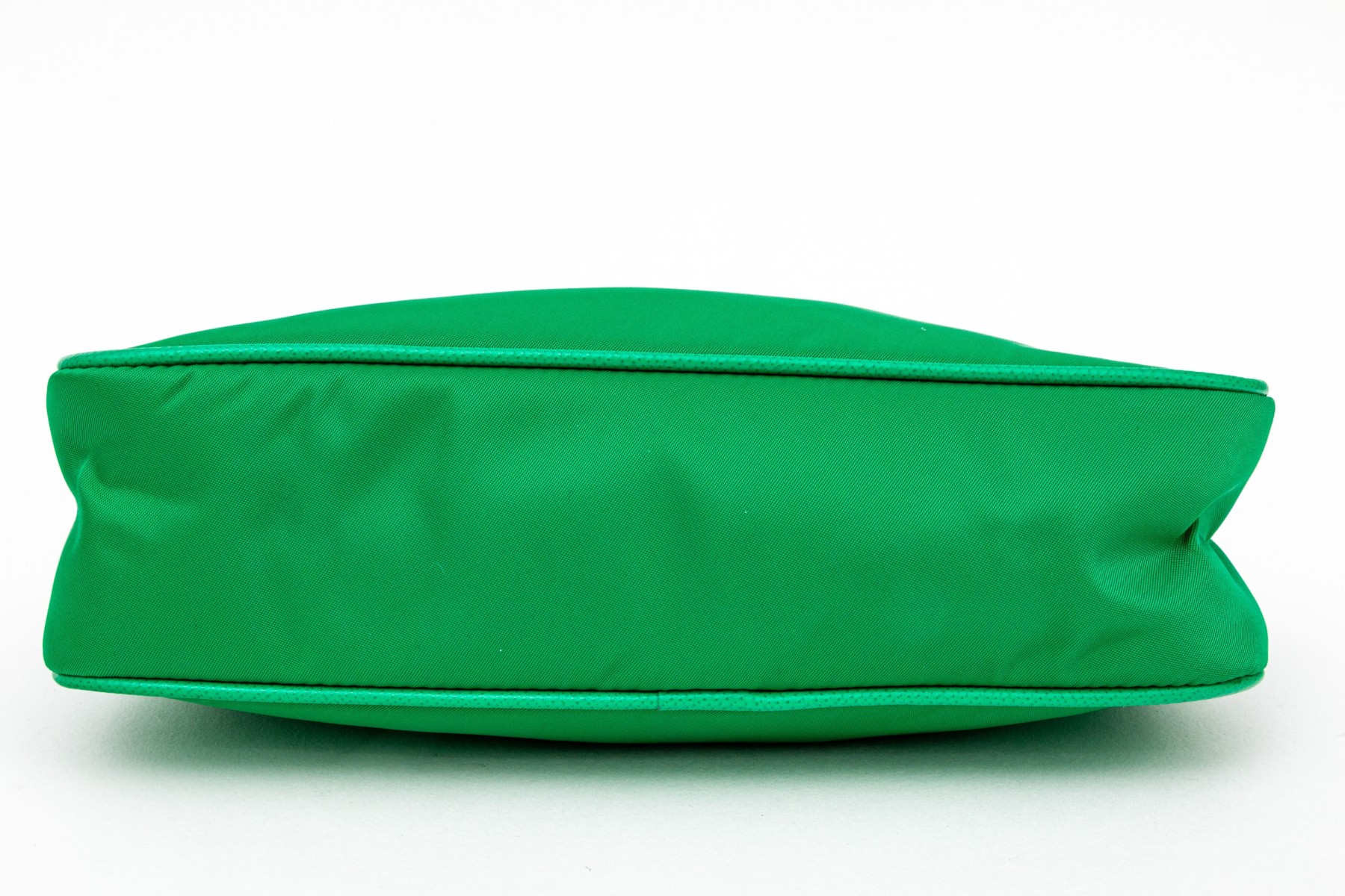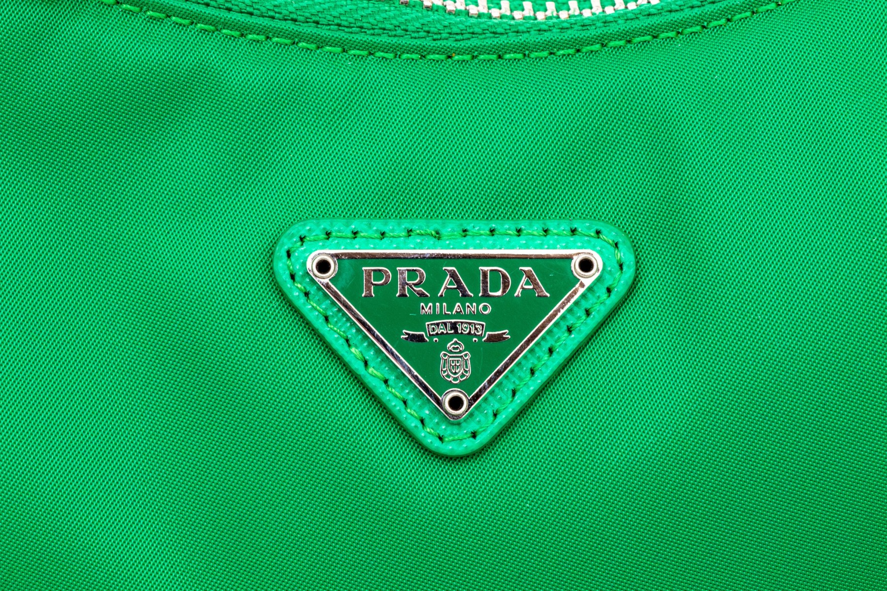 A fun green sporty nylon hobo silhouette with detachable, adjustable matching, webbing strap with "Prada" woven in the same color way.. Along with a detachable zippered mini pouch on the strap—perfect for small essentials like AirPods, keys, or other items you need to grab quickly. The hardware is silver-toned and the bag has the metal Prada triangle plaque affixed to the exterior.