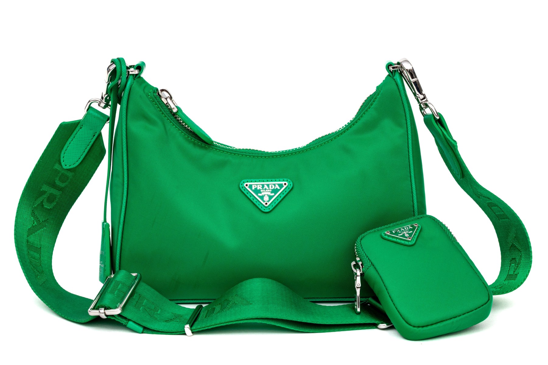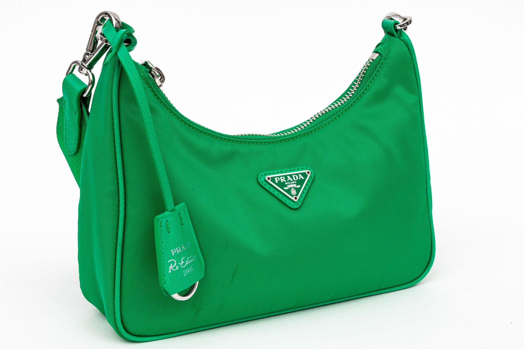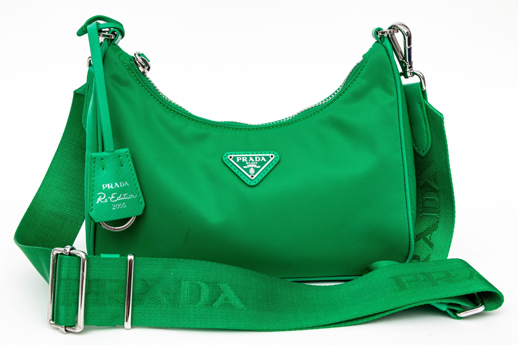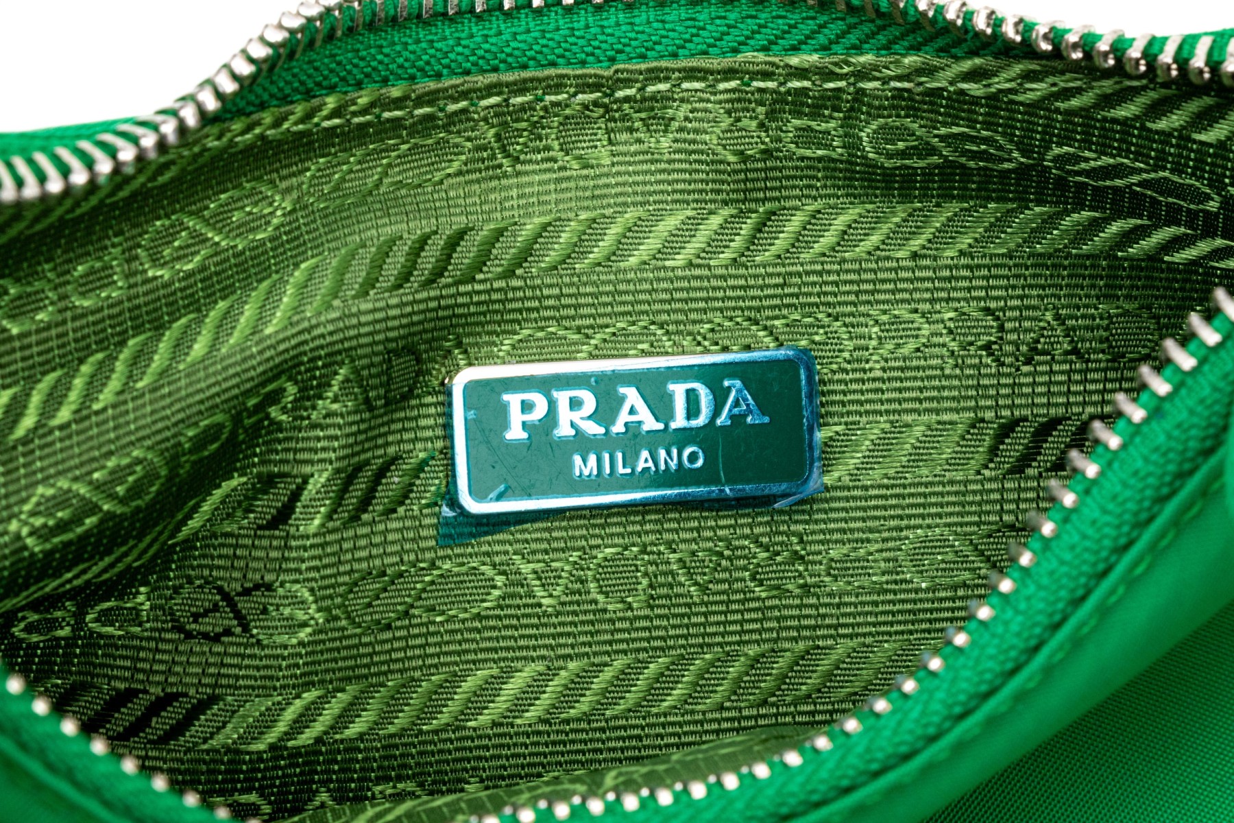 A fun green sporty nylon hobo silhouette with detachable, adjustable matching, webbing strap with "Prada" woven in the same color way.. Along with a detachable zippered mini pouch on the strap—perfect for small essentials like AirPods, keys, or other items you need to grab quickly. The hardware is silver-toned and the bag has the metal Prada triangle plaque affixed to the exterior.