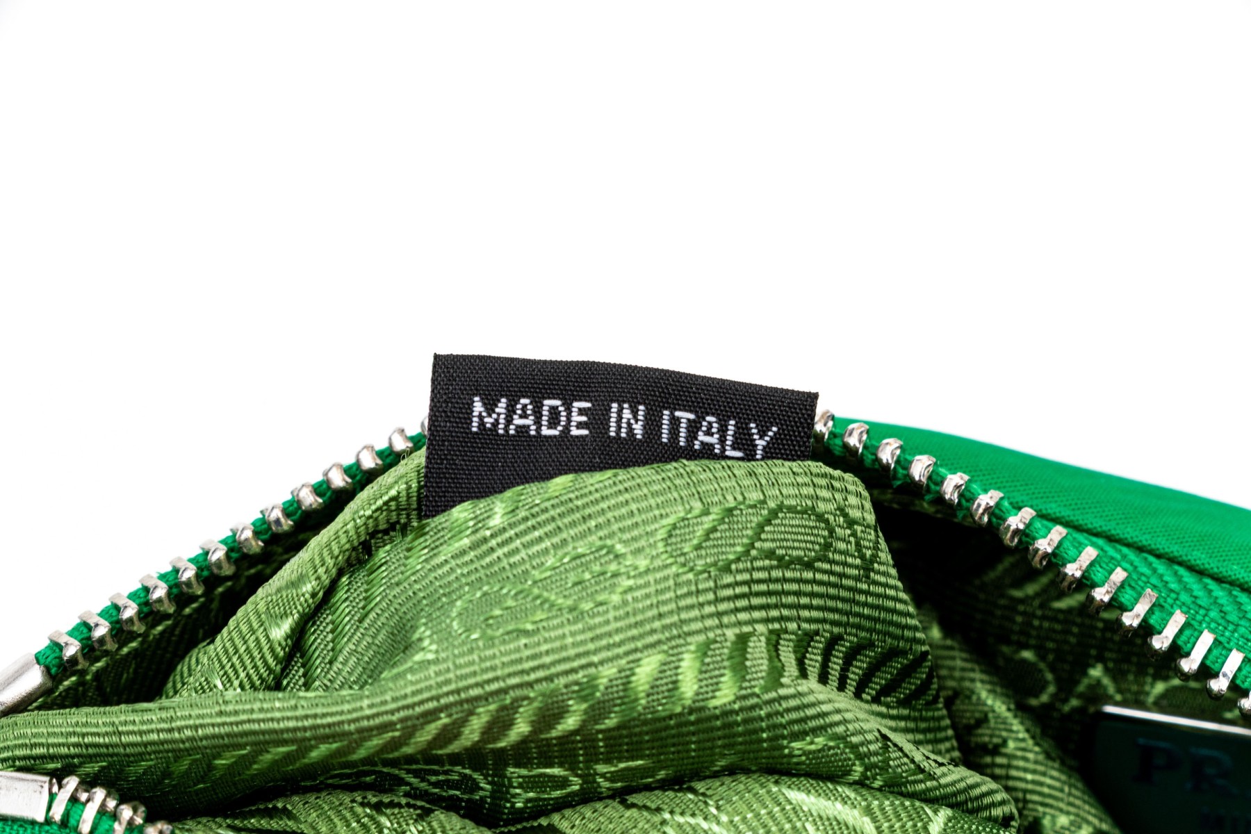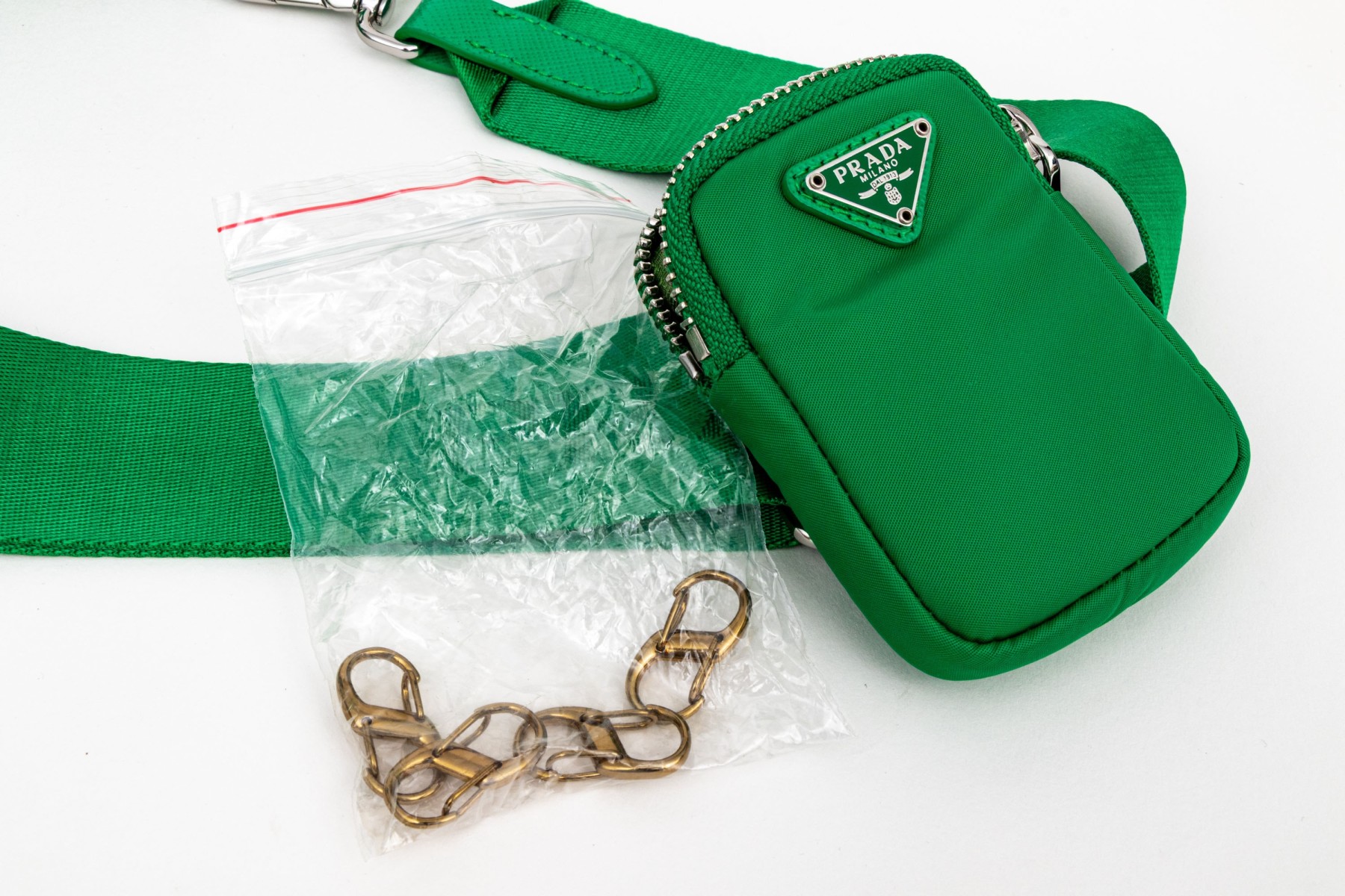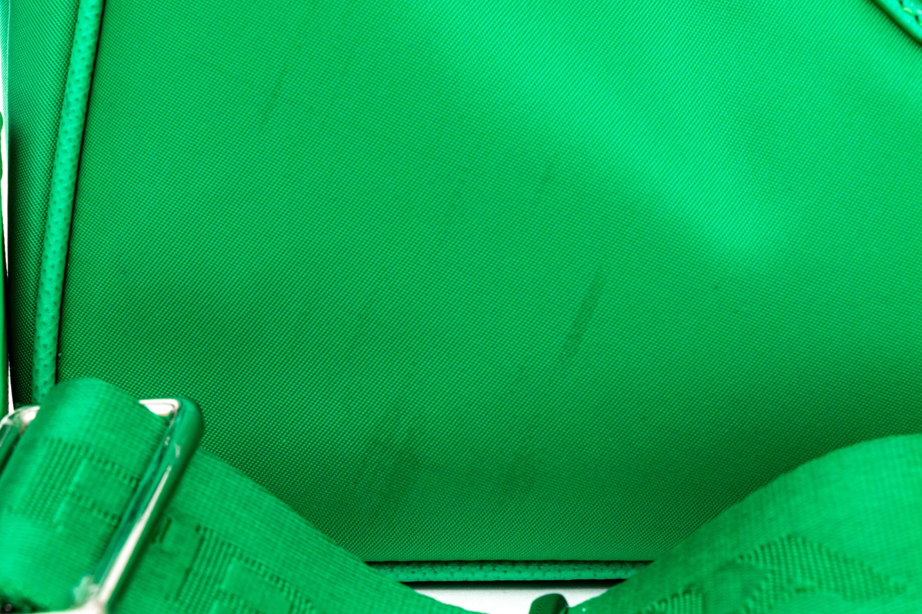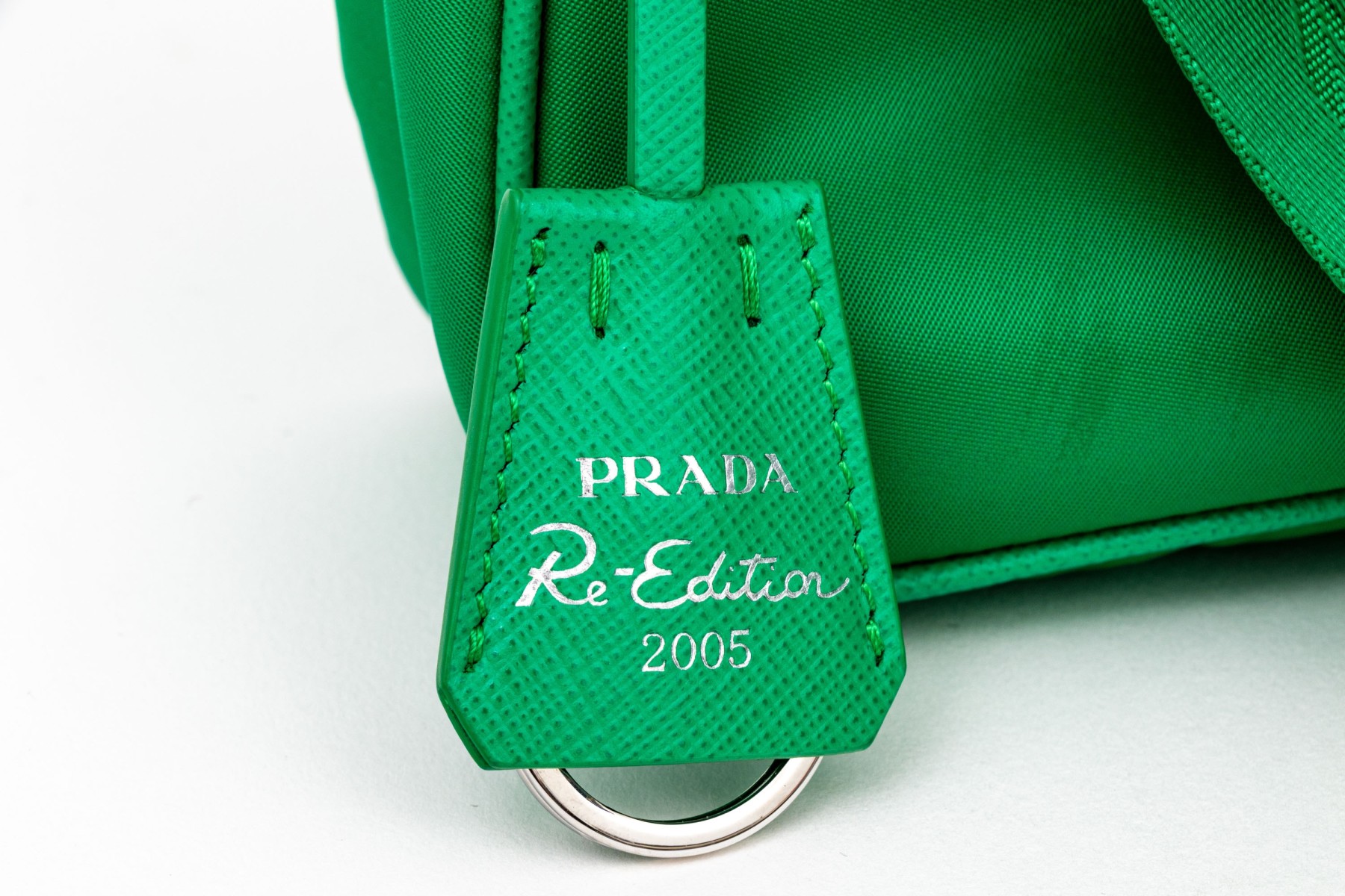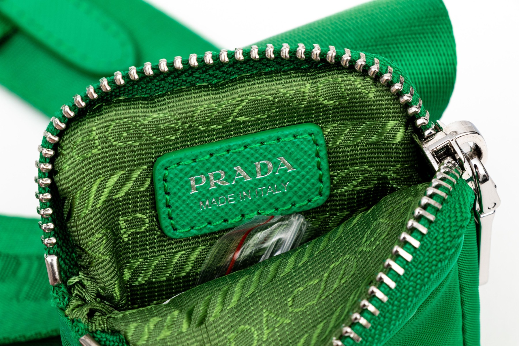 A fun green sporty nylon hobo silhouette with detachable, adjustable matching, webbing strap with "Prada" woven in the same color way.. Along with a detachable zippered mini pouch on the strap—perfect for small essentials like AirPods, keys, or other items you need to grab quickly. The hardware is silver-toned and the bag has the metal Prada triangle plaque affixed to the exterior.