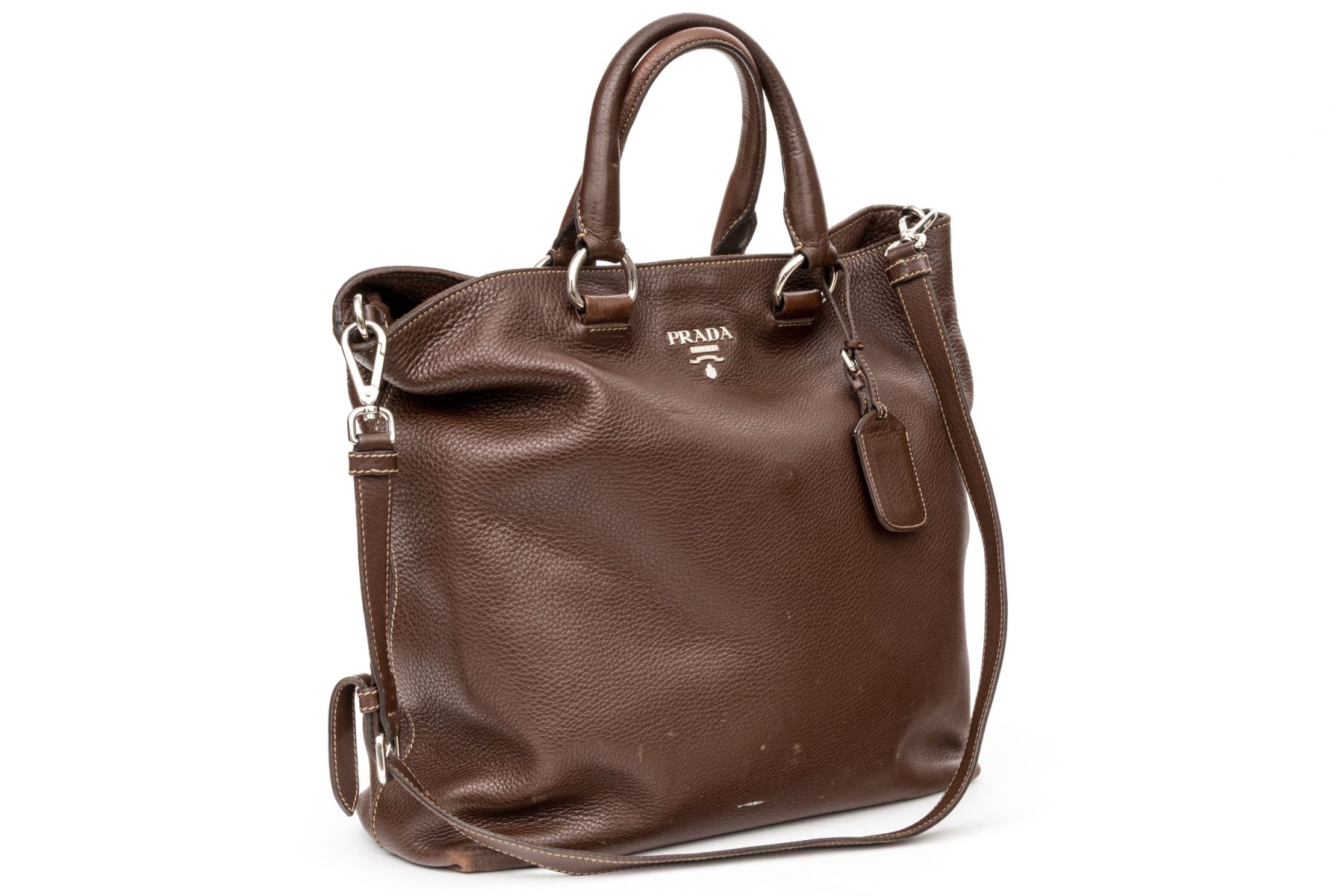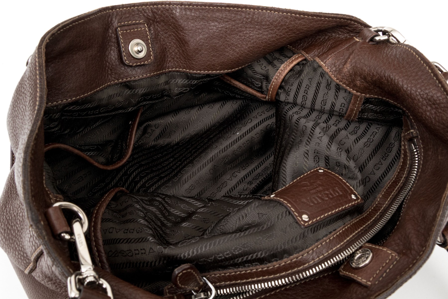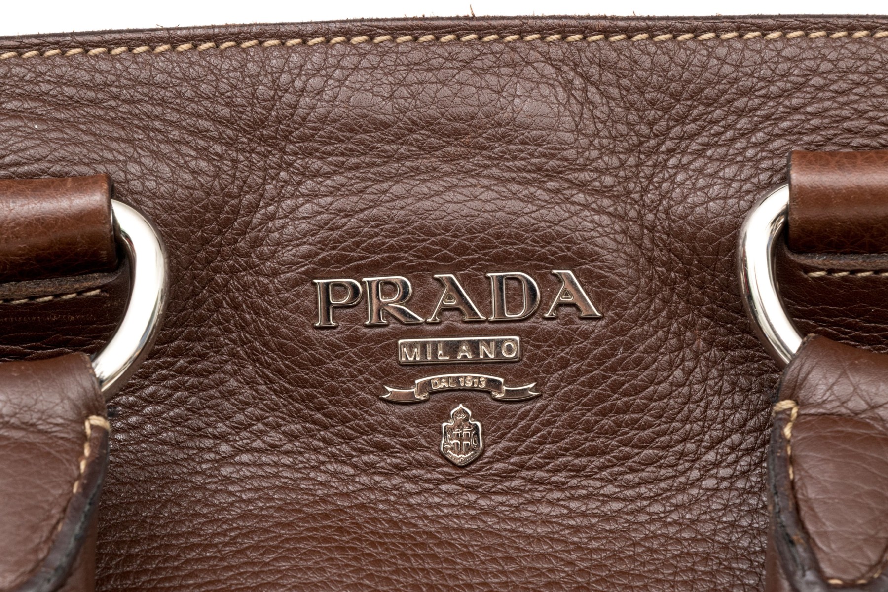 Brown pebbled marrone calfskin leather Prada Vitello Daino tote bag with silver-tone hardware, dual rolled top handles, detachable and adjustable shoulder strap, logo stamp at front, luggage tag, and zip closure at top. Interior is lined in black logo fabric with one zip pocket and one slip pocket.
