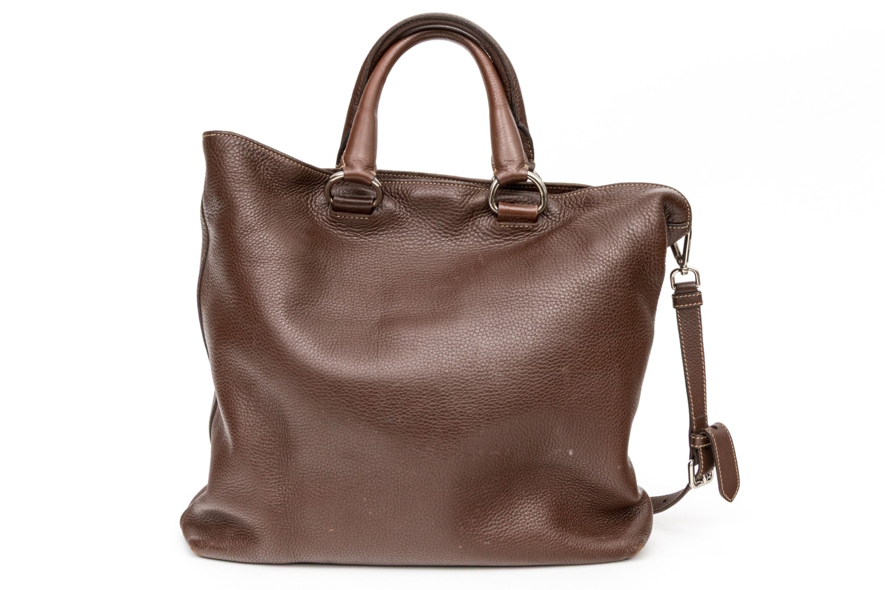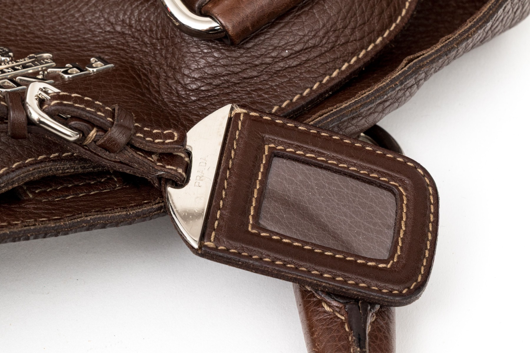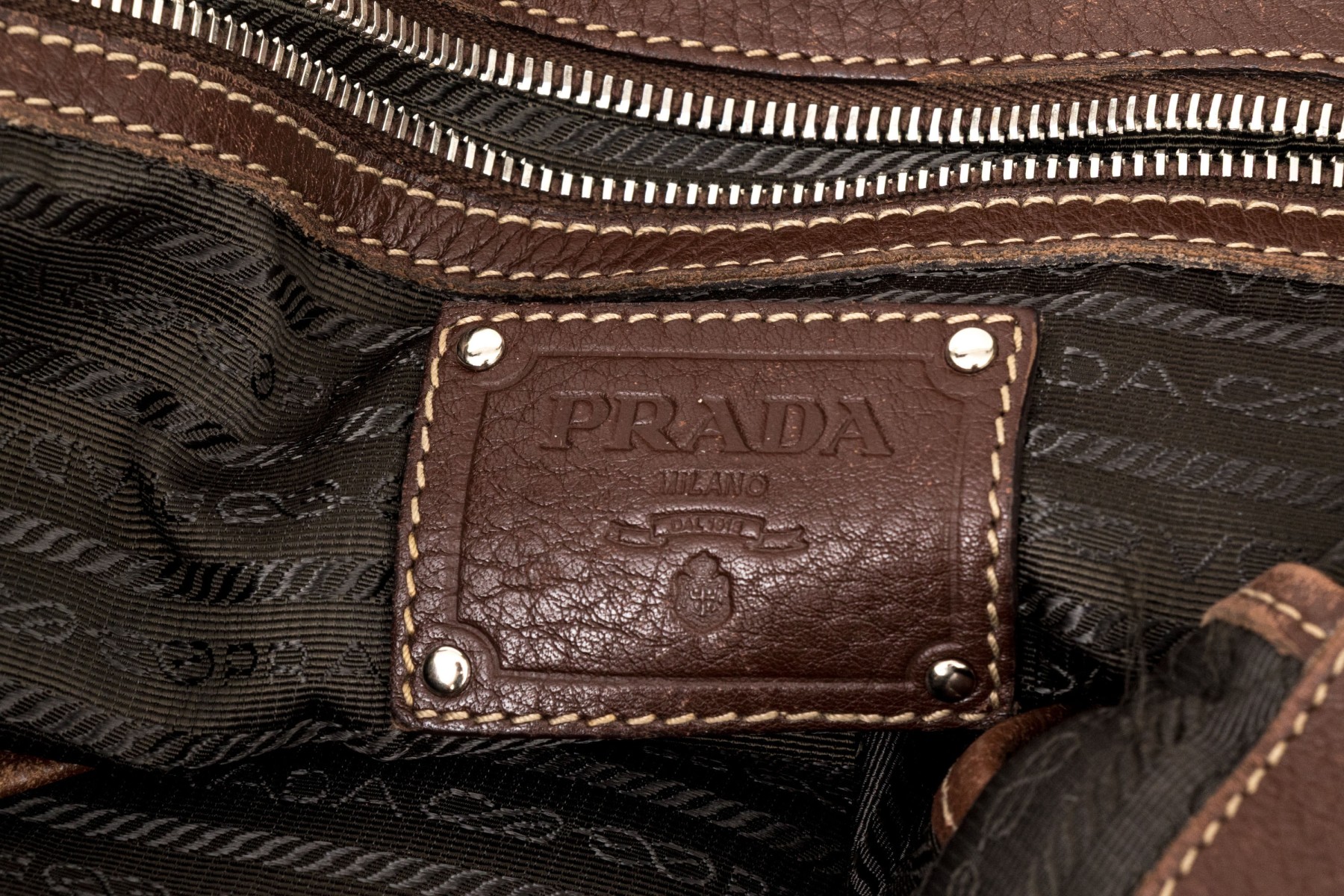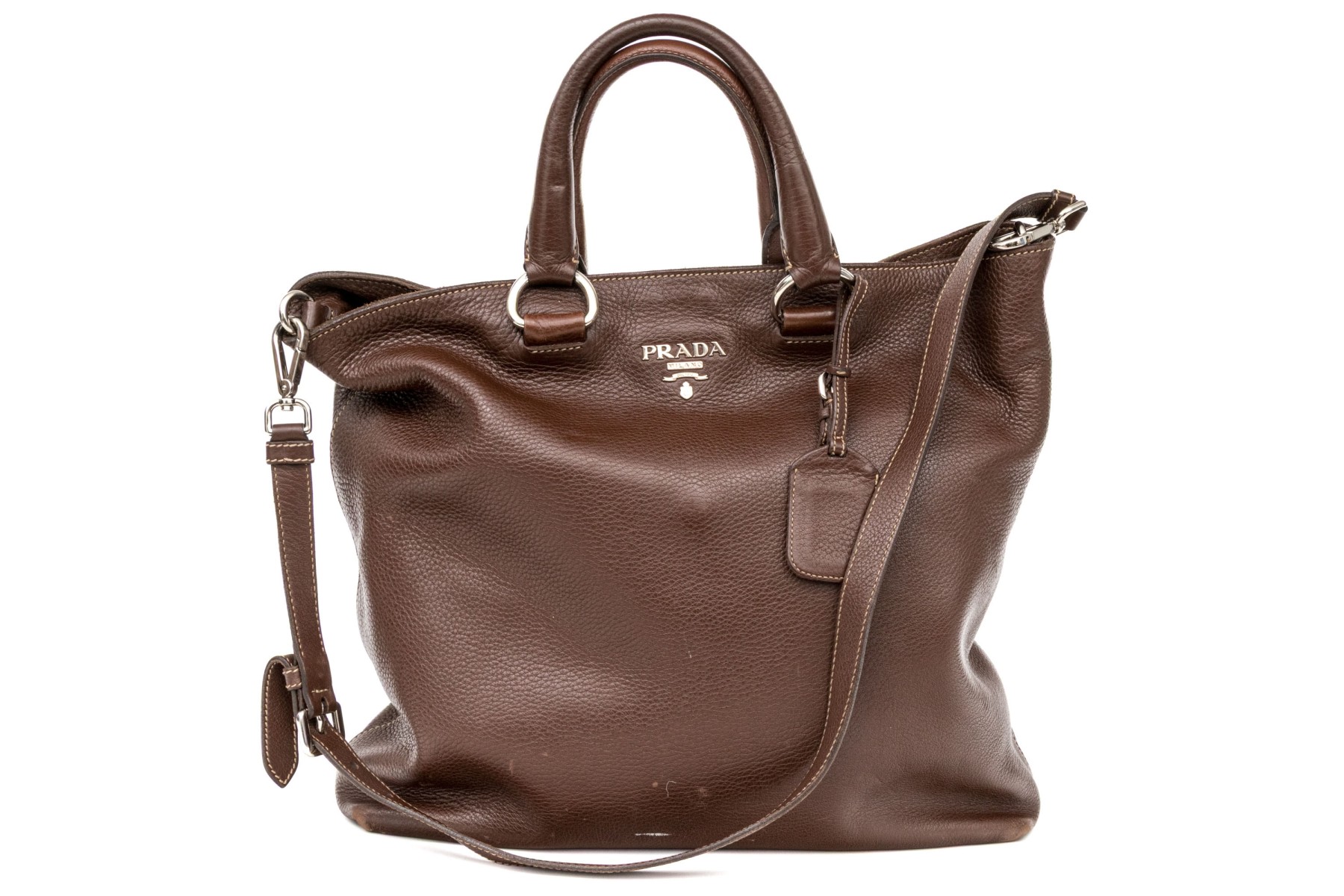 Brown pebbled marrone calfskin leather Prada Vitello Daino tote bag with silver-tone hardware, dual rolled top handles, detachable and adjustable shoulder strap, logo stamp at front, luggage tag, and zip closure at top. Interior is lined in black logo fabric with one zip pocket and one slip pocket.