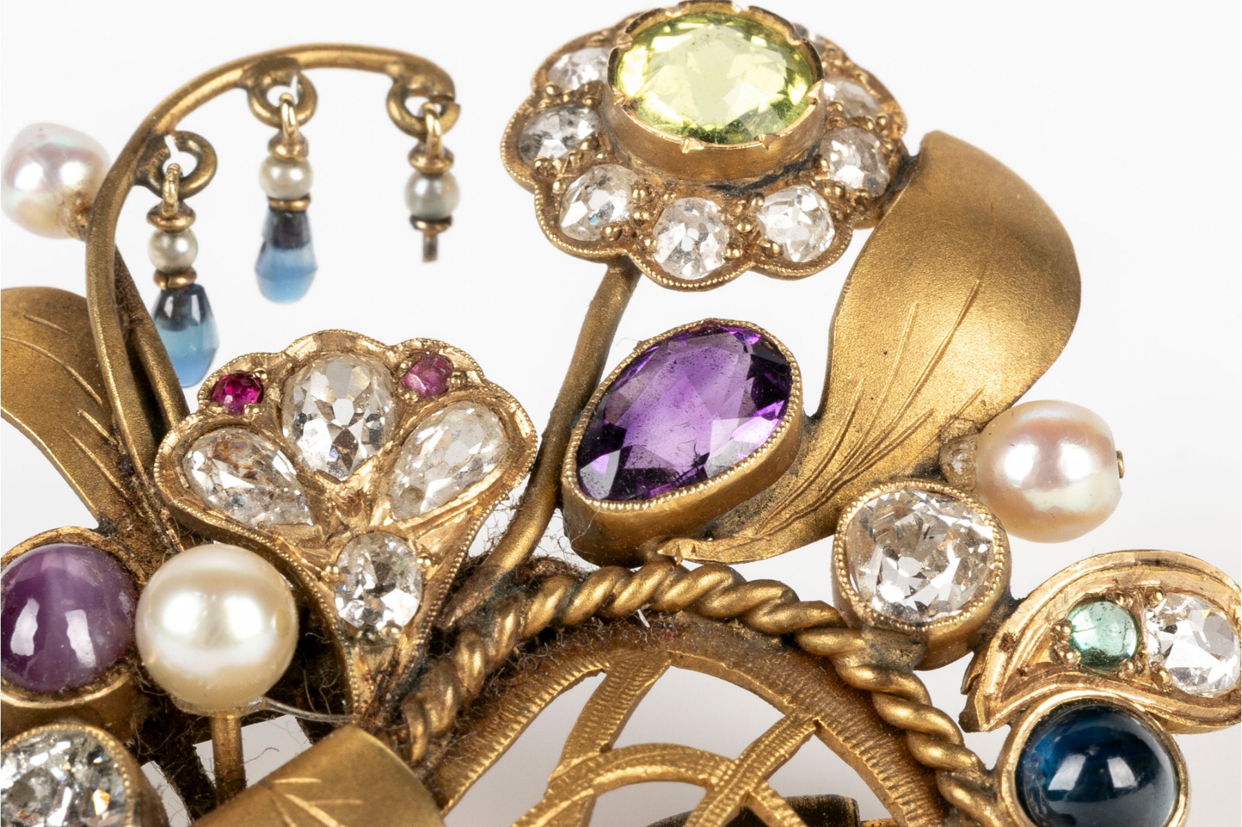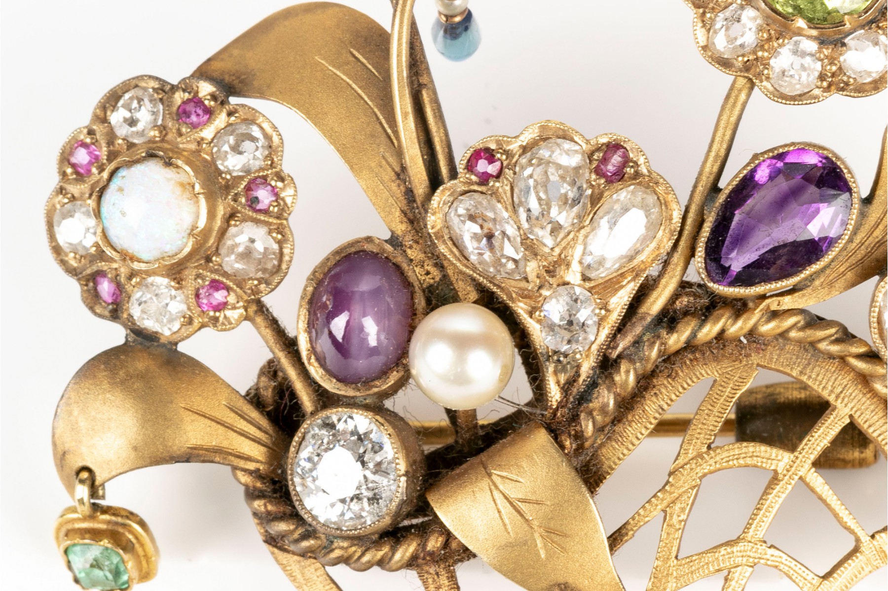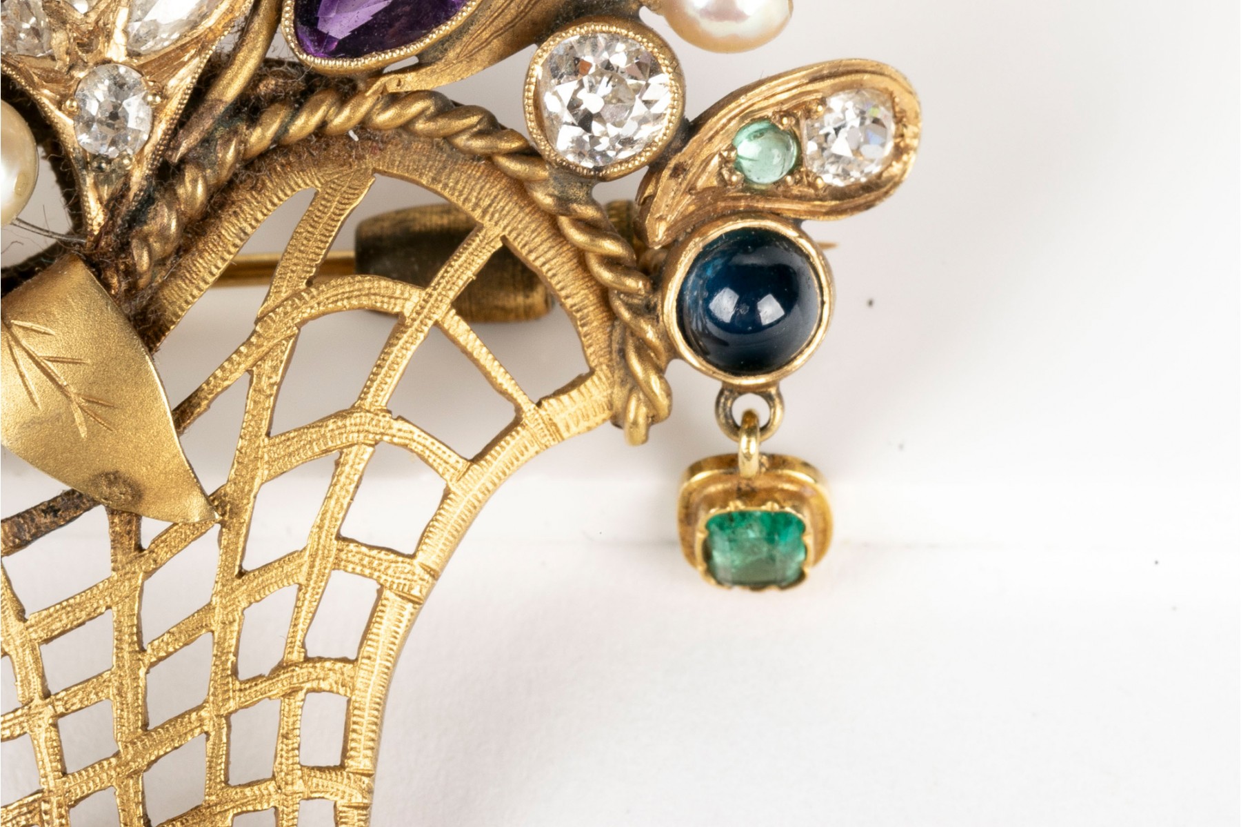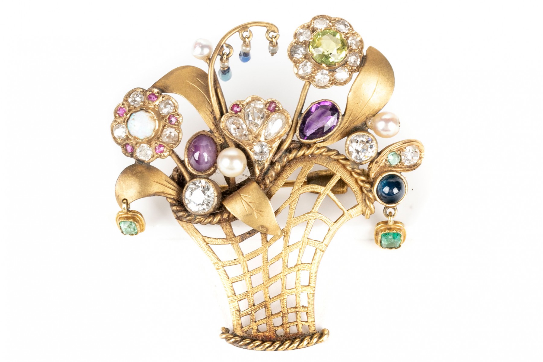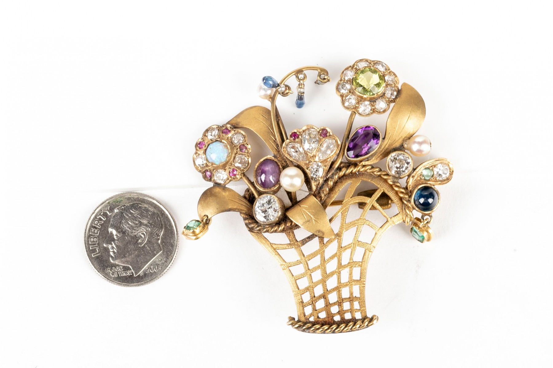 Pretty antique 14k yellow gold diamond and gemstone basket and flower motif brooch, set with an assortment of amethysts, peridots, emeralds, opals, sapphires, rubies and cultured pearls, along with oval, pear and round shaped old mine cut diamonds.