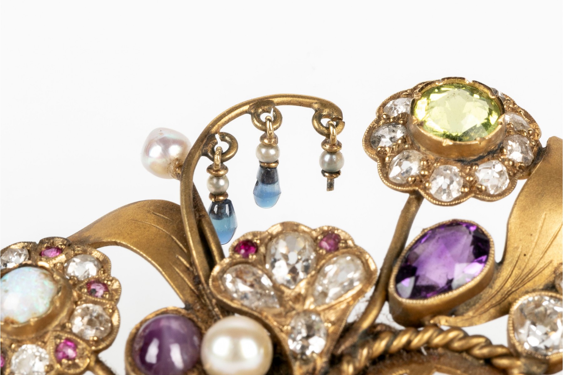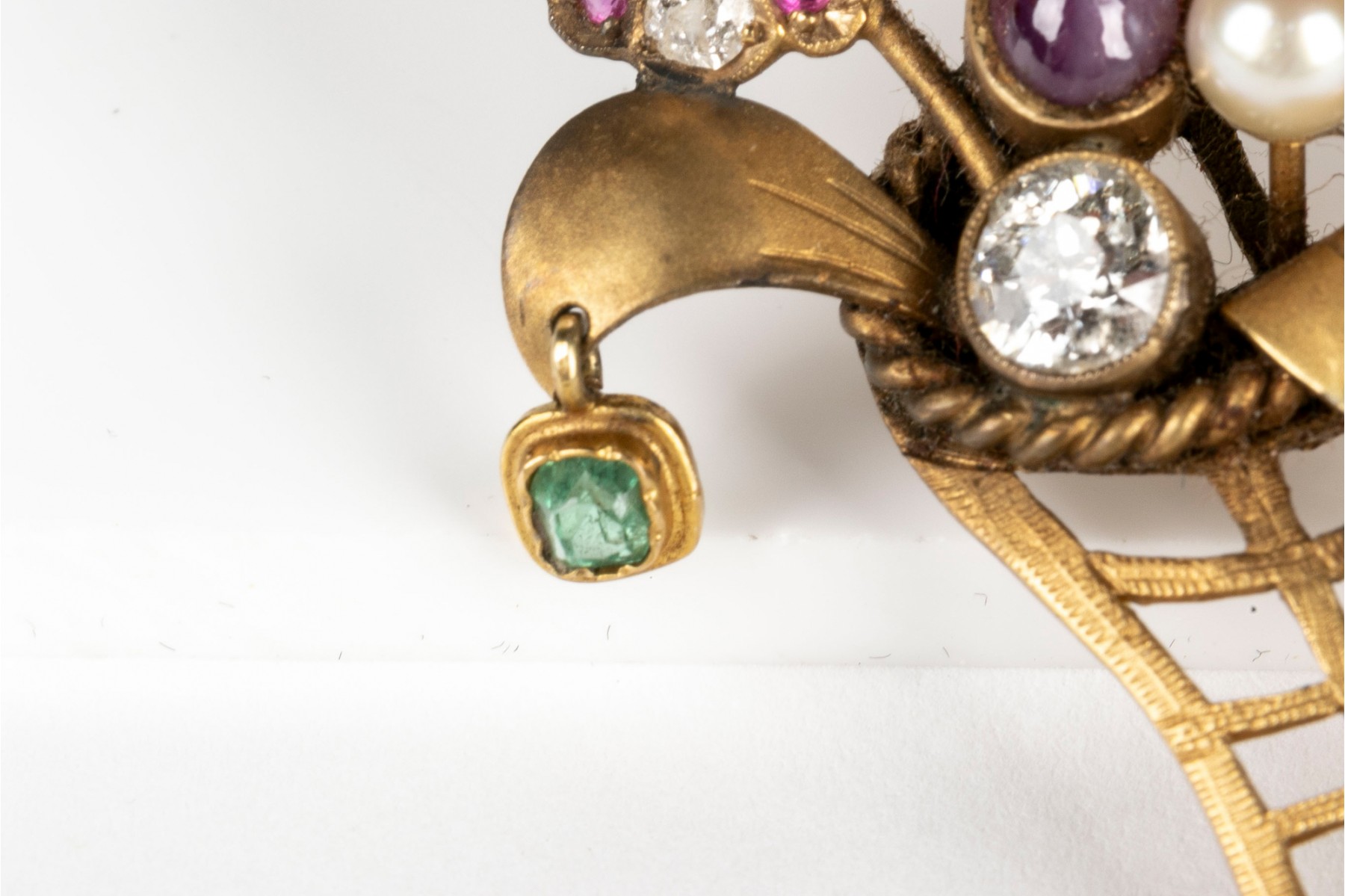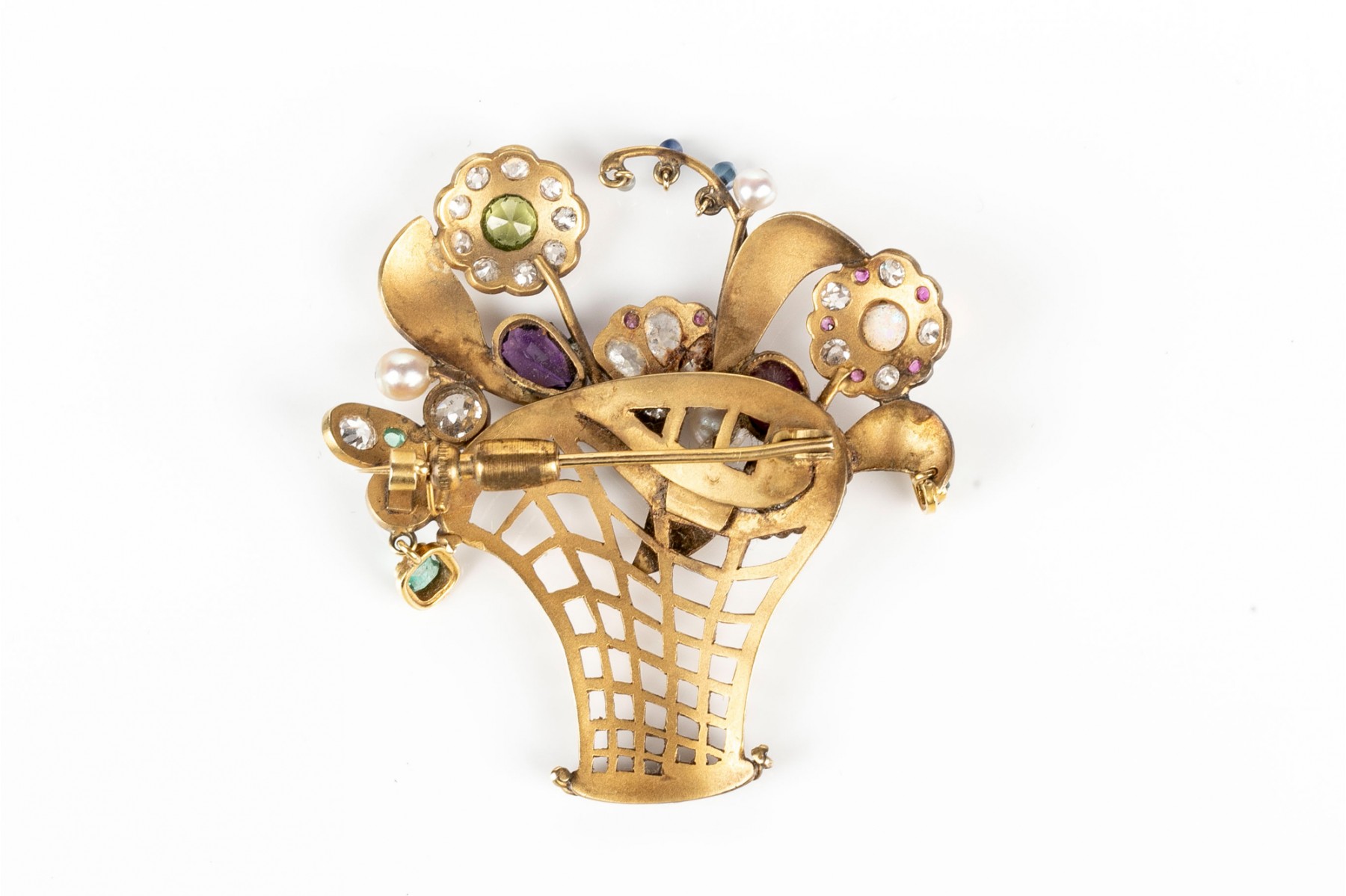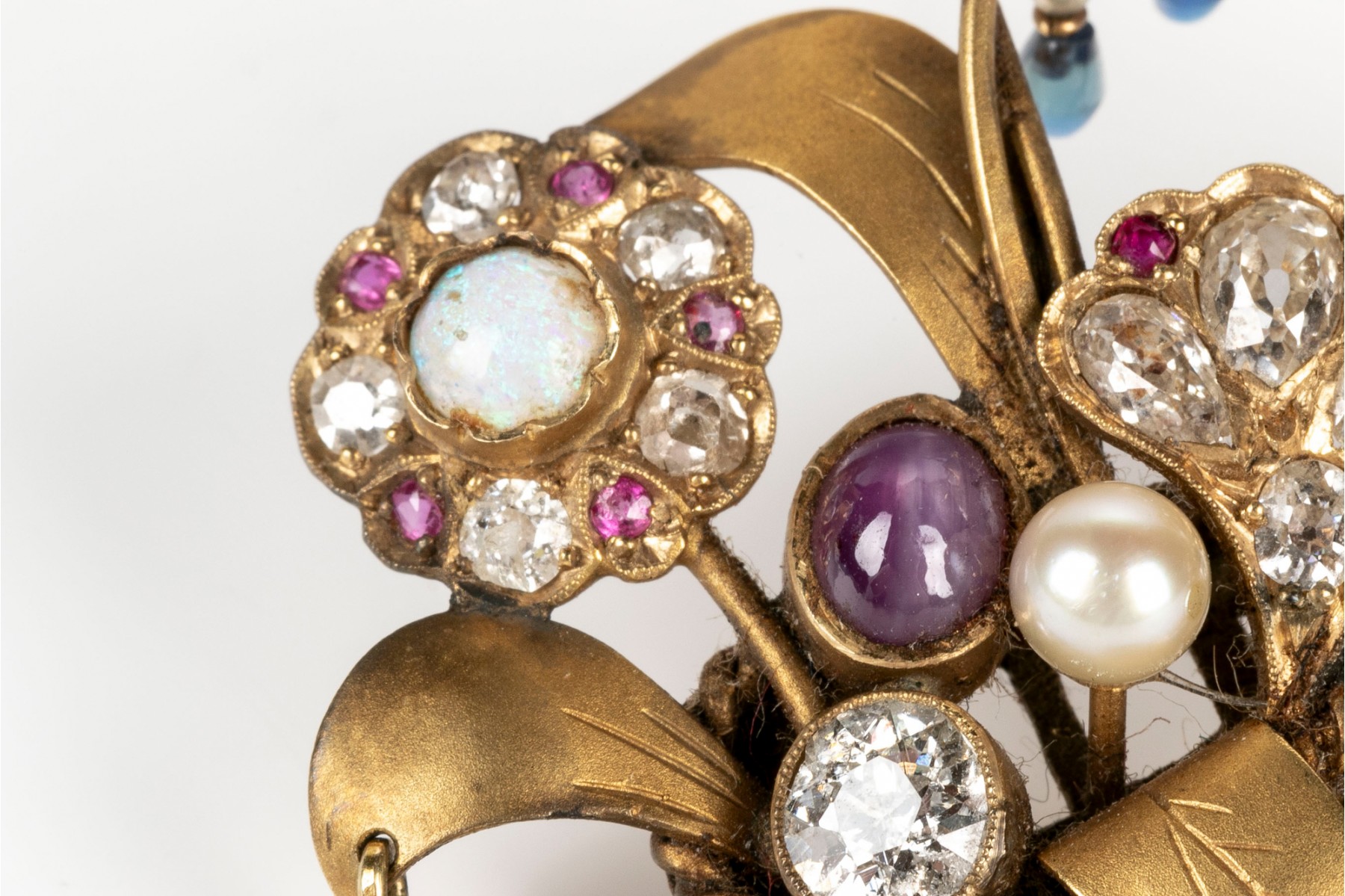 Pretty antique 14k yellow gold diamond and gemstone basket and flower motif brooch, set with an assortment of amethysts, peridots, emeralds, opals, sapphires, rubies and cultured pearls, along with oval, pear and round shaped old mine cut diamonds.
