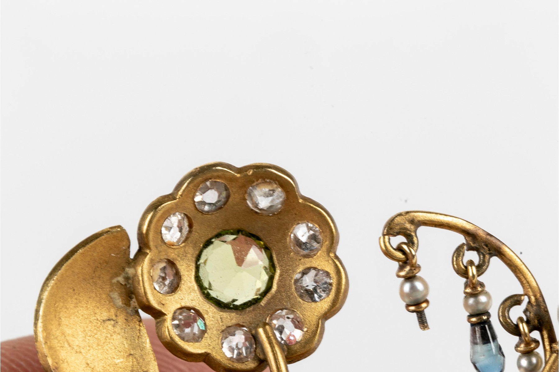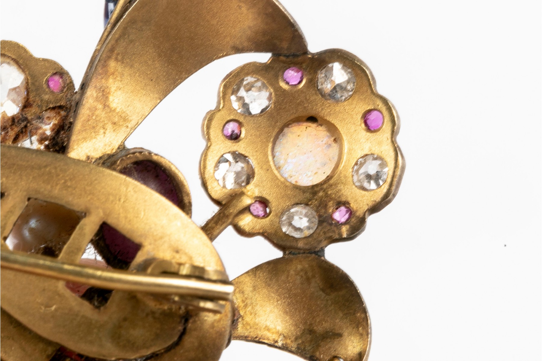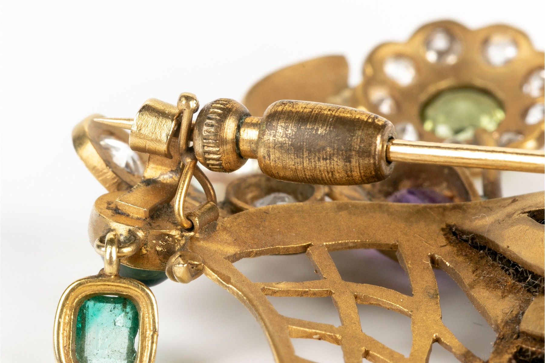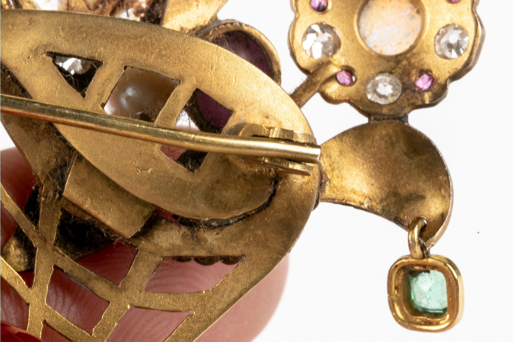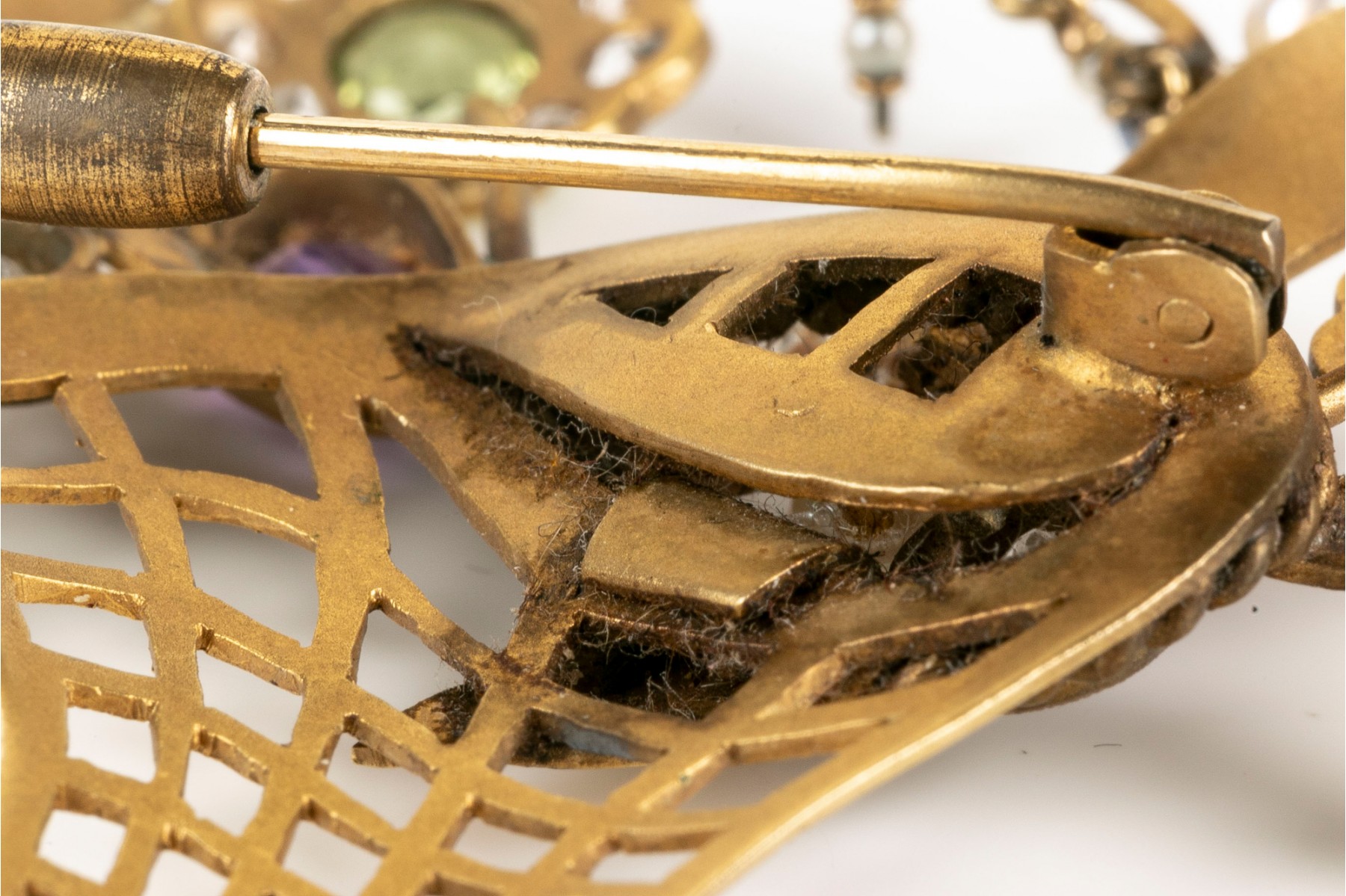 Pretty antique 14k yellow gold diamond and gemstone basket and flower motif brooch, set with an assortment of amethysts, peridots, emeralds, opals, sapphires, rubies and cultured pearls, along with oval, pear and round shaped old mine cut diamonds.