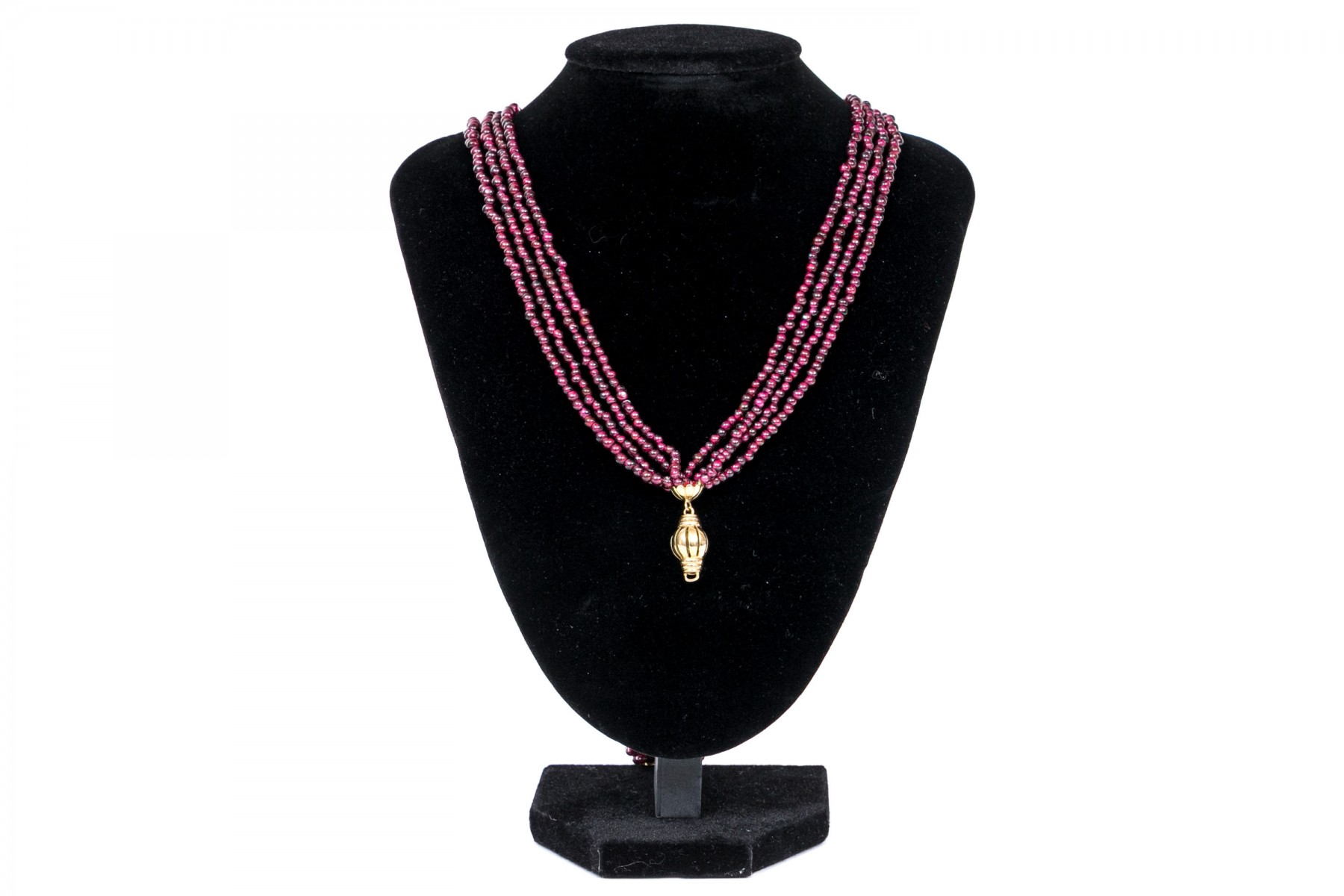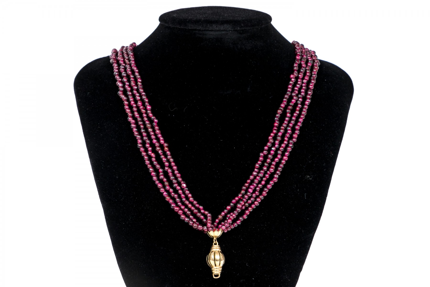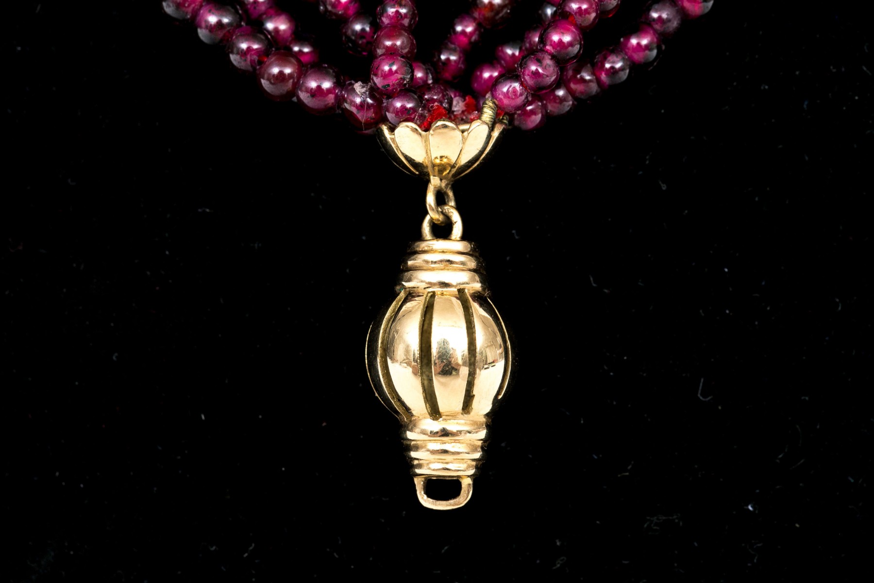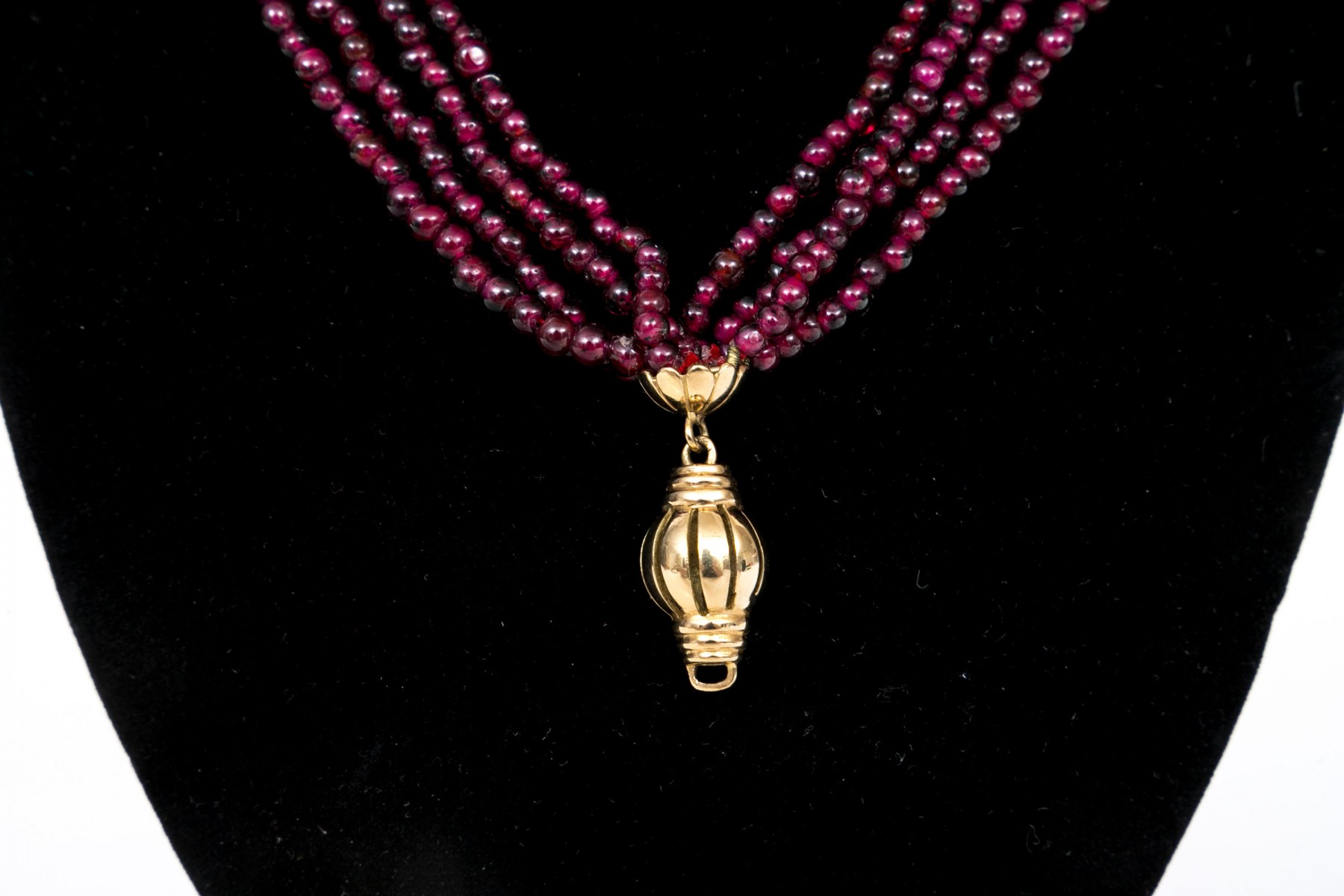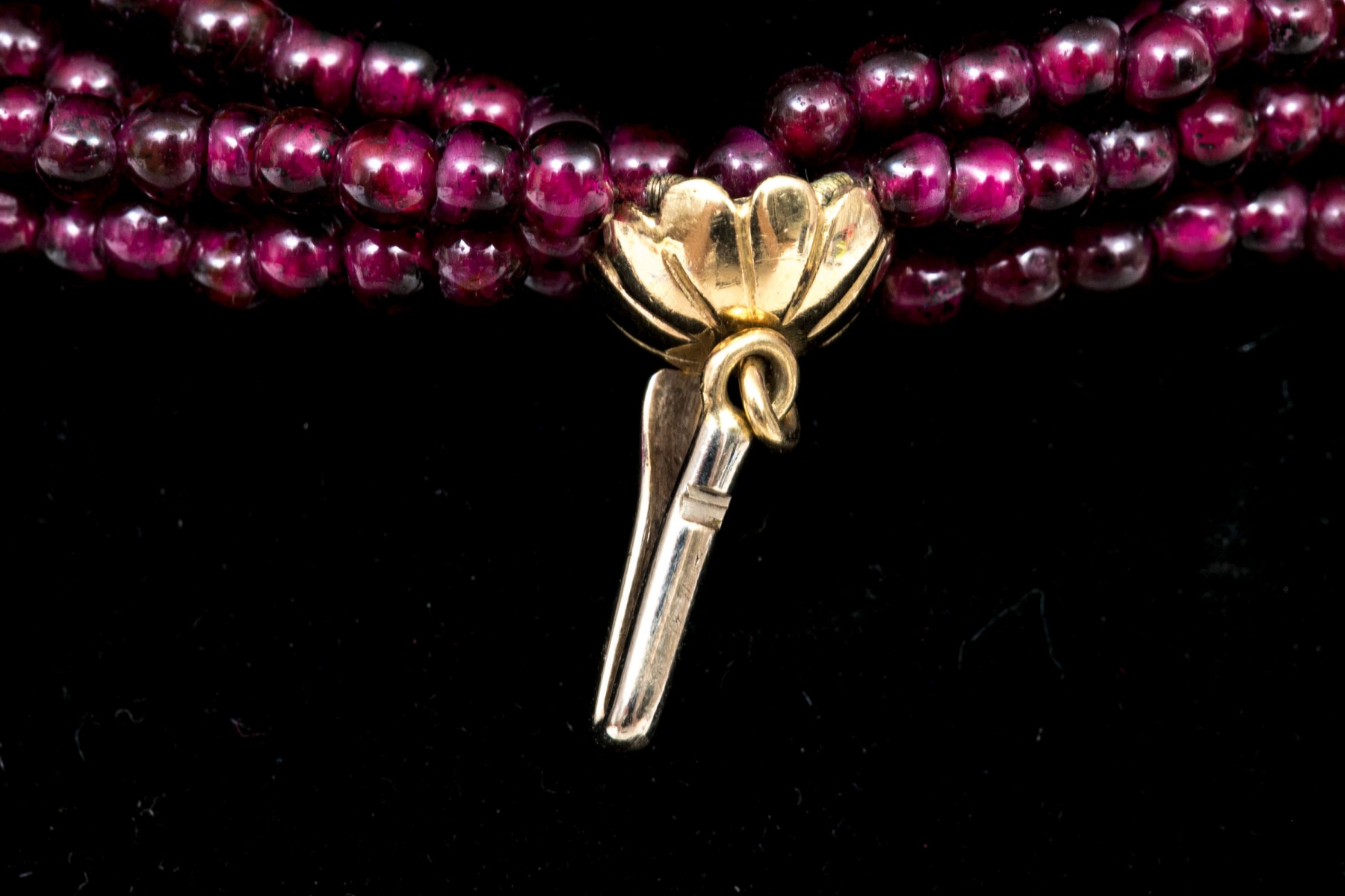 Pretty eight strand garnet bead torsade necklace, with a 14k yellow gold ball style bead clasp