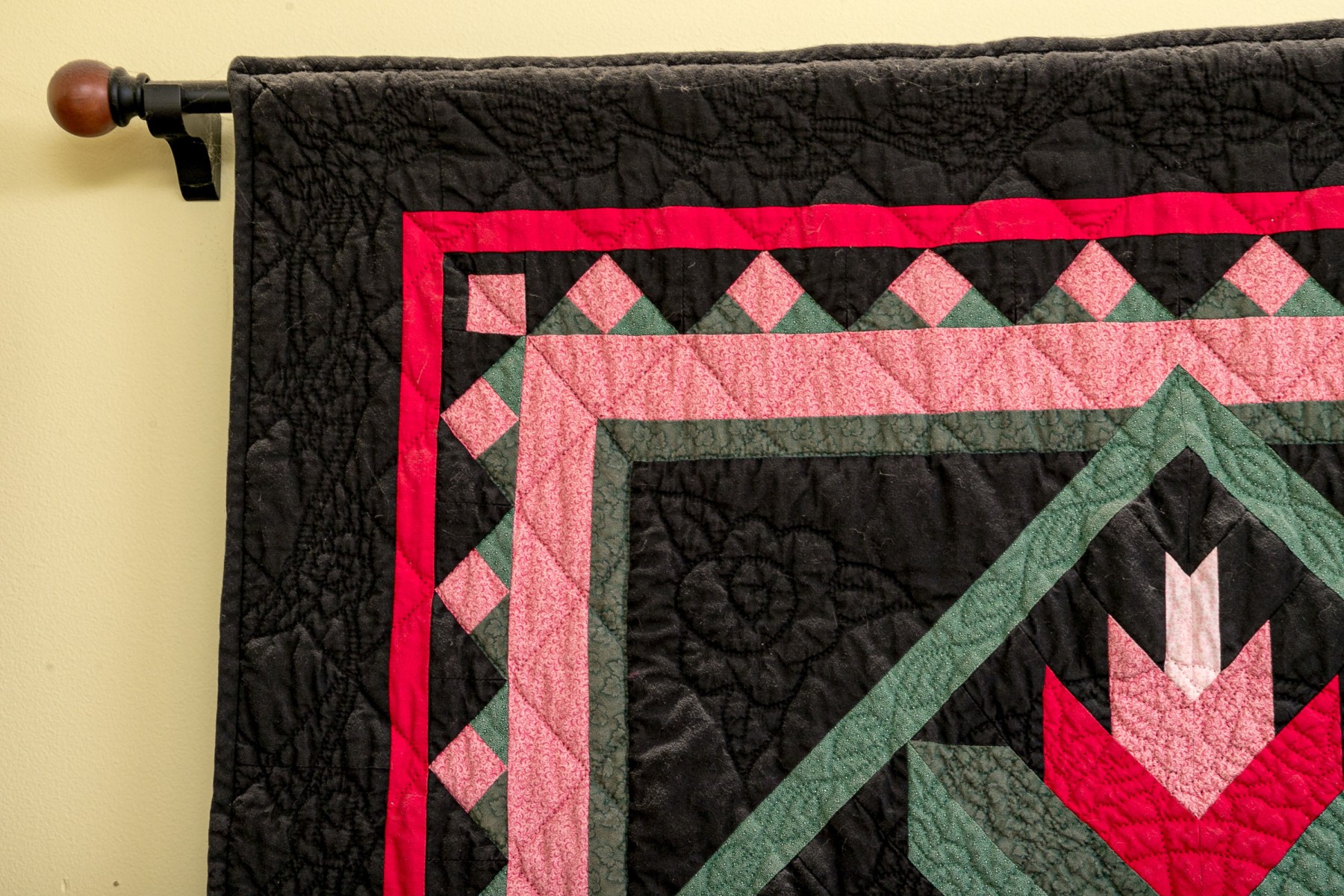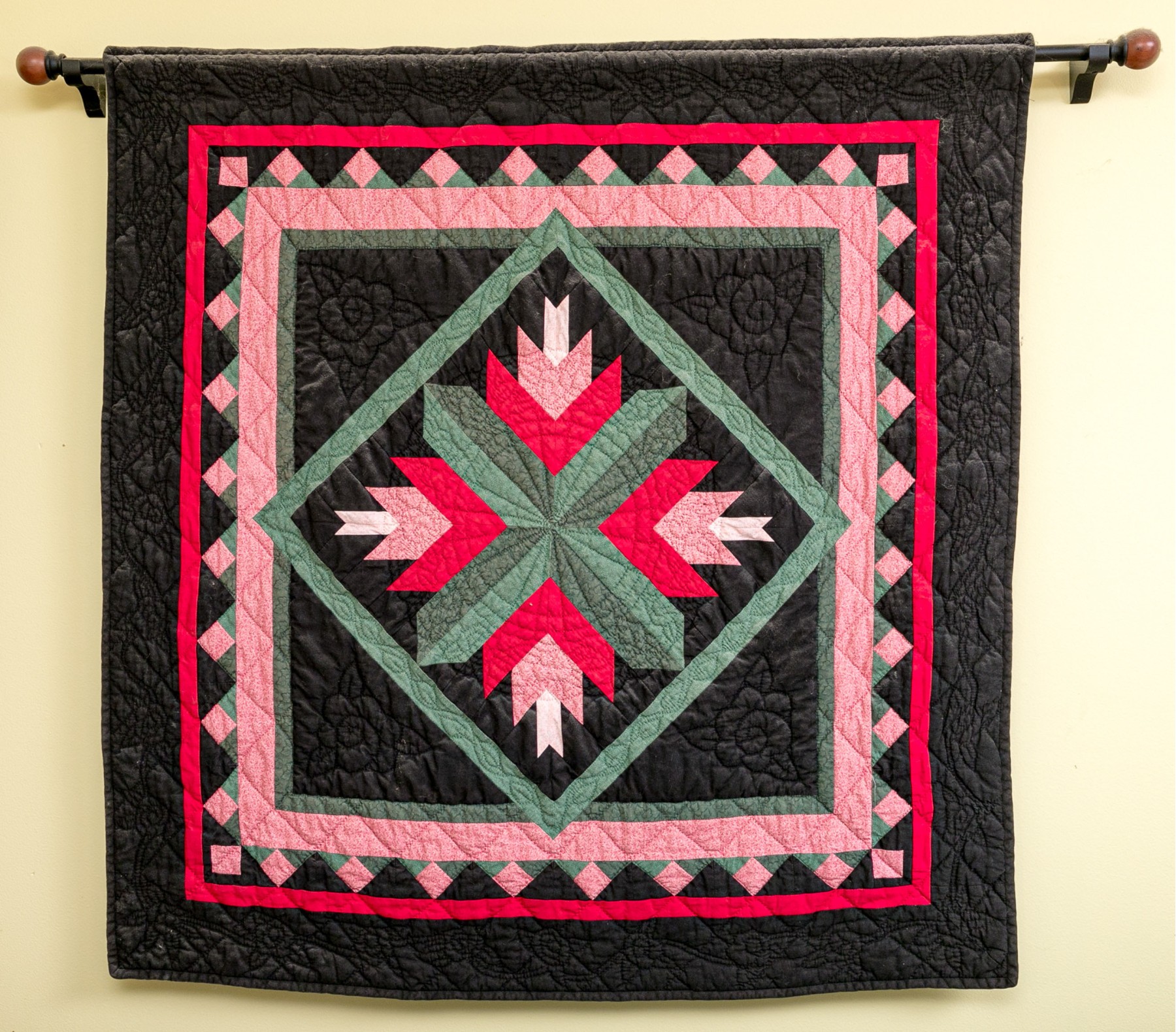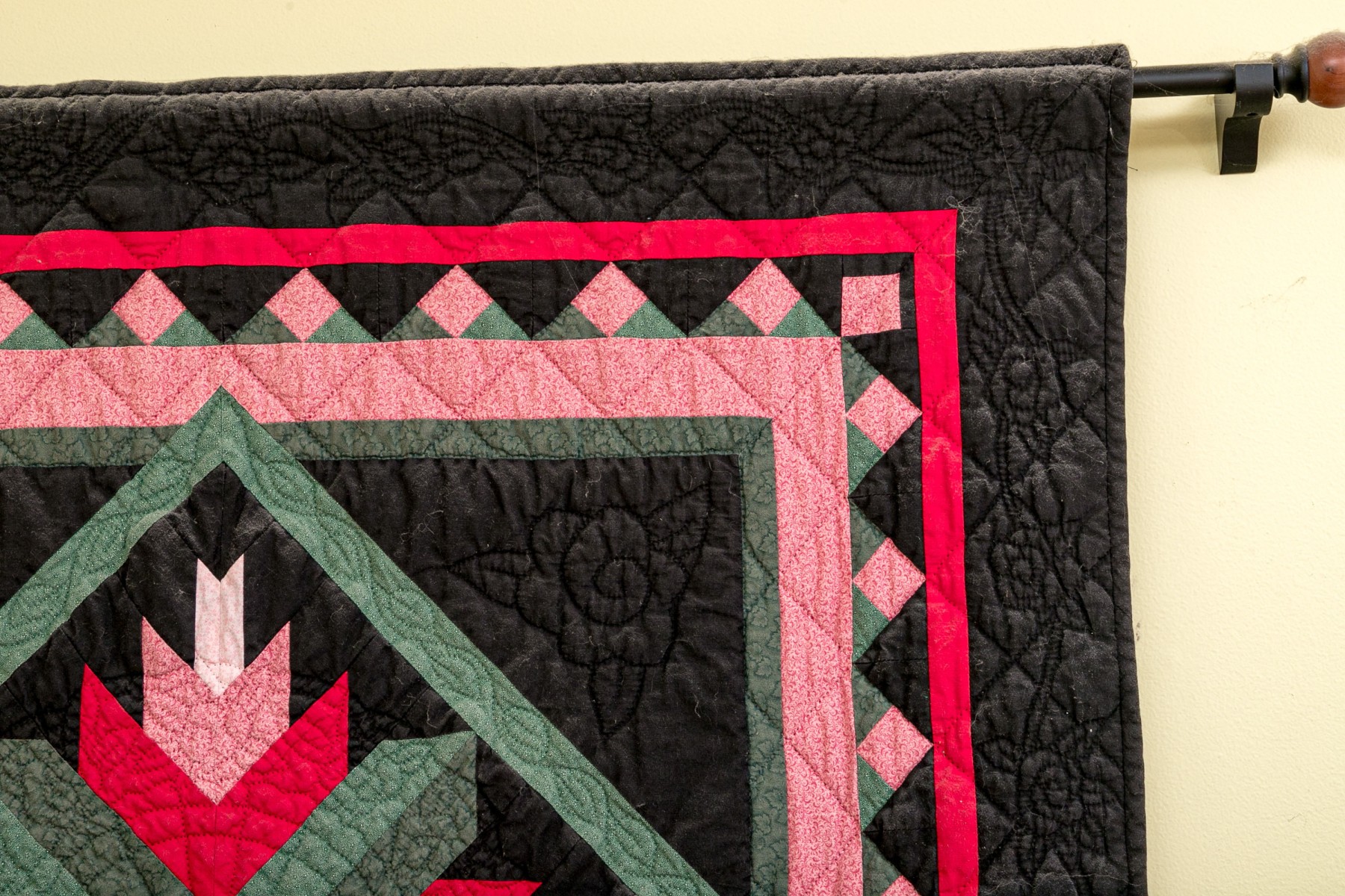 A beautiful wall-hanging quilt in black displaying pink and red borders around a sage green center with a four-petaled floral medallion.