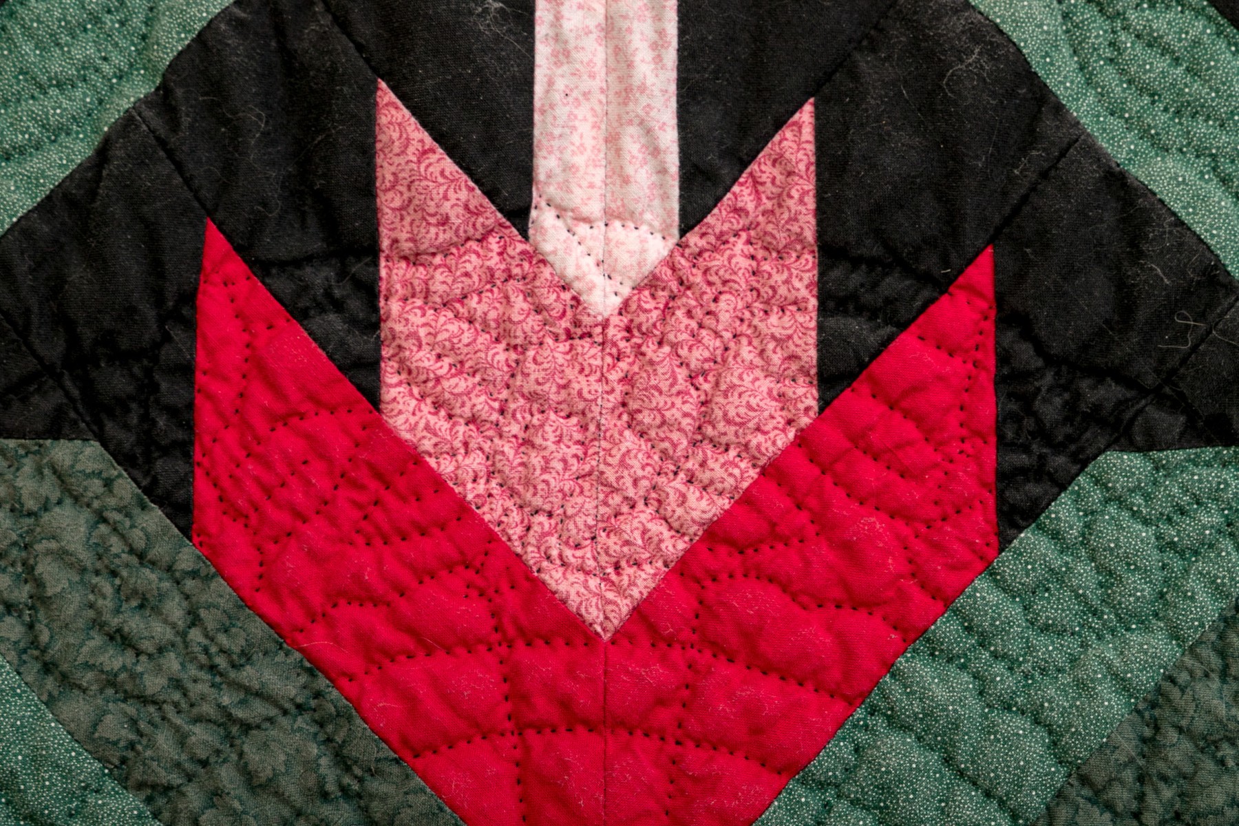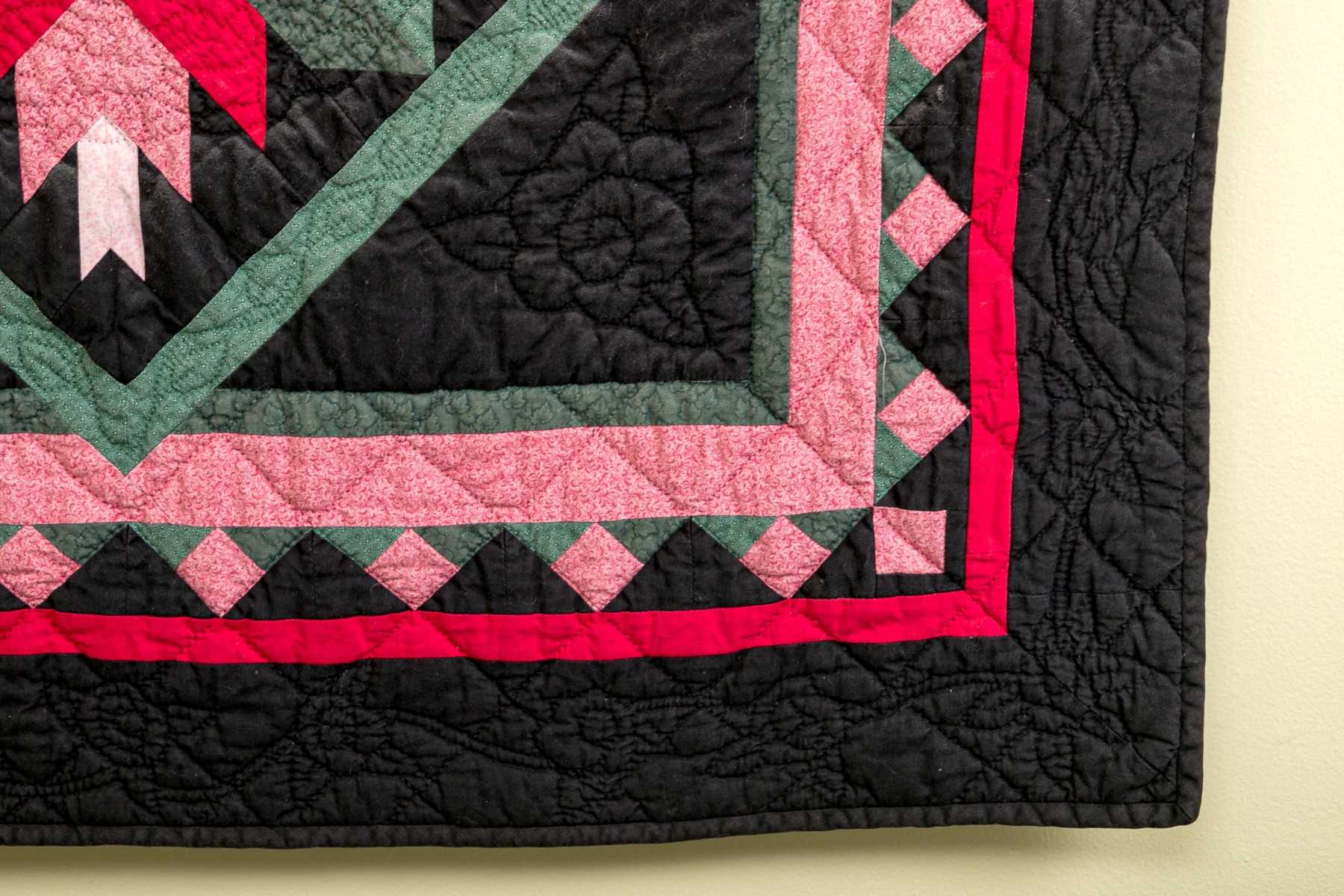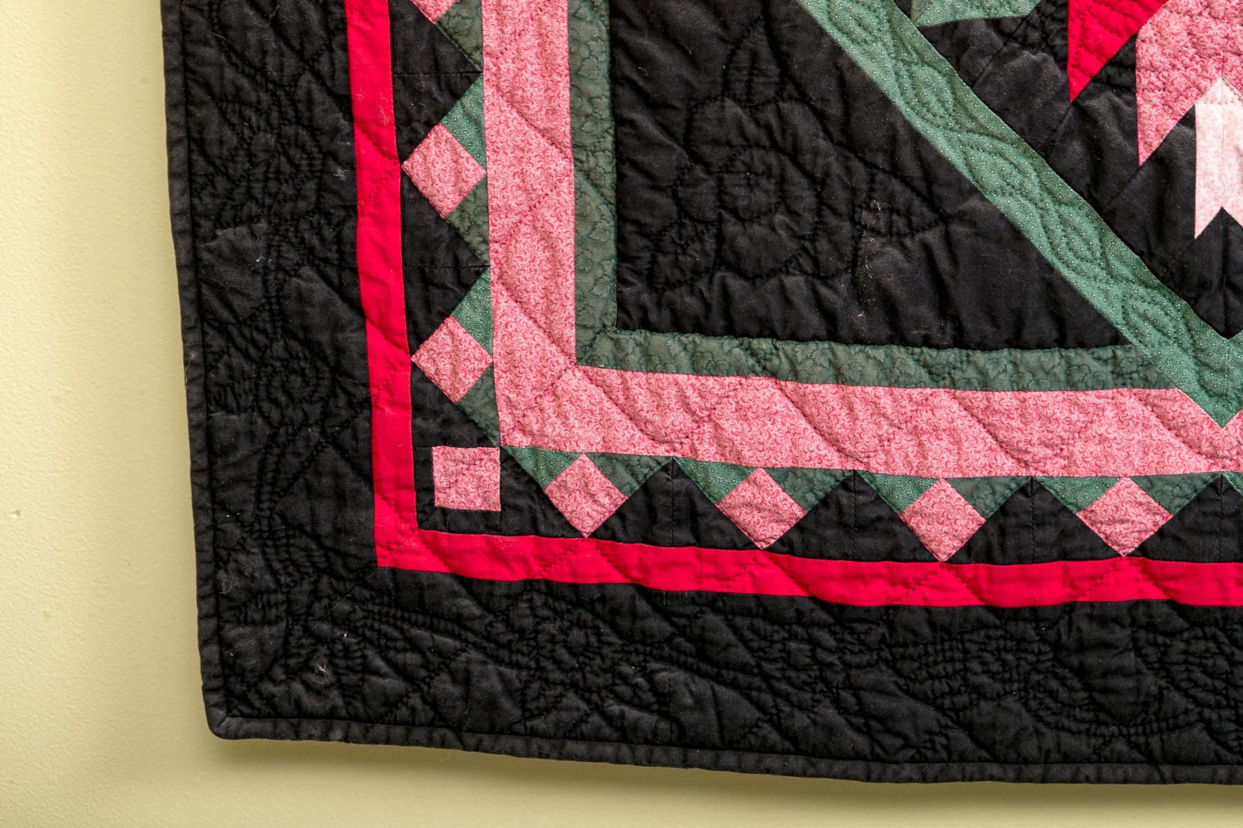 A beautiful wall-hanging quilt in black displaying pink and red borders around a sage green center with a four-petaled floral medallion.