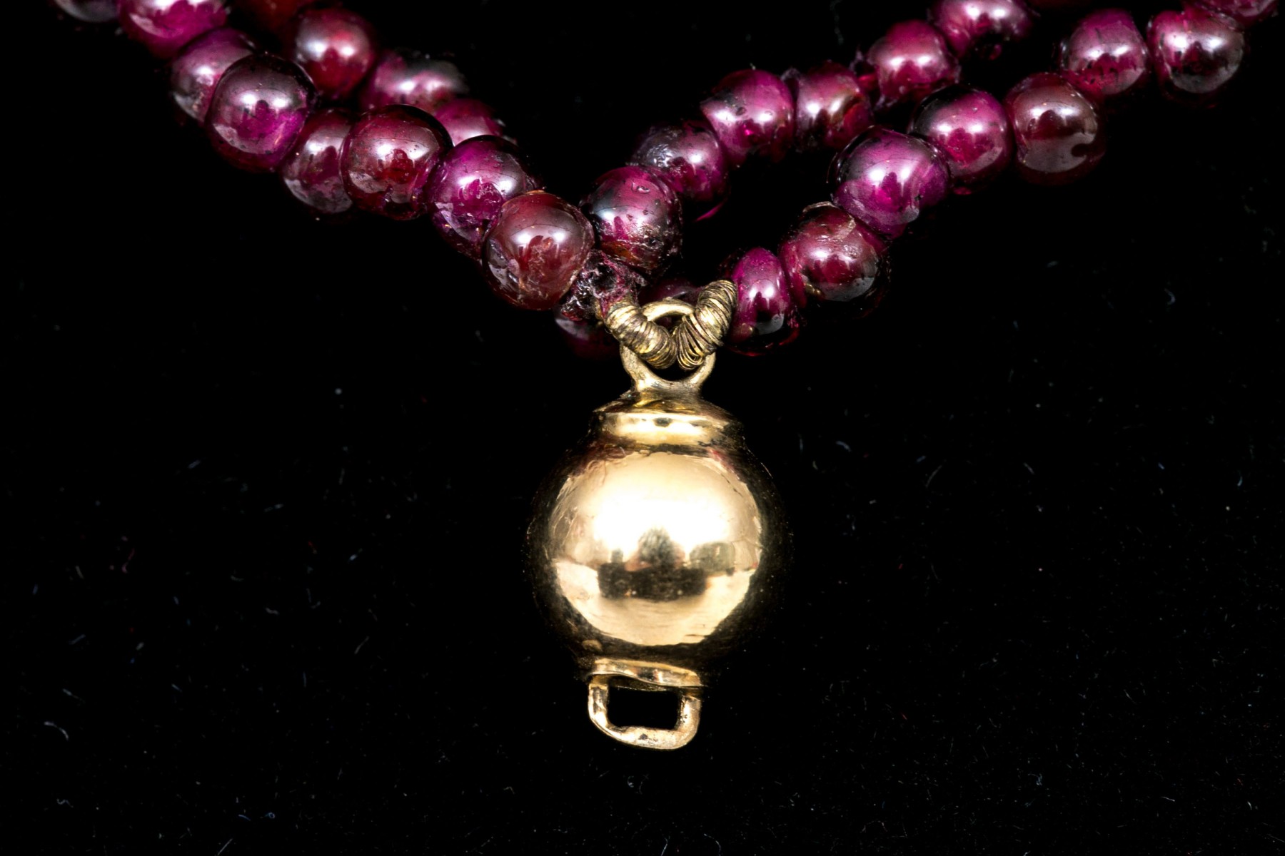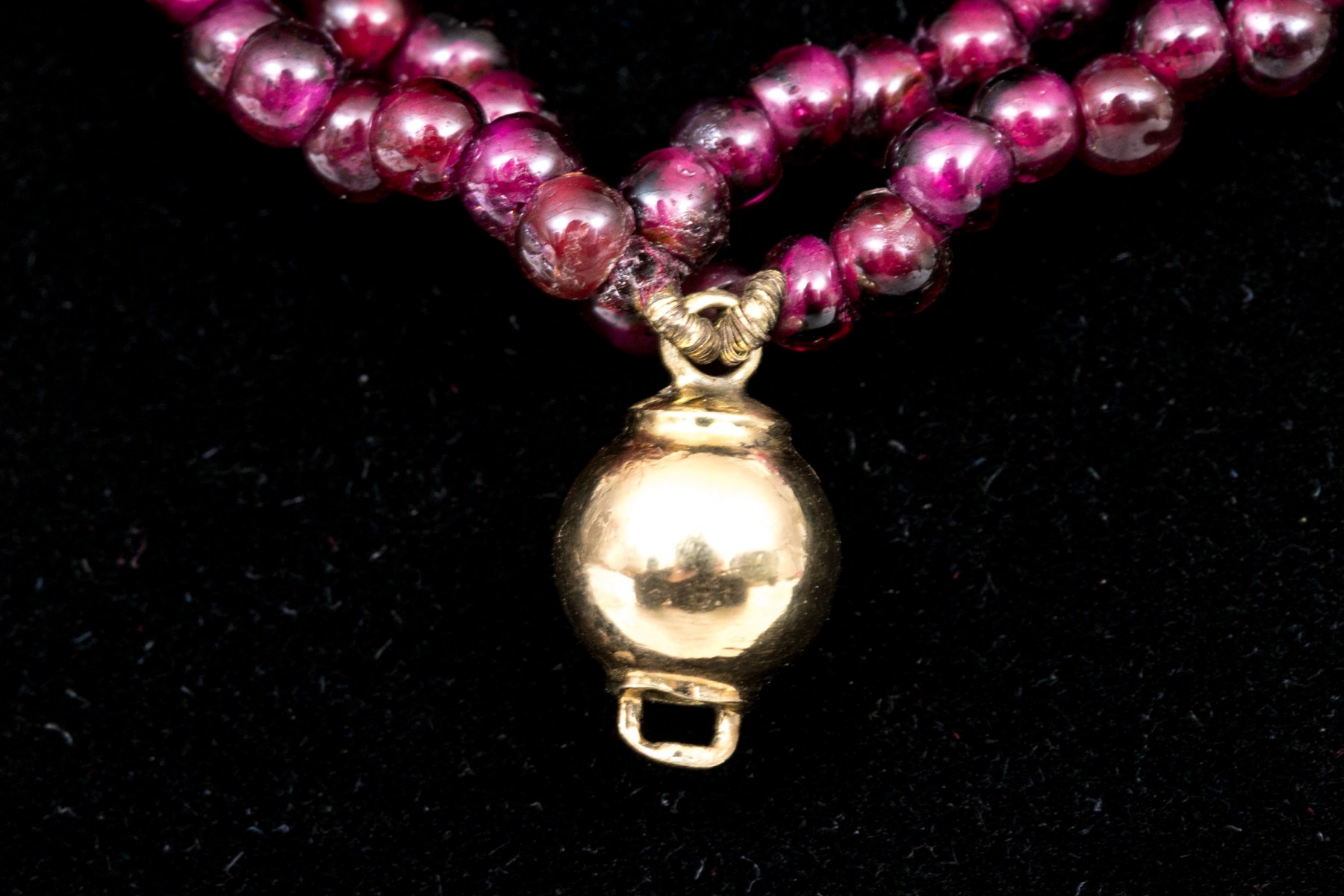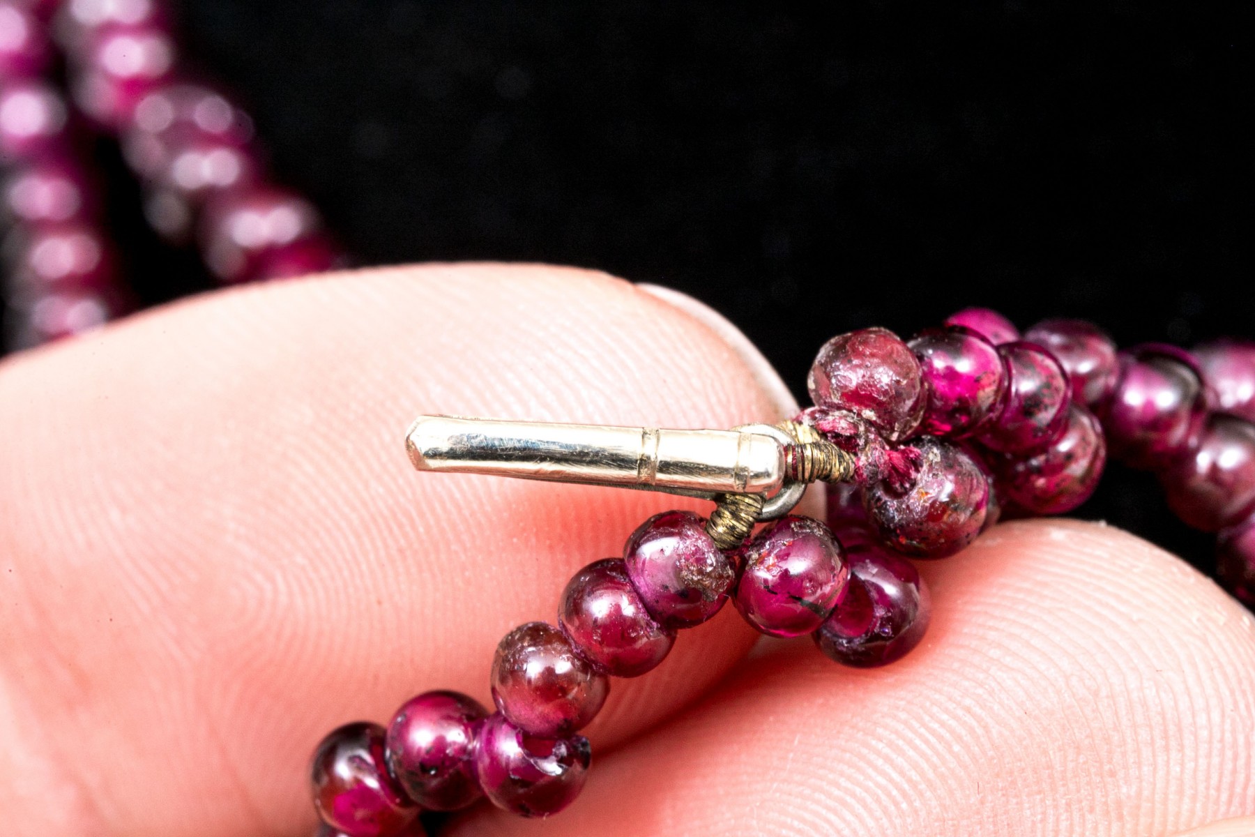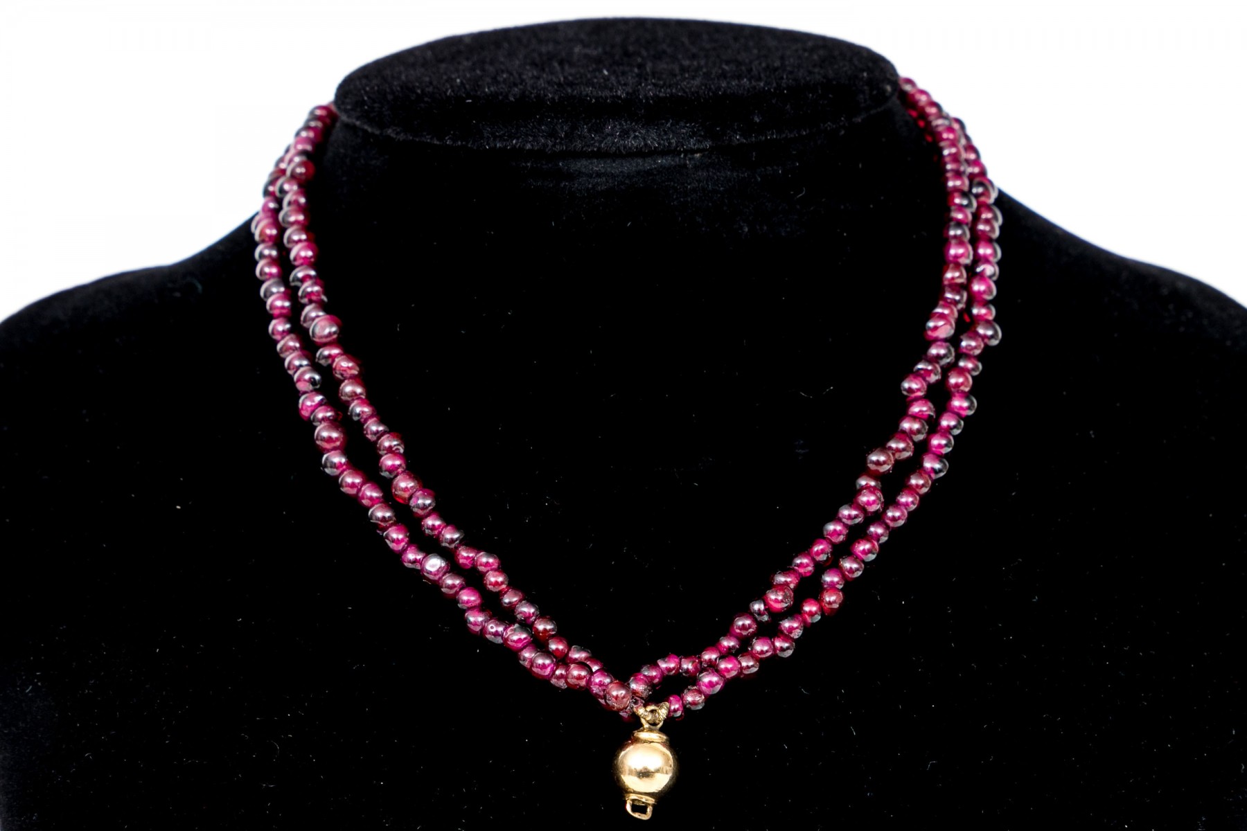 Pretty four strand garnet bead torsade bracelet, with a 14k yellow gold ball style bead clasp, short length