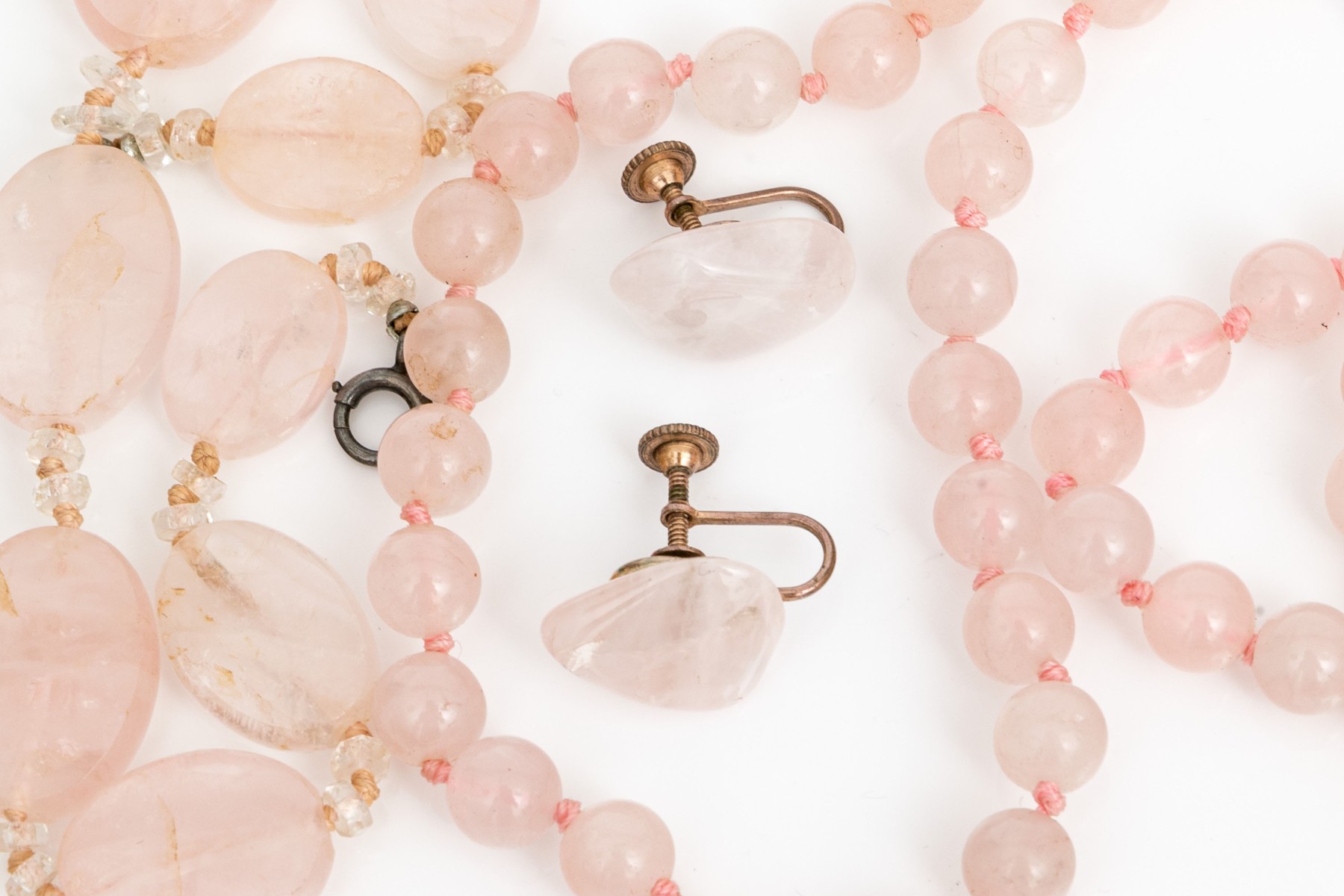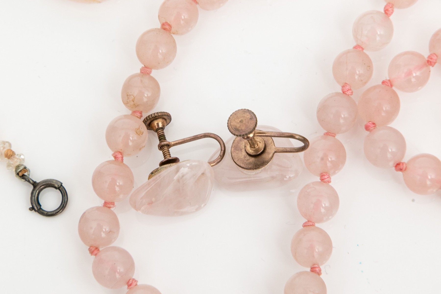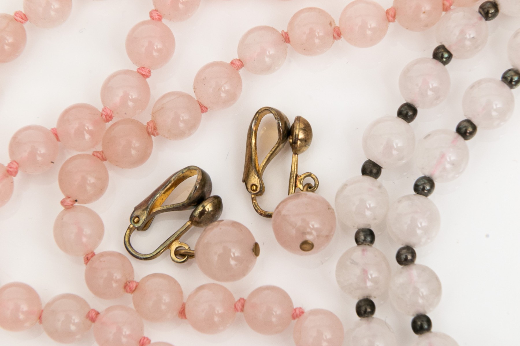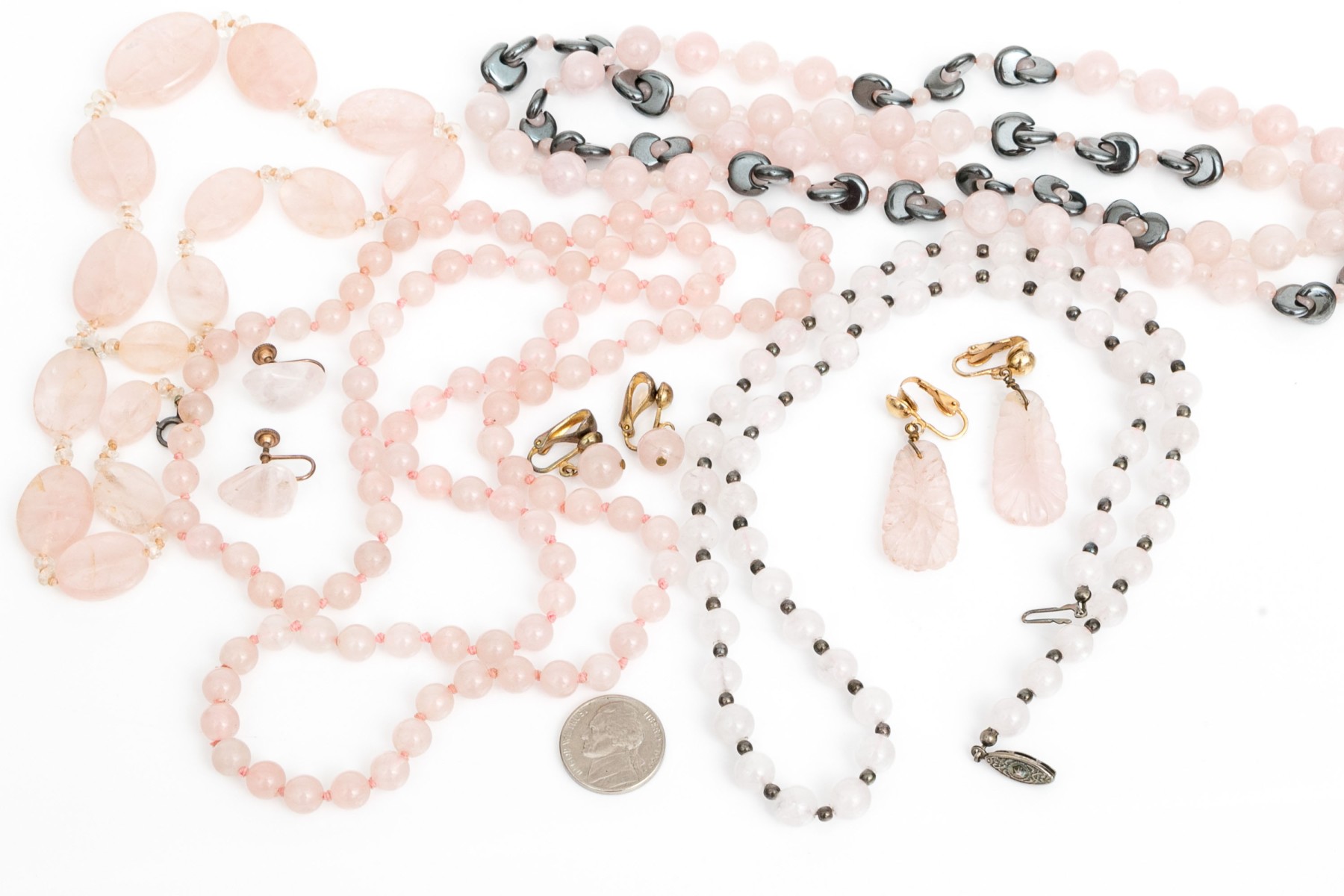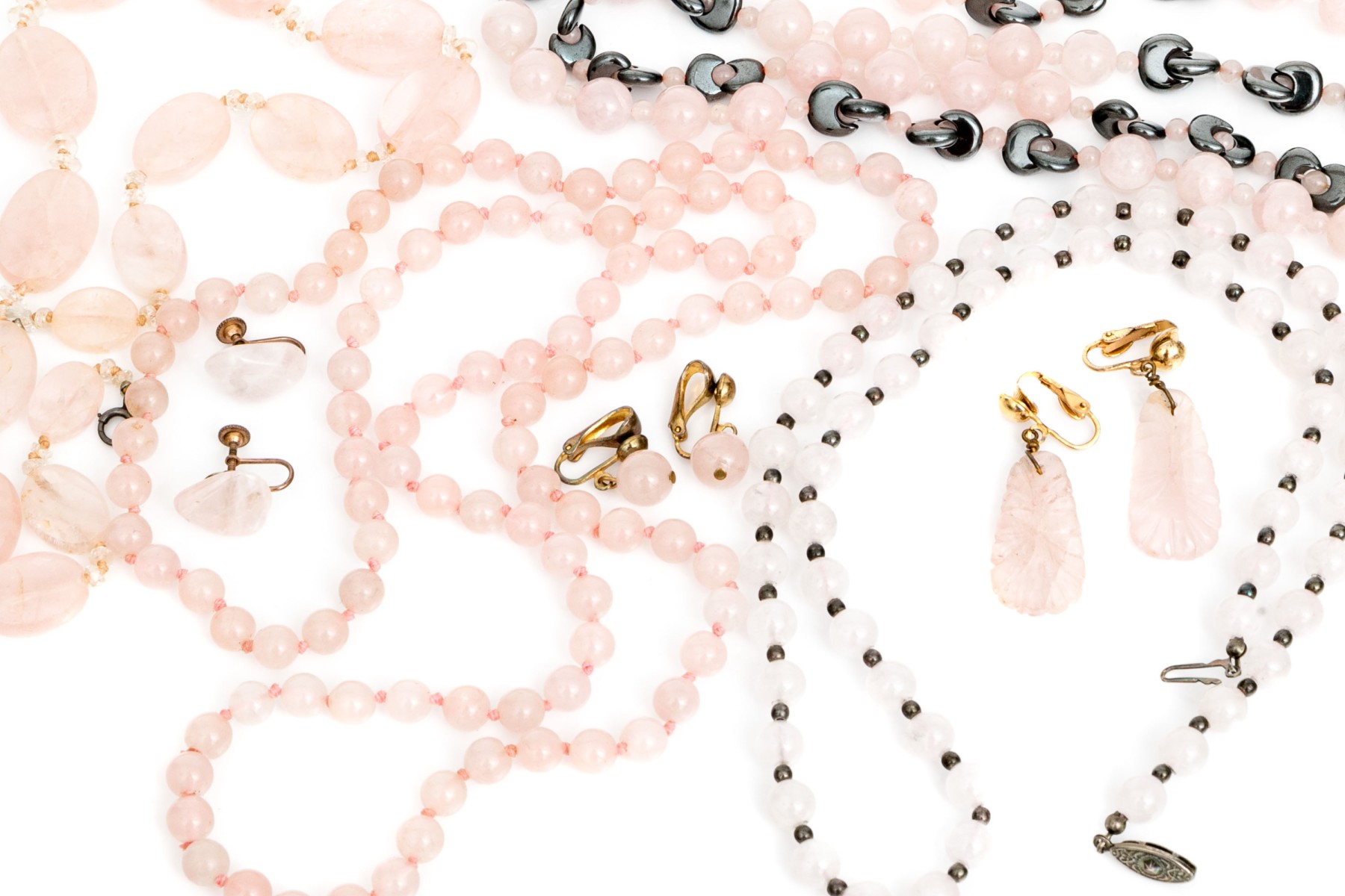 Pretty lot of rose quartz jewelry, assorted necklaces and earrings