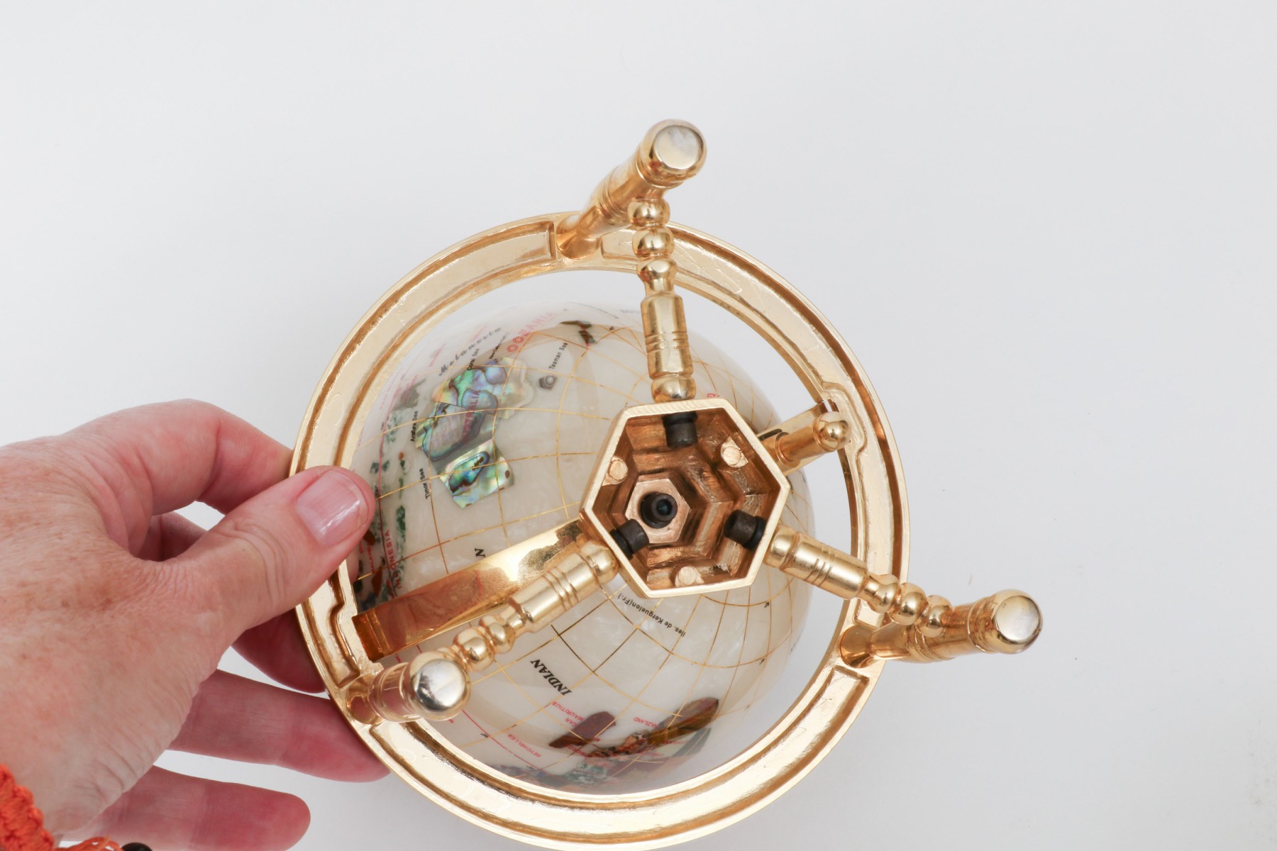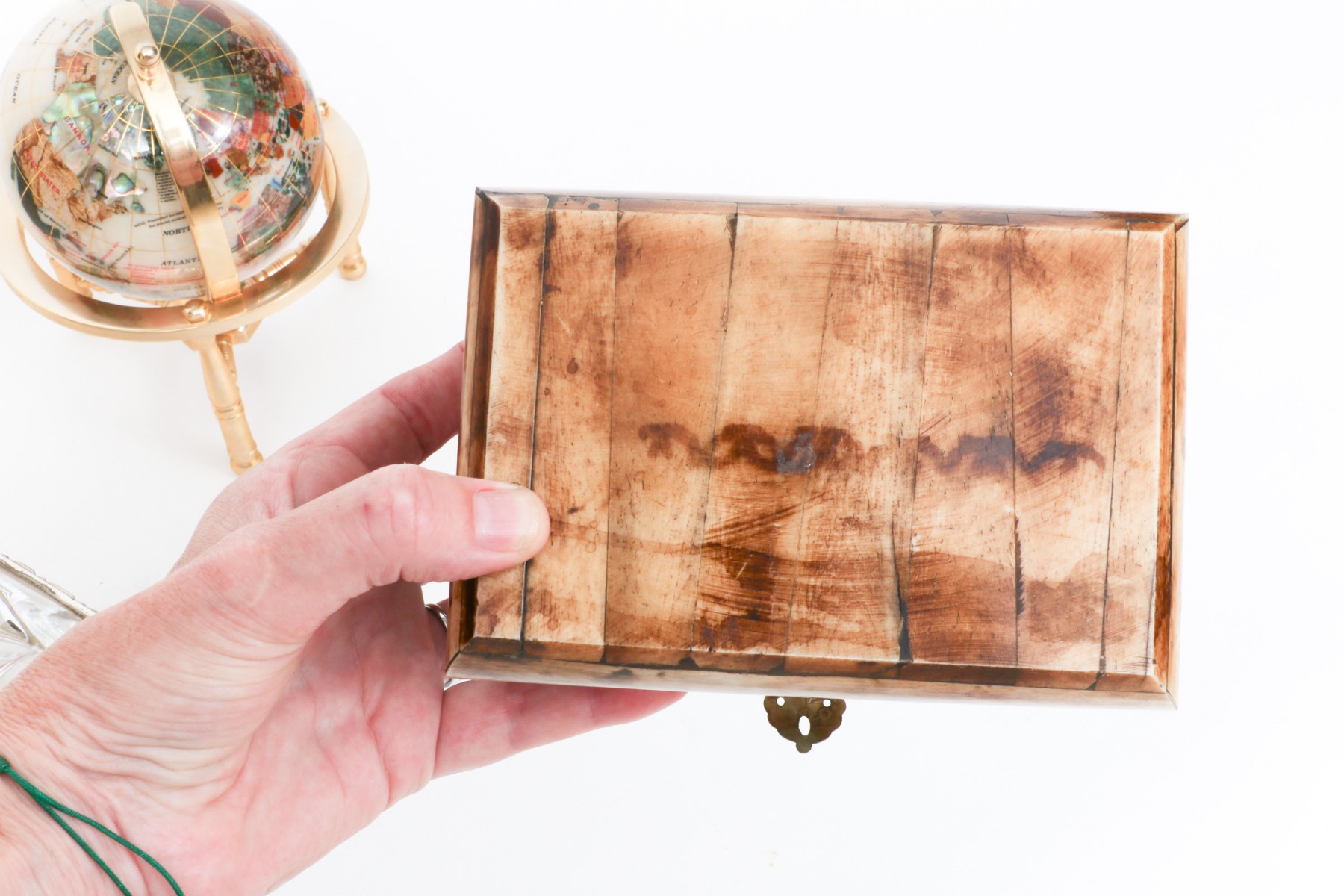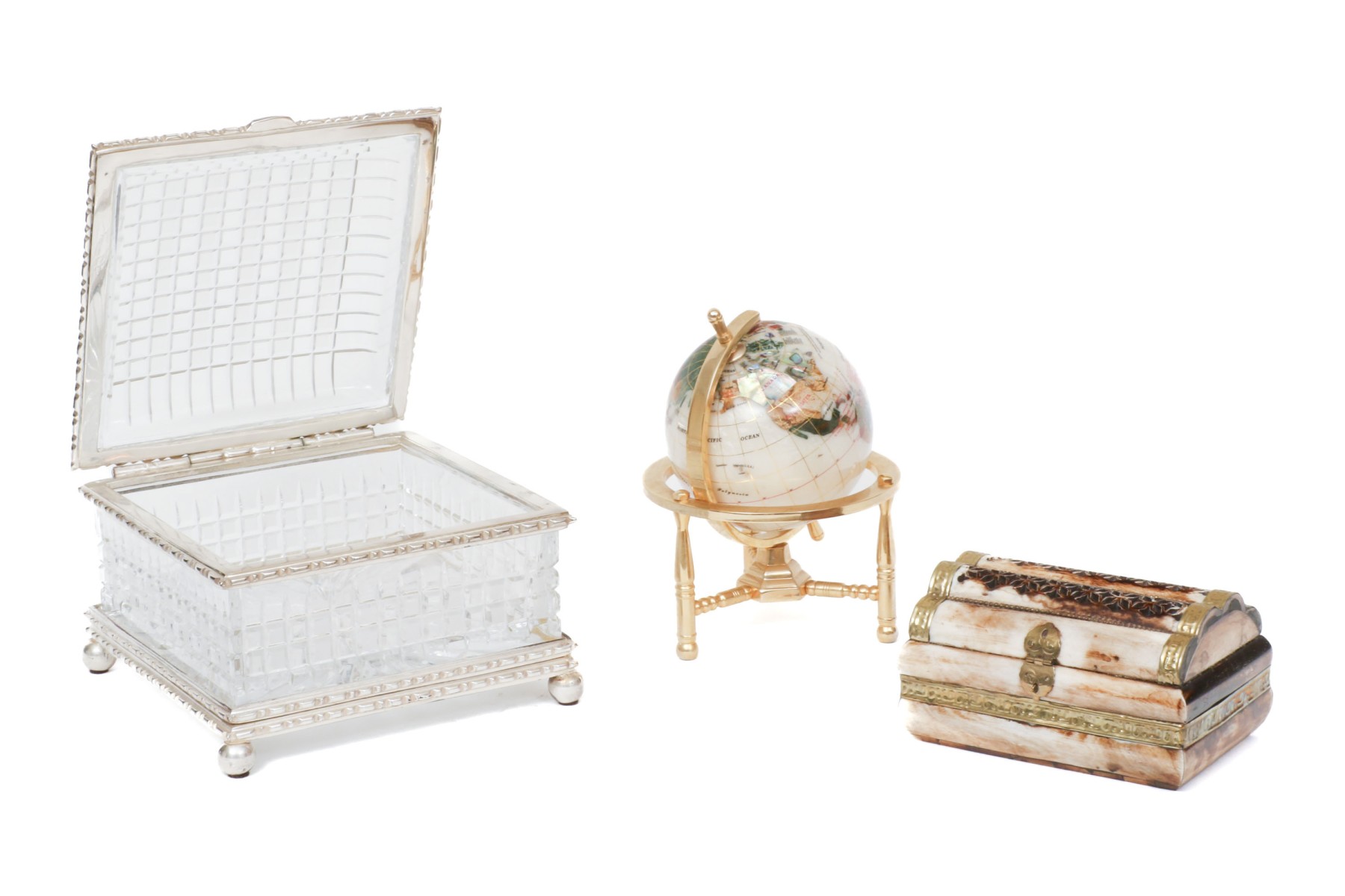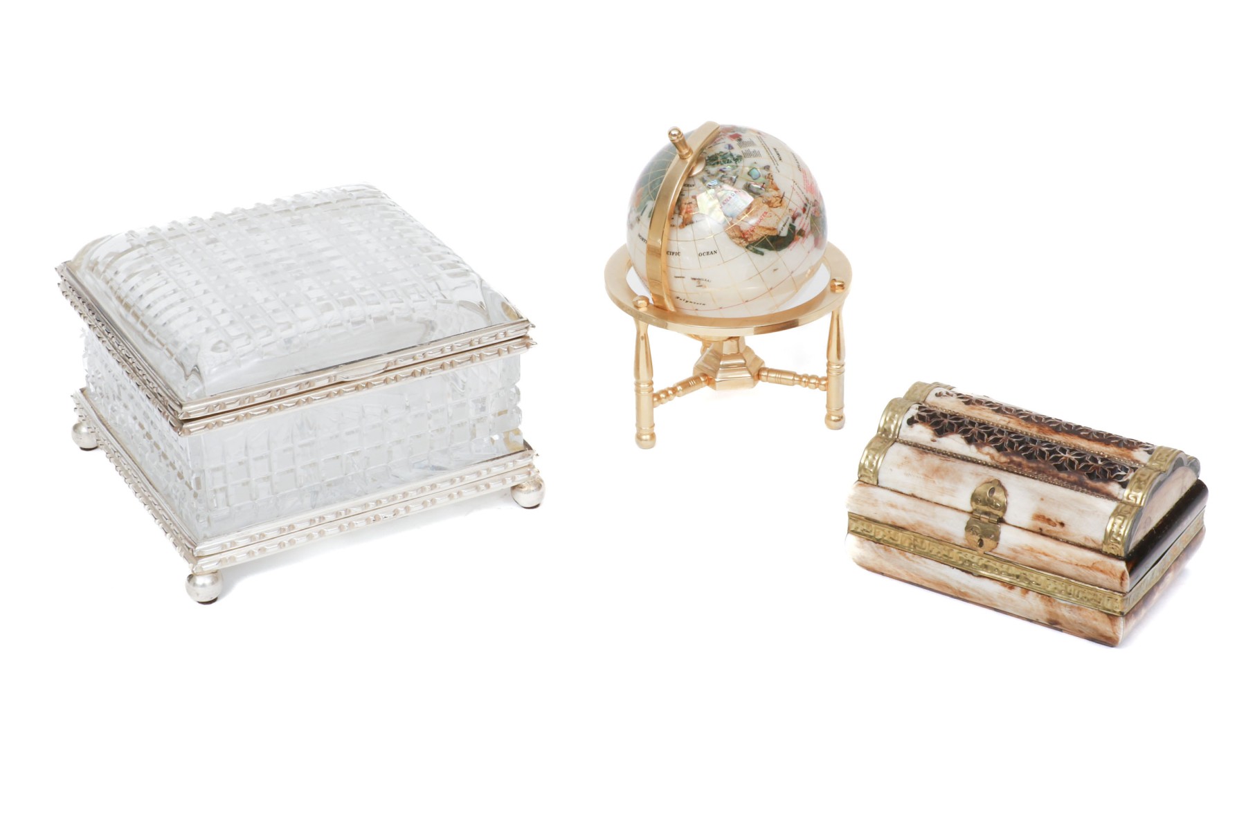 A pretty trio of table top decor. Includes a cut crystal jewelry casket, a ribbed bone and metal hinged jewelry box, and a miniature globe figure inlaid with hardstone.