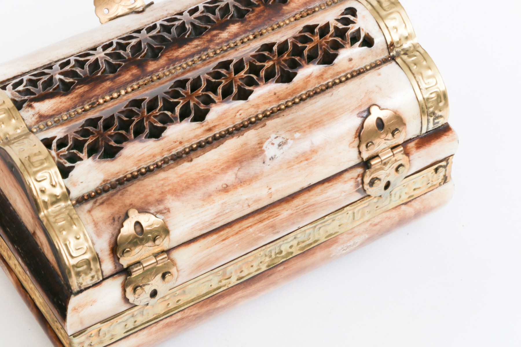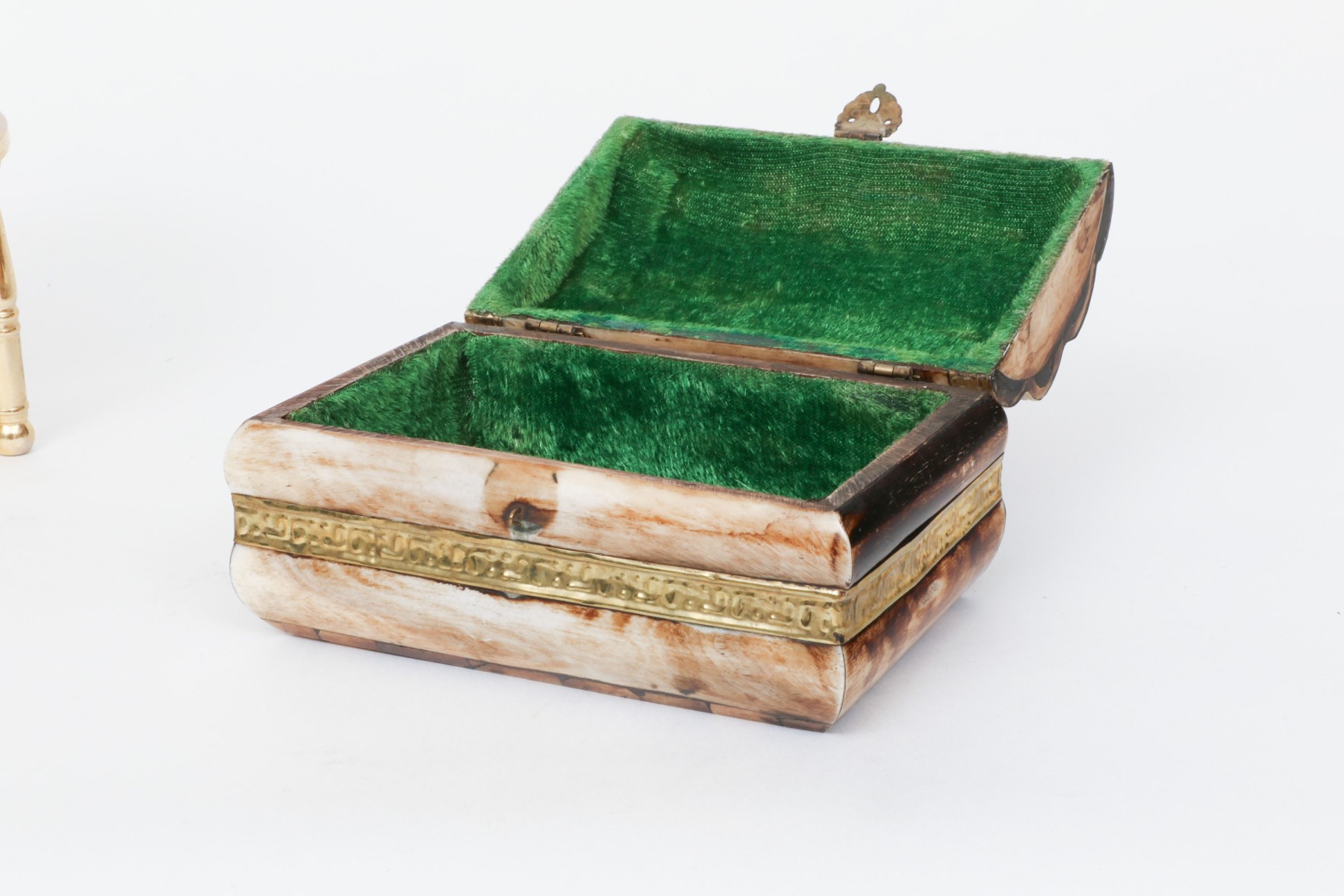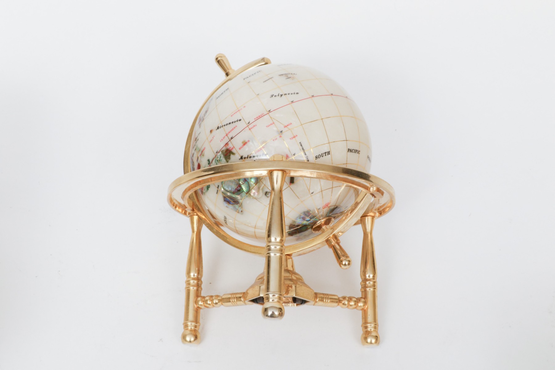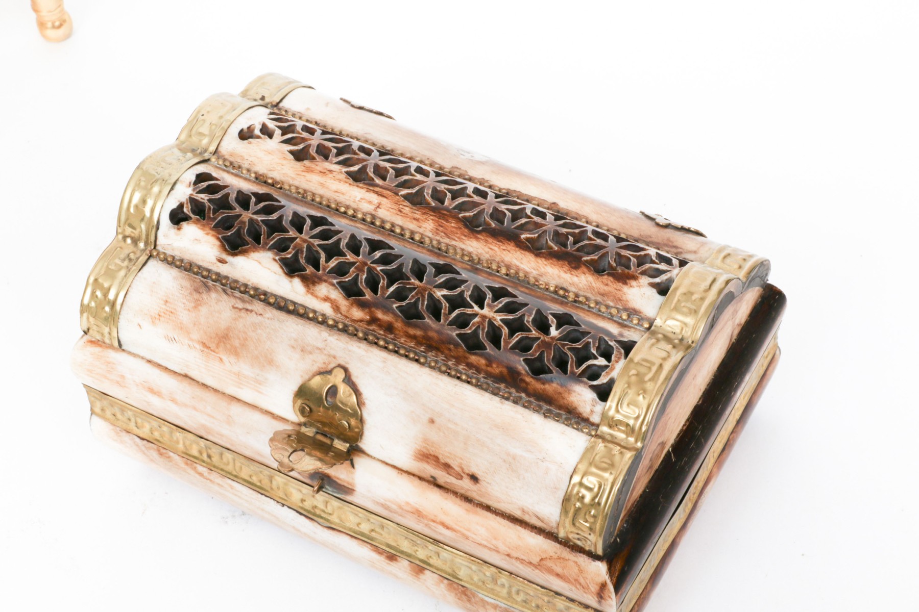 A pretty trio of table top decor. Includes a cut crystal jewelry casket, a ribbed bone and metal hinged jewelry box, and a miniature globe figure inlaid with hardstone.