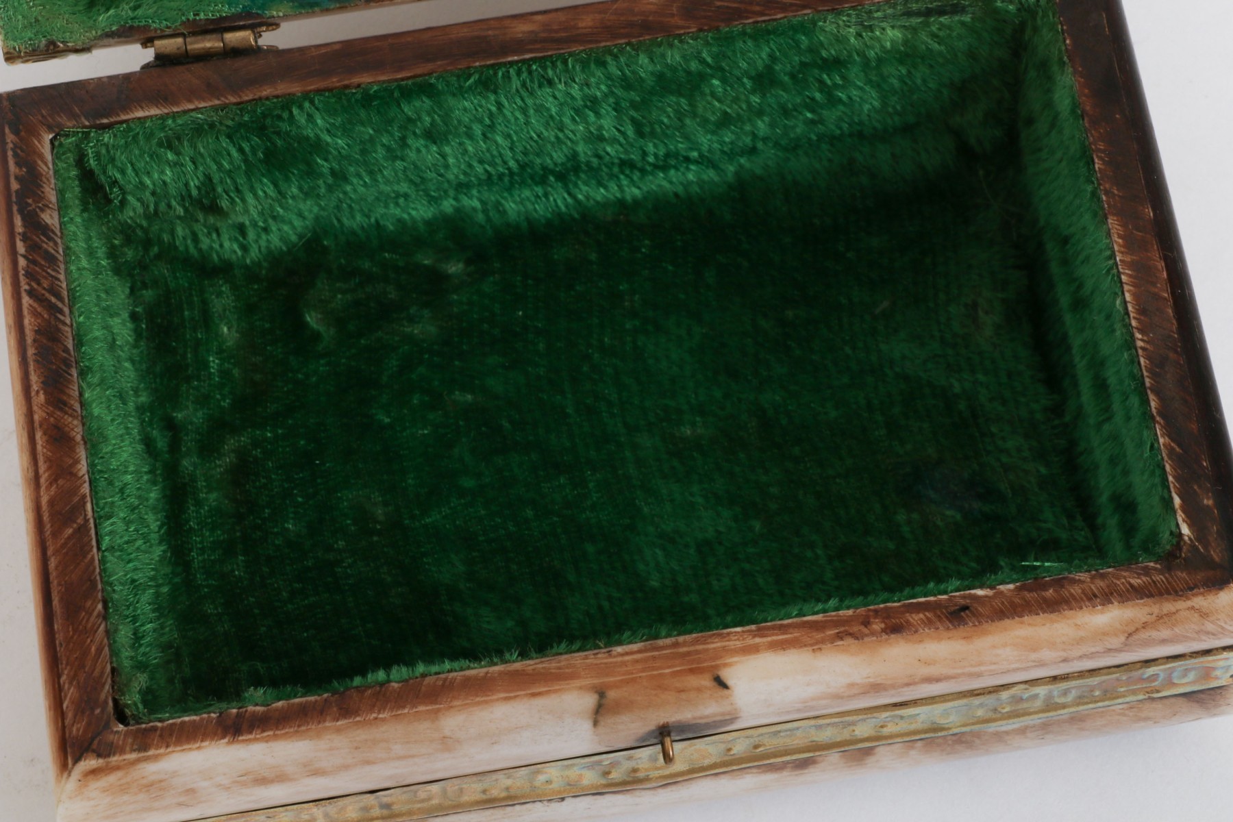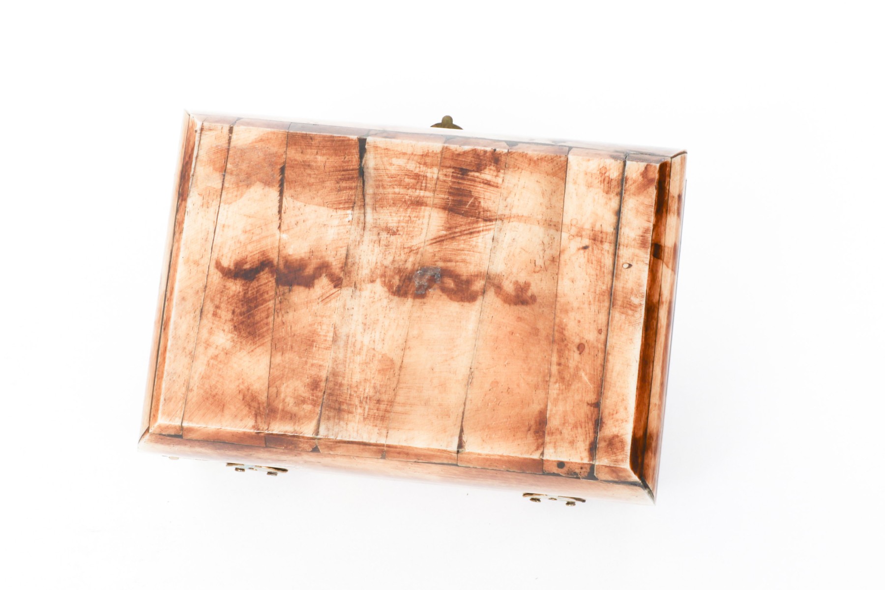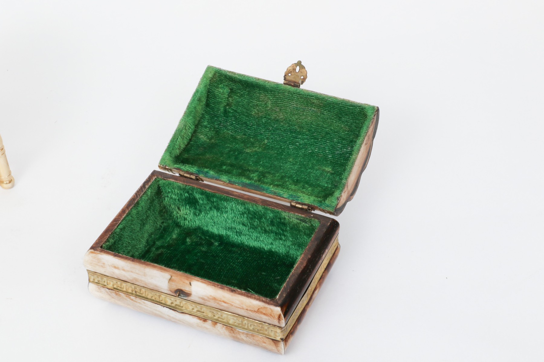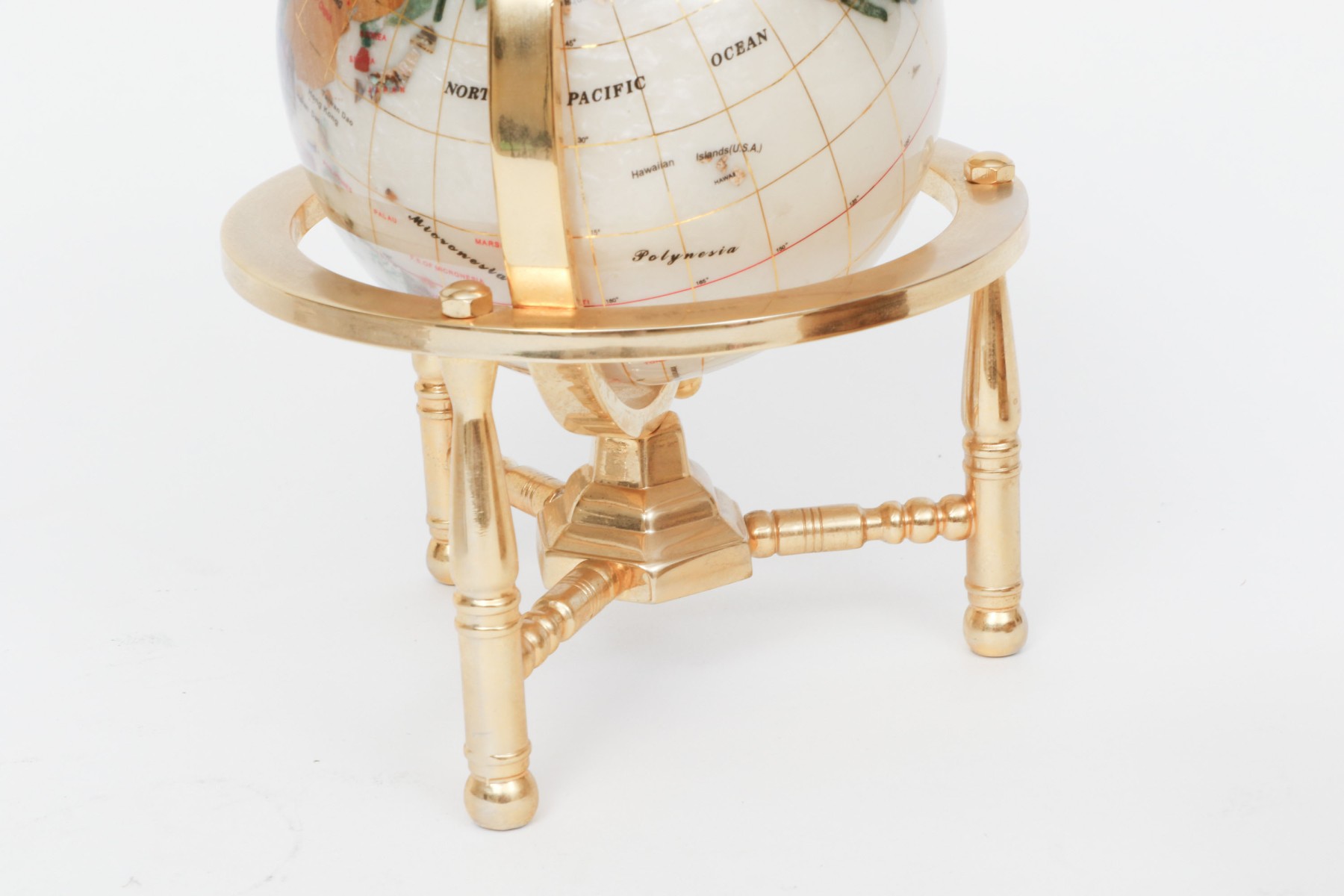 A pretty trio of table top decor. Includes a cut crystal jewelry casket, a ribbed bone and metal hinged jewelry box, and a miniature globe figure inlaid with hardstone.