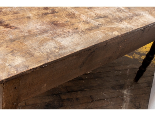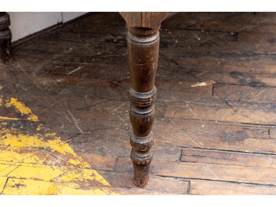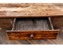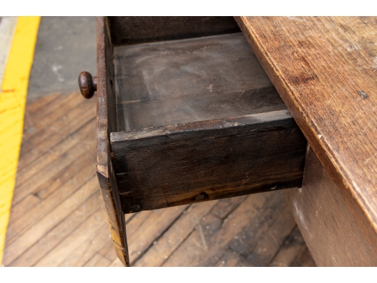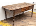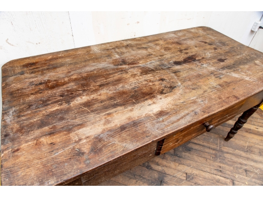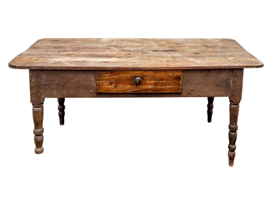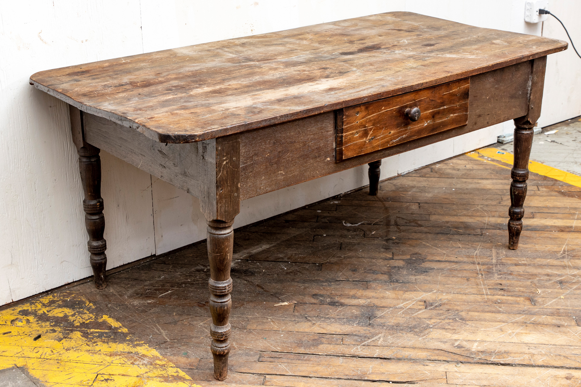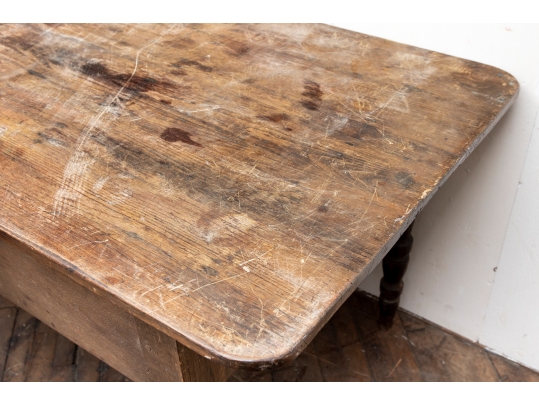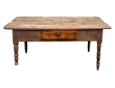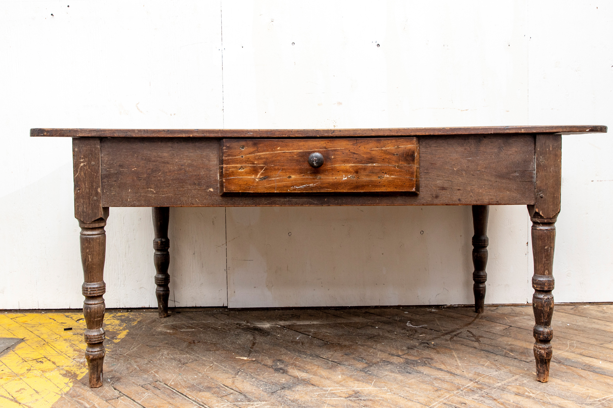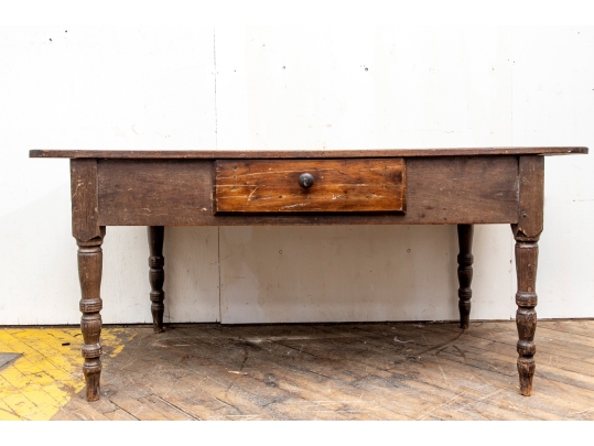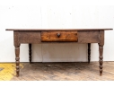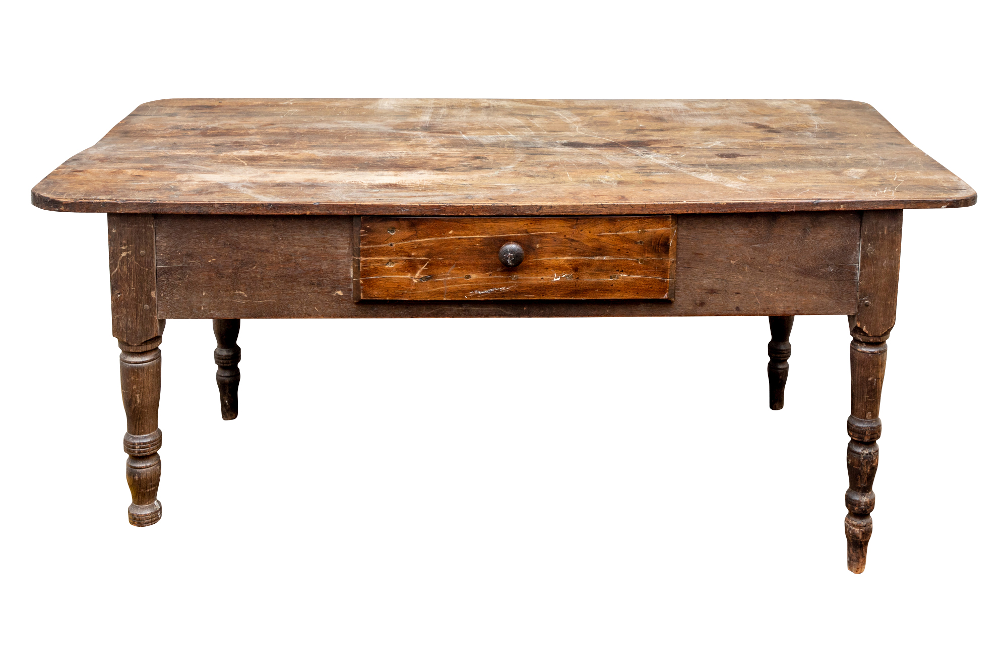 A well-worn country table, the overhanging top with rounded corners and a deep apron with a single drawer with knob pull. Raised on turned legs.