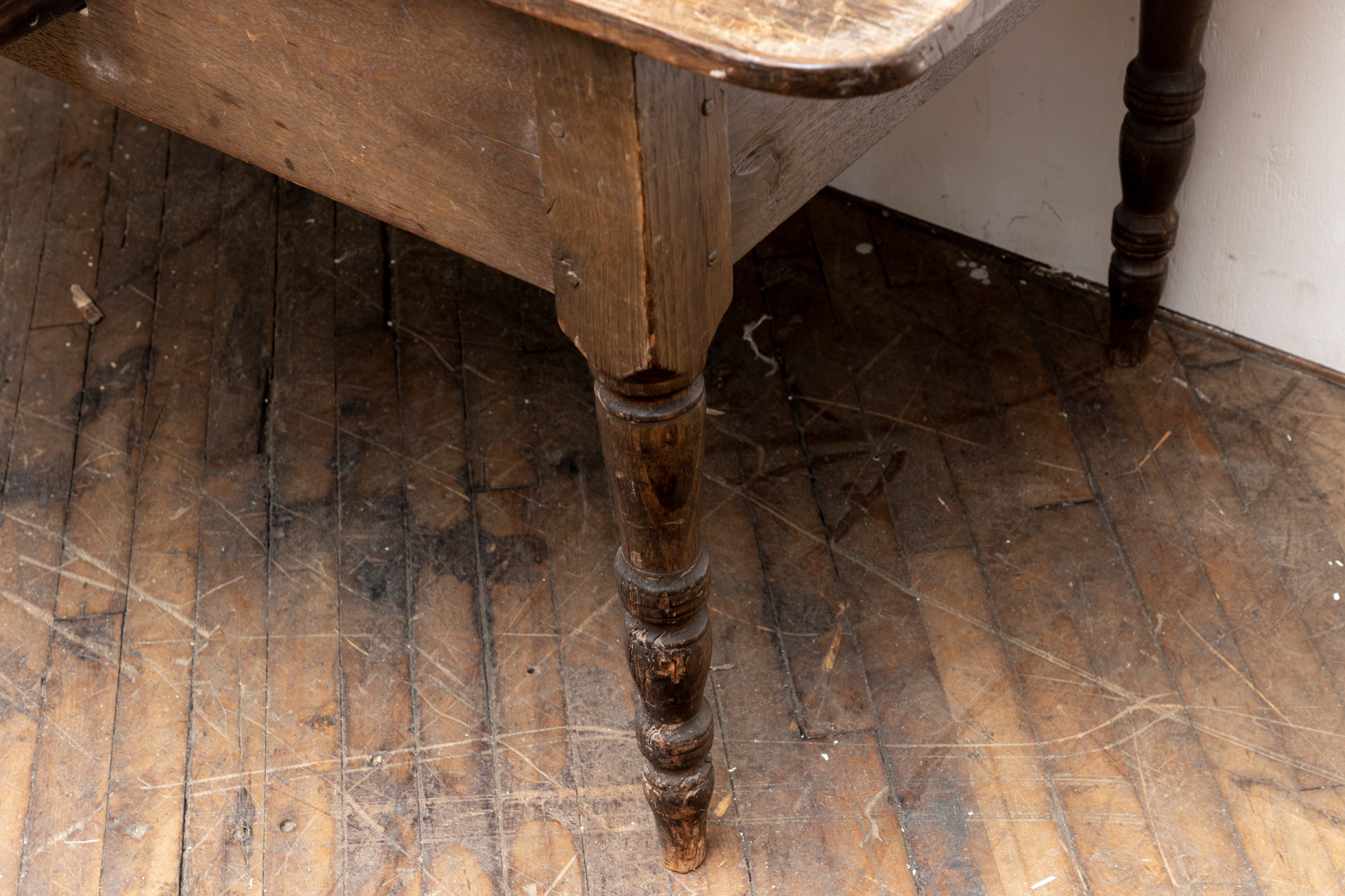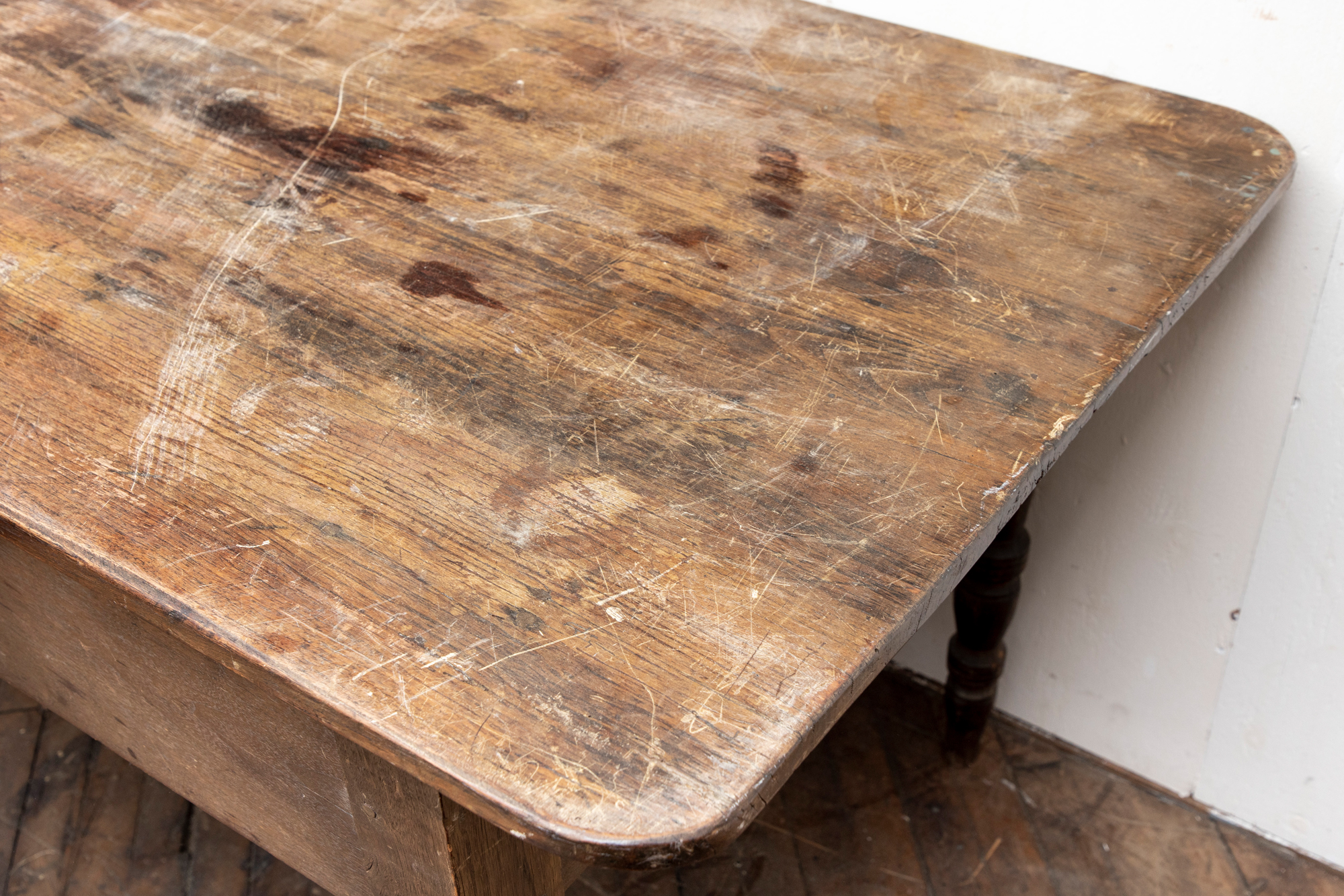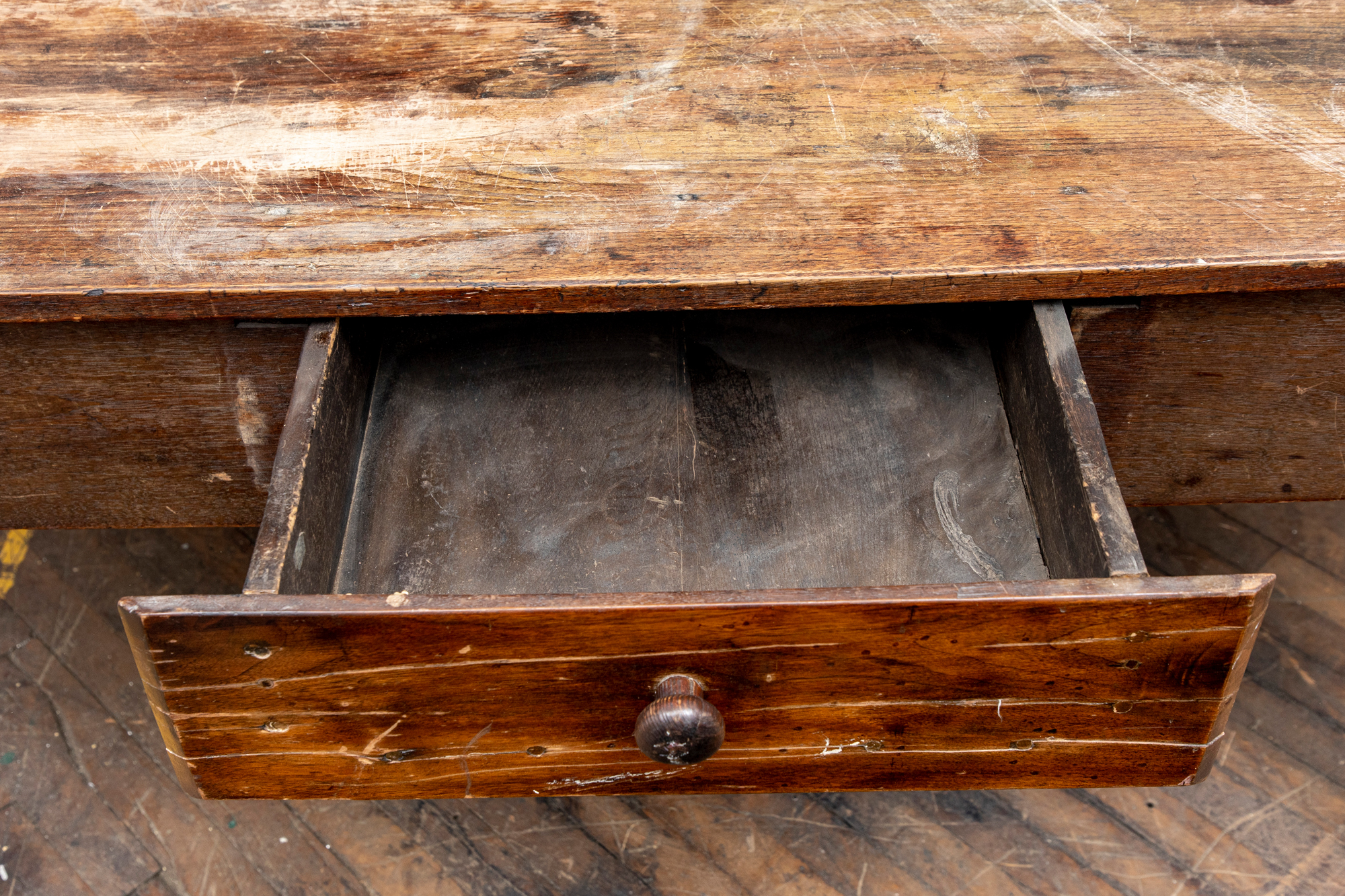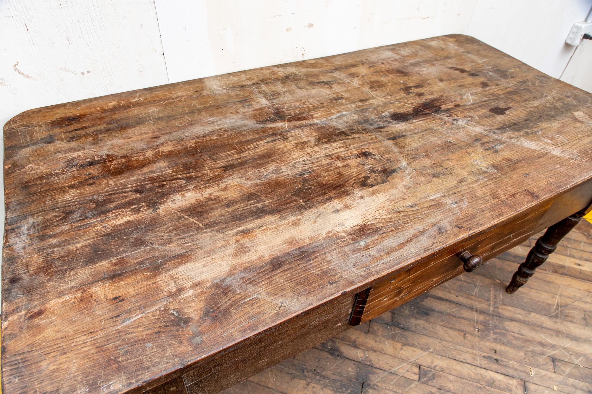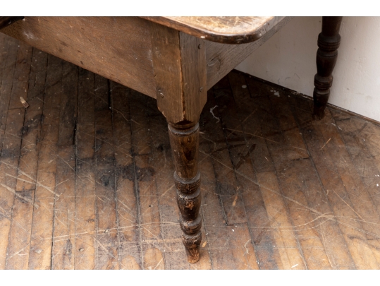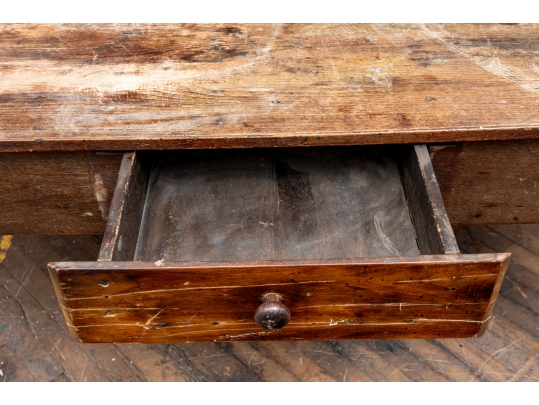A well-worn country table, the overhanging top with rounded corners and a deep apron with a single drawer with knob pull. Raised on turned legs.