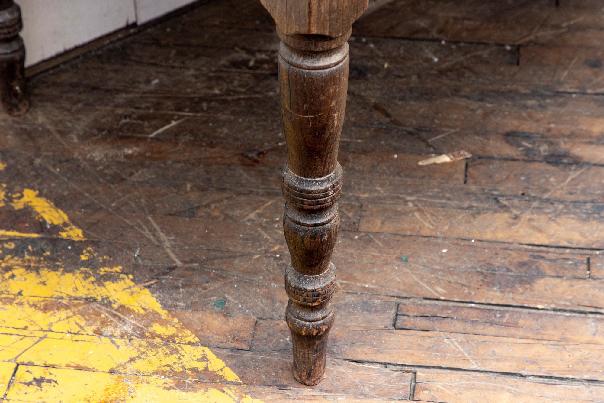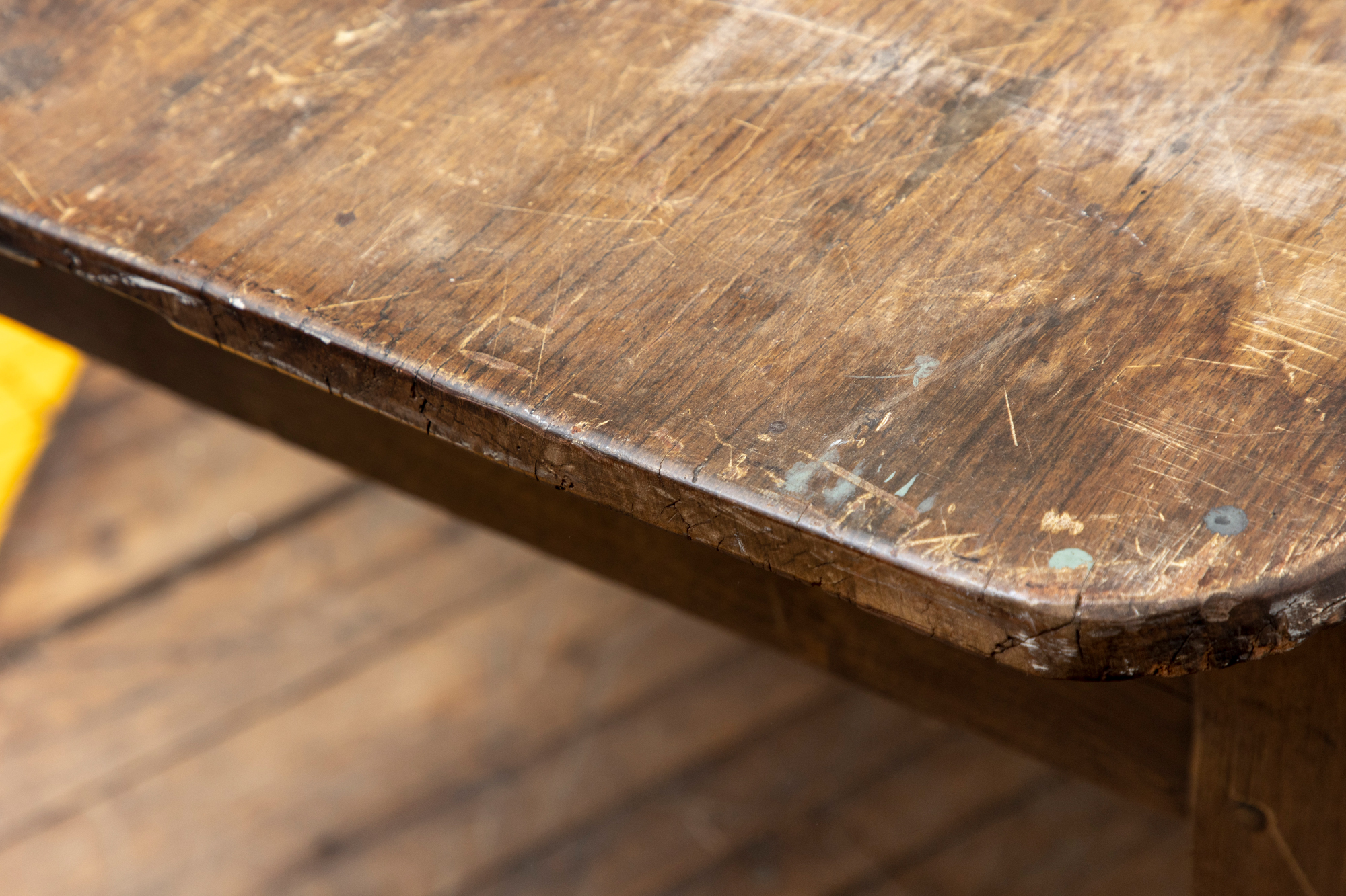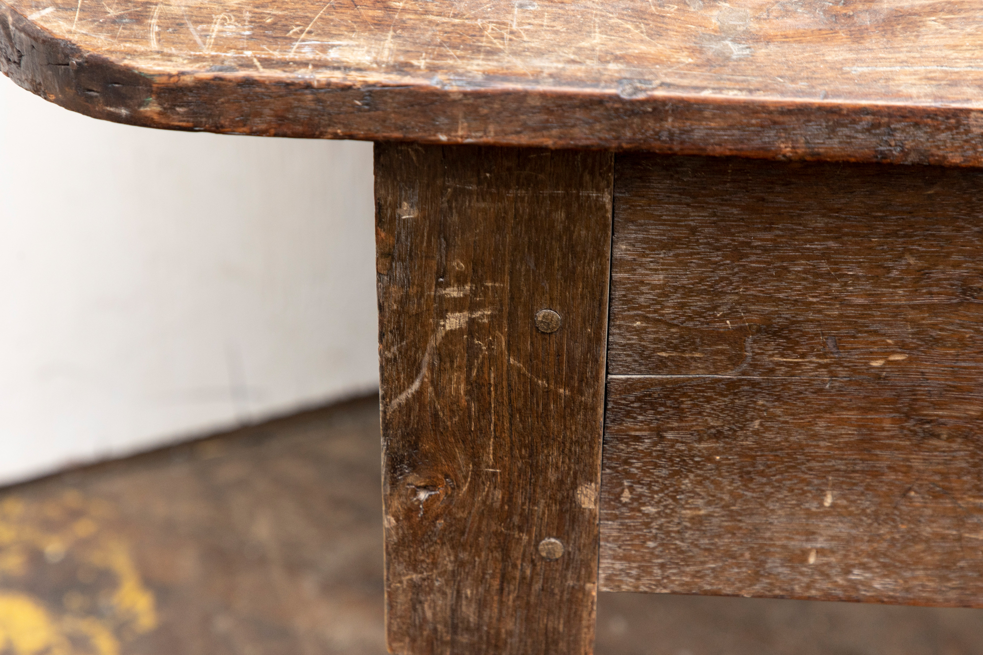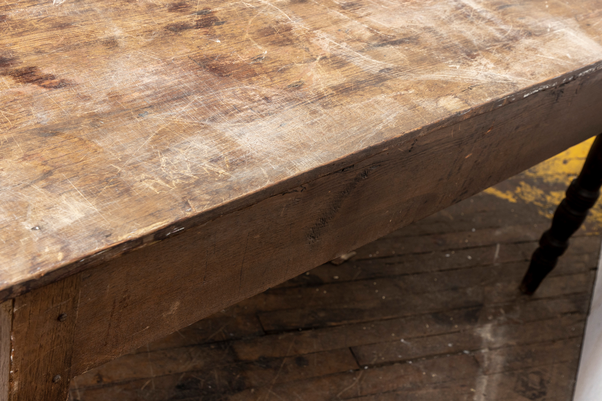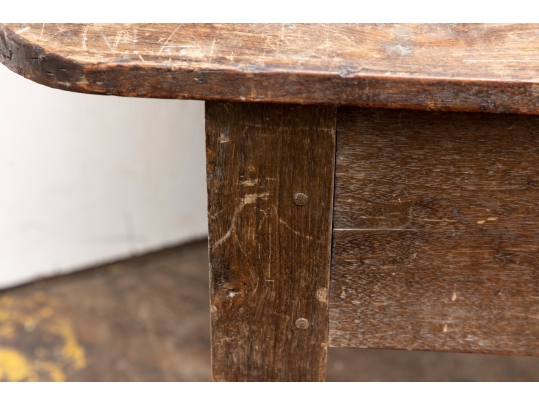 A well-worn country table, the overhanging top with rounded corners and a deep apron with a single drawer with knob pull. Raised on turned legs.
