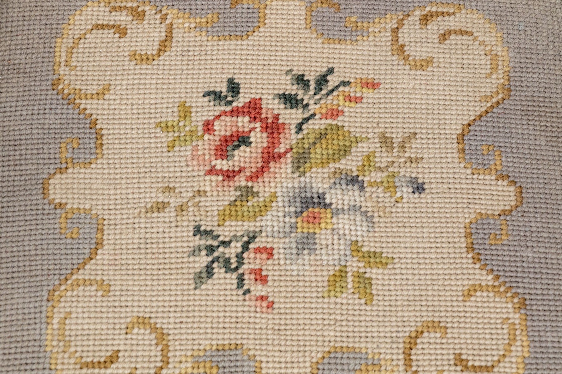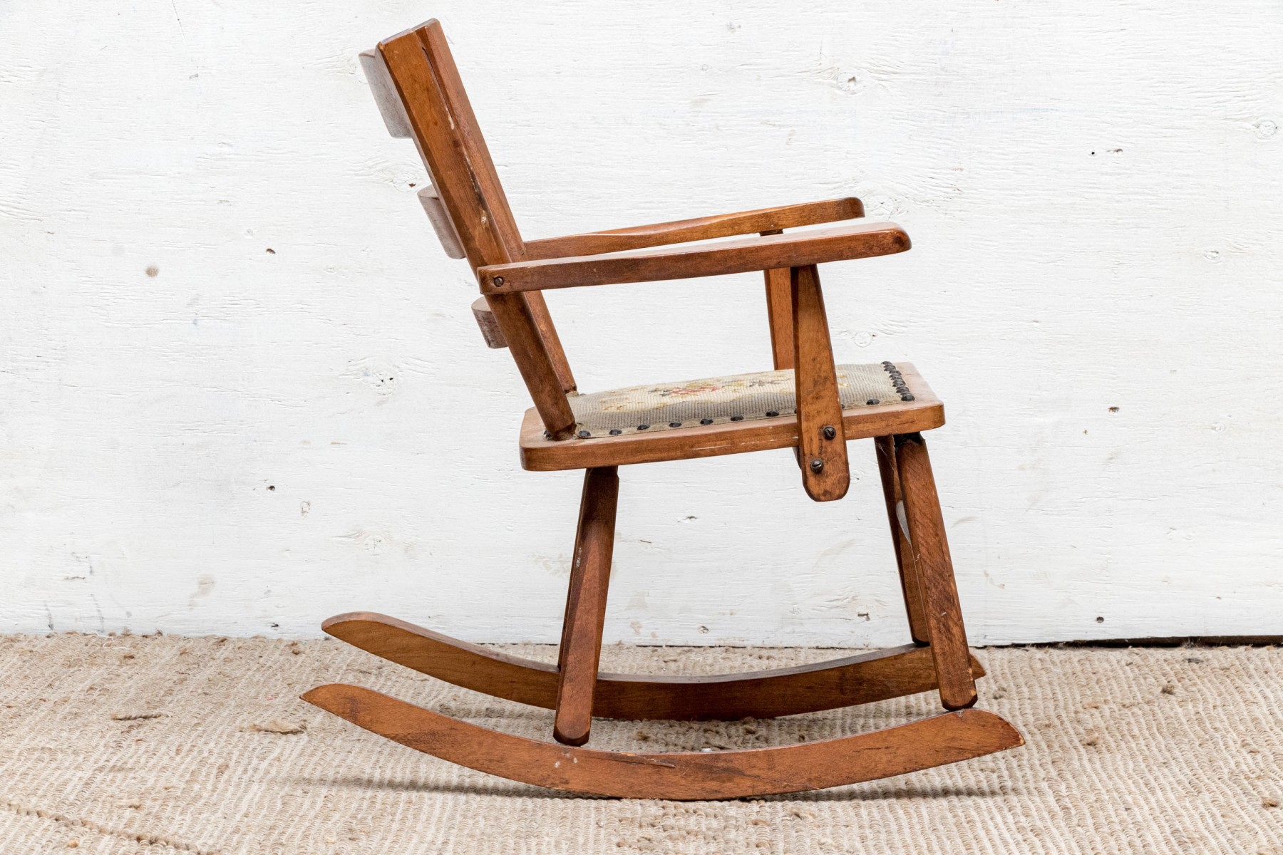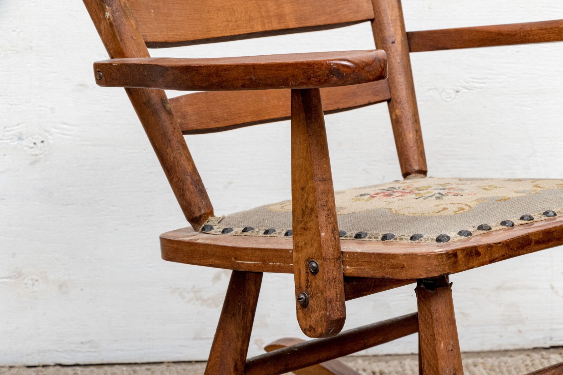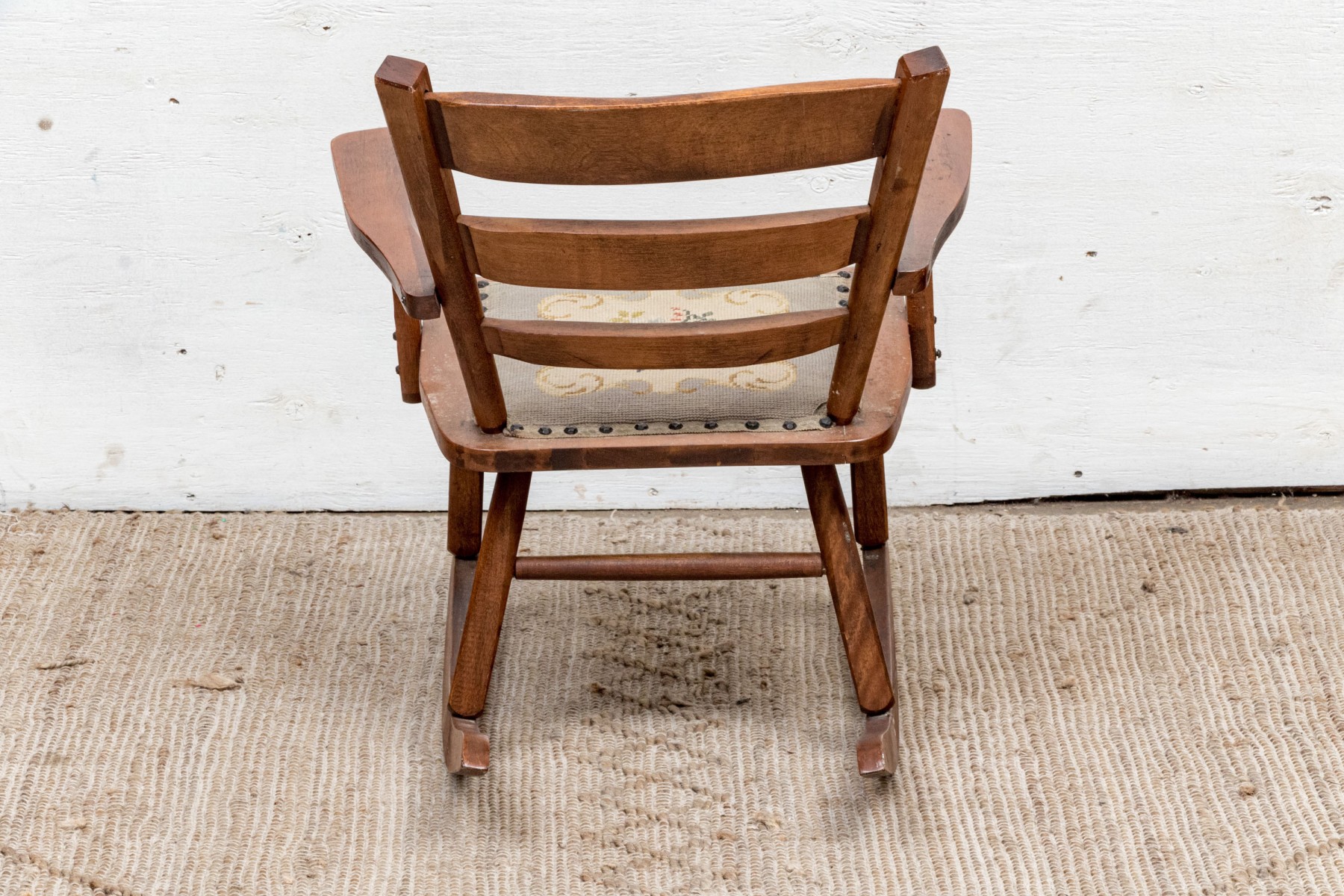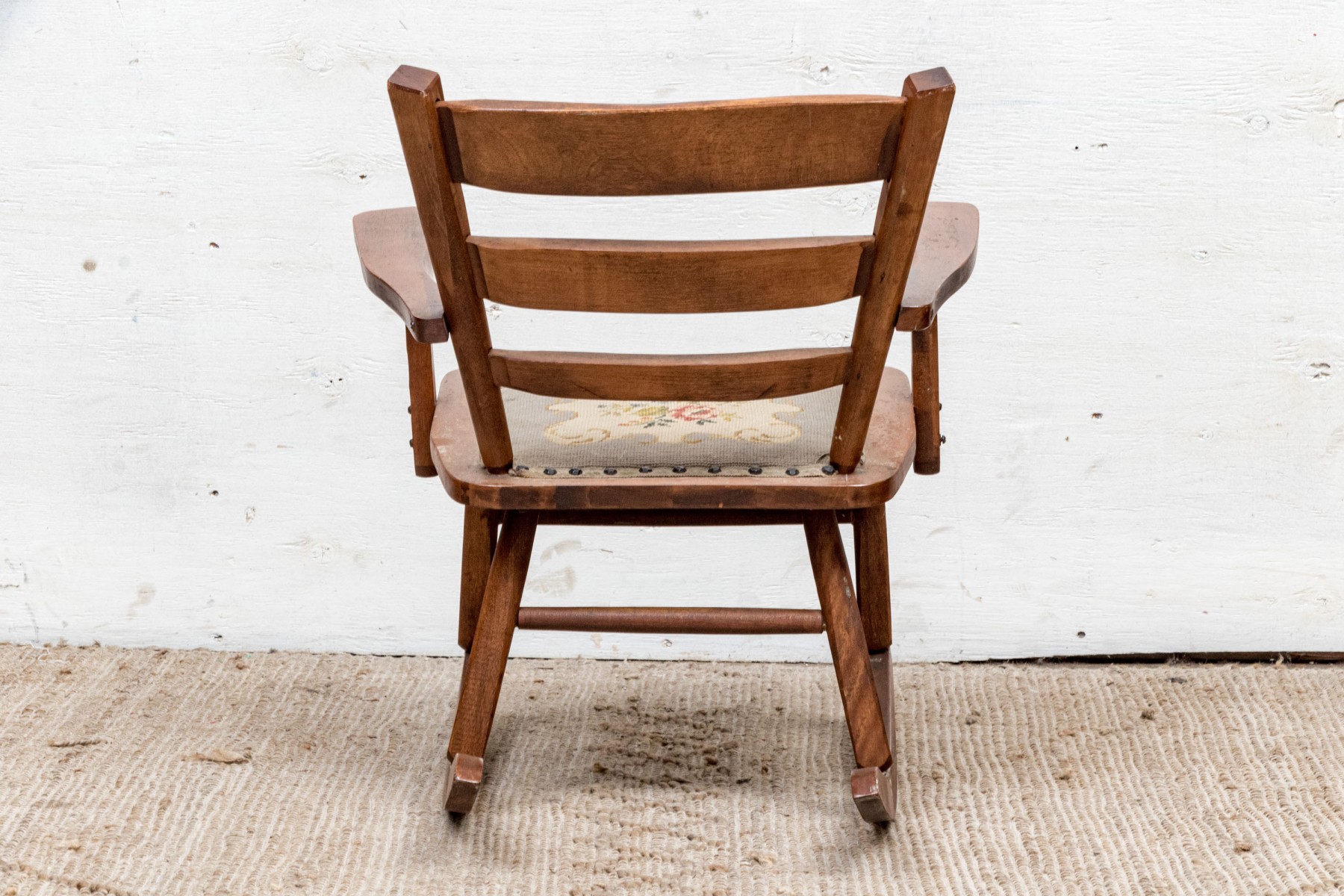 The back with two out-splayed stiles centering three graduated slats, the seat frame below fitted with a needlework covered cushion, on turned legs joined by stretchers, on rockers.