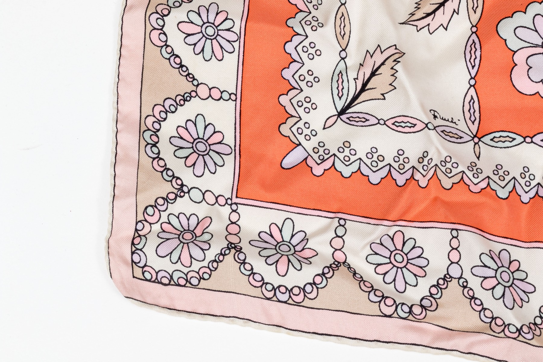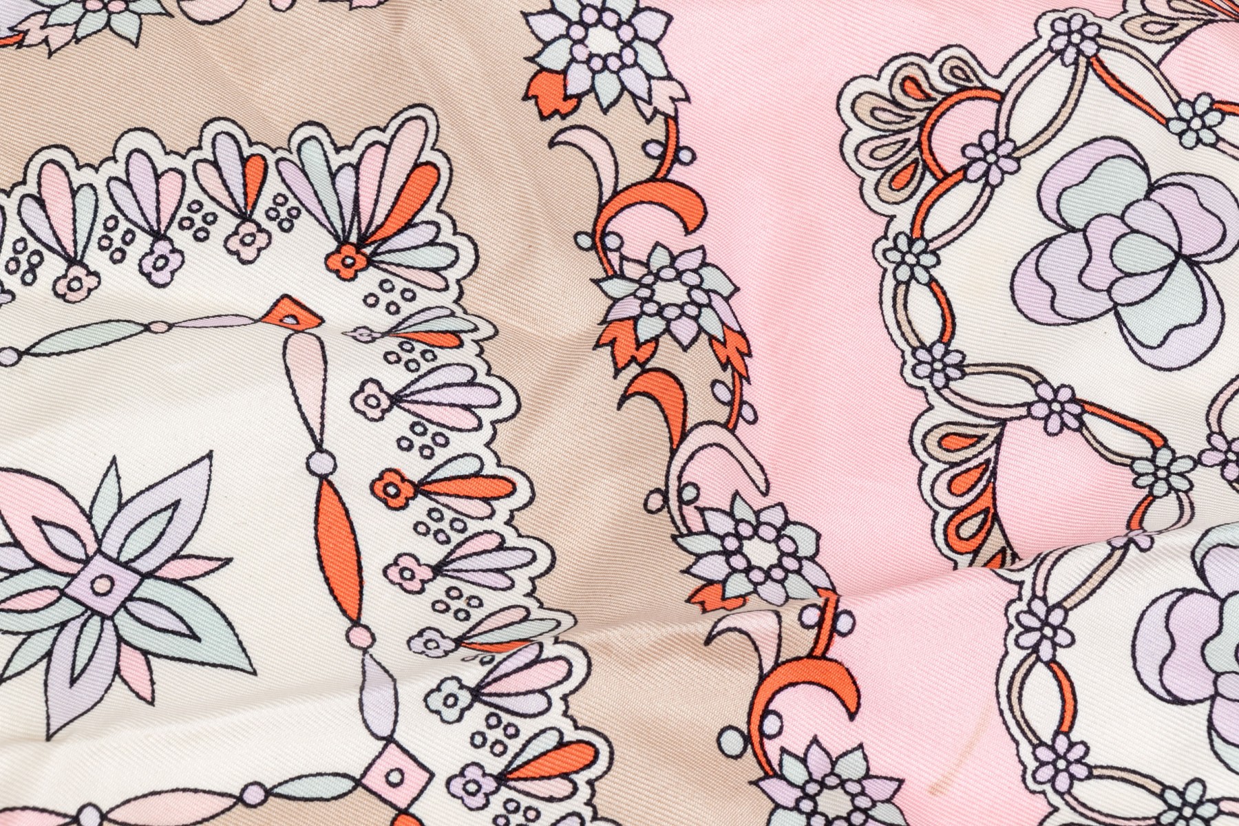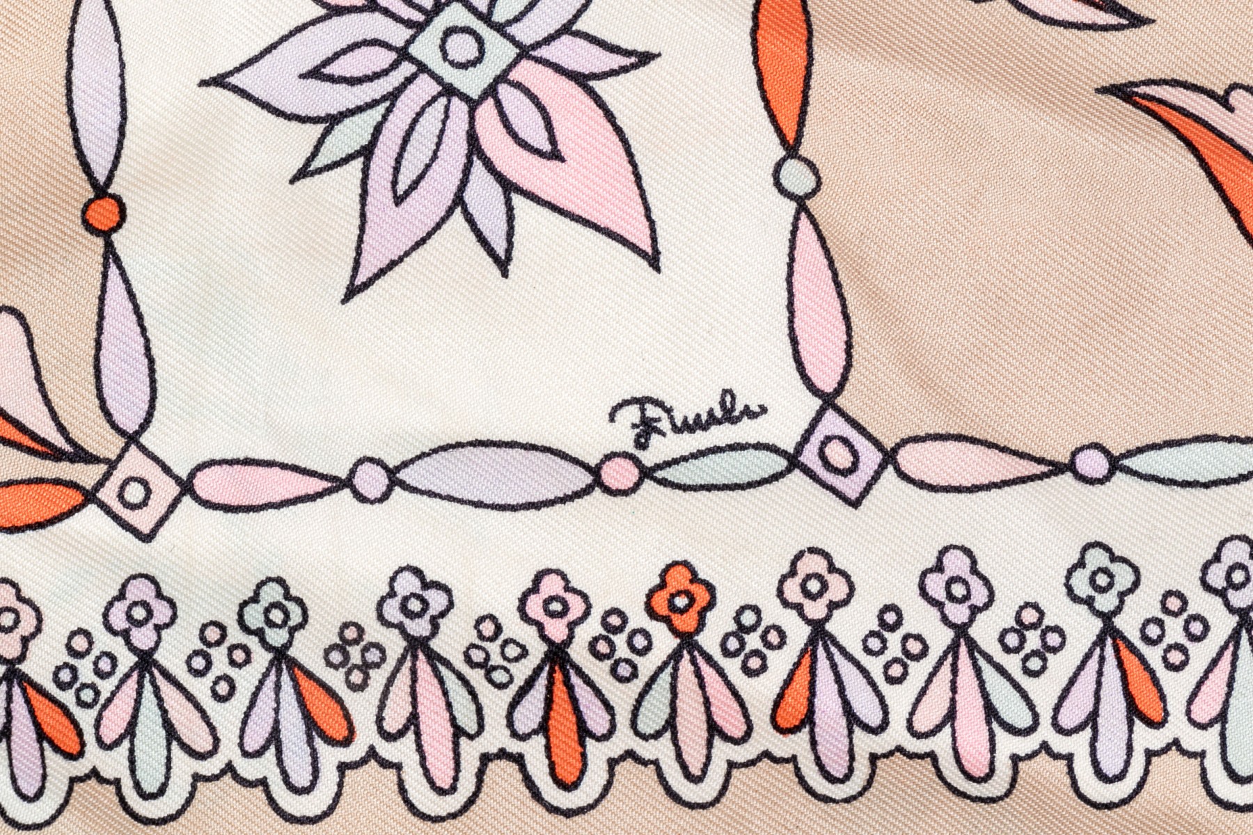 Pucci pretty pink, coral and tan vintage floral patterned motif silk scarf