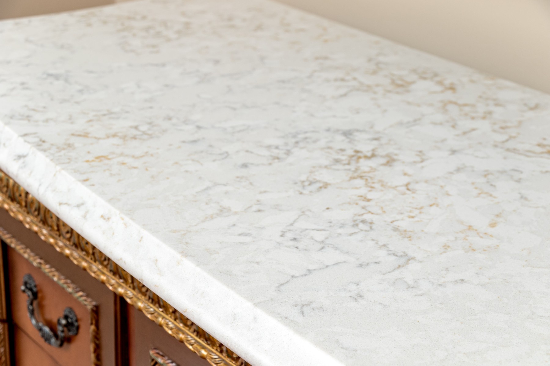 A lavishly decorated Pulaski "Bellissimo" dresser designed with ornate Renaissance and Baroque influence. The dresser sports a sleek white marble top with fine gray and orange veining, set over a central bay of three drawer and smaller stacks of three drawers on either side, all beautifully paneled with opulent gilt carved relief borders. The drawers are flanked by fluted column motifs leading down to three additional drawers below, raised over gilt bun on peg feet.