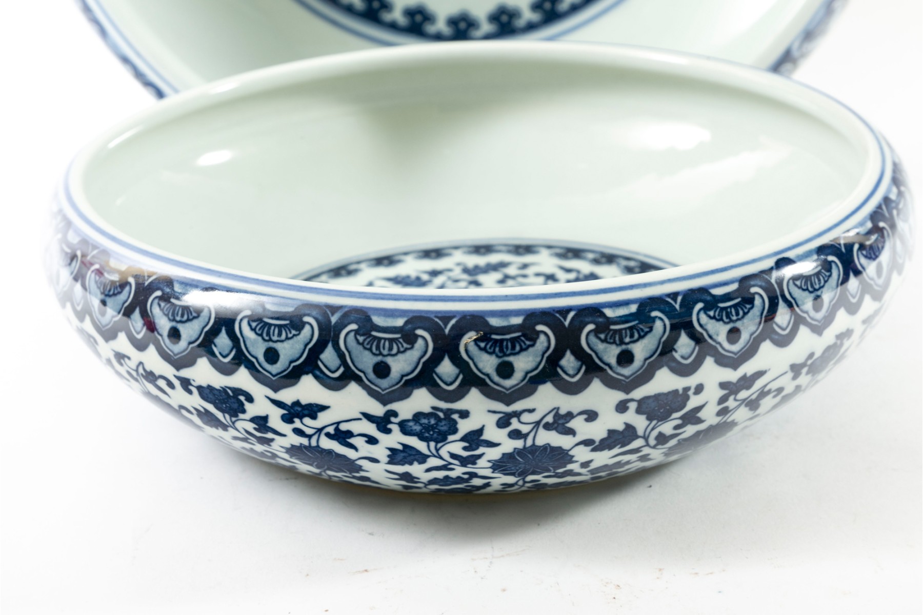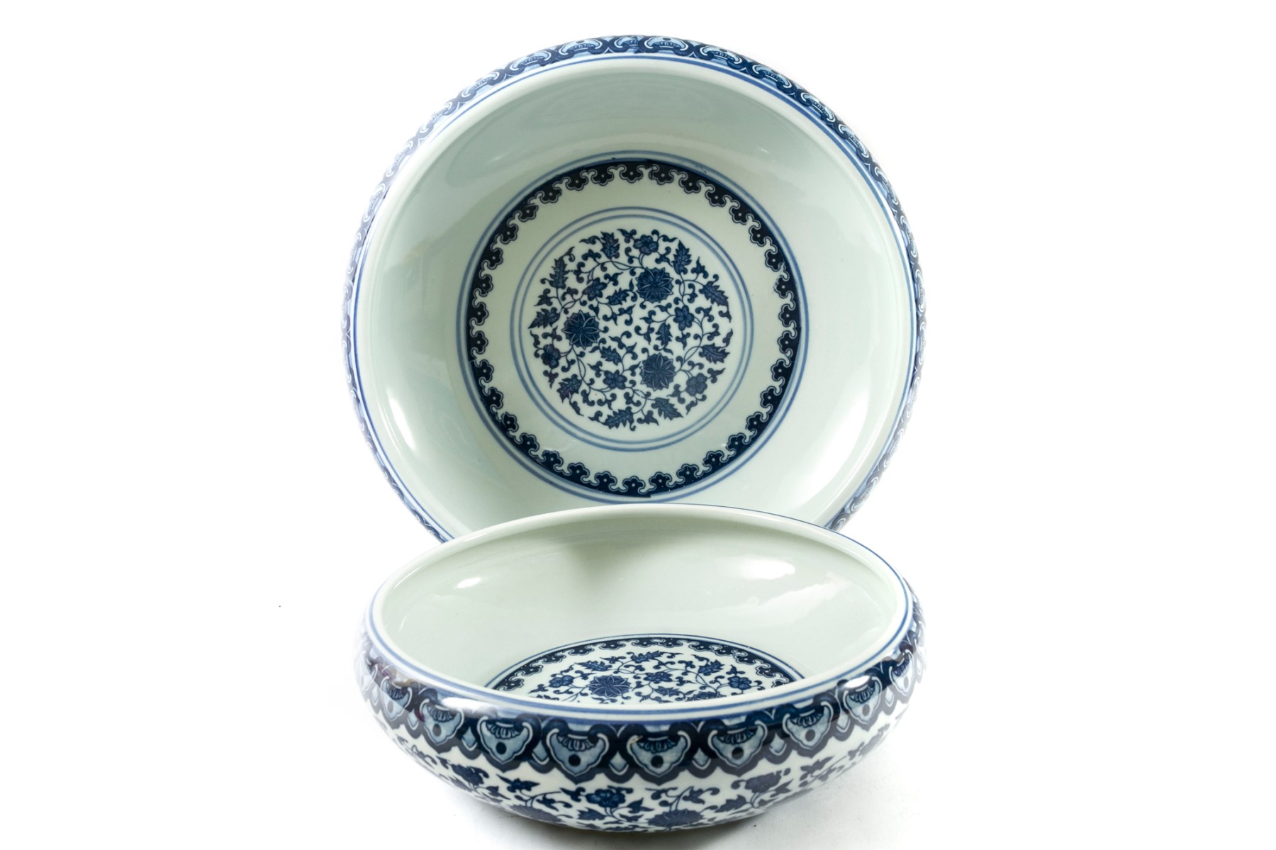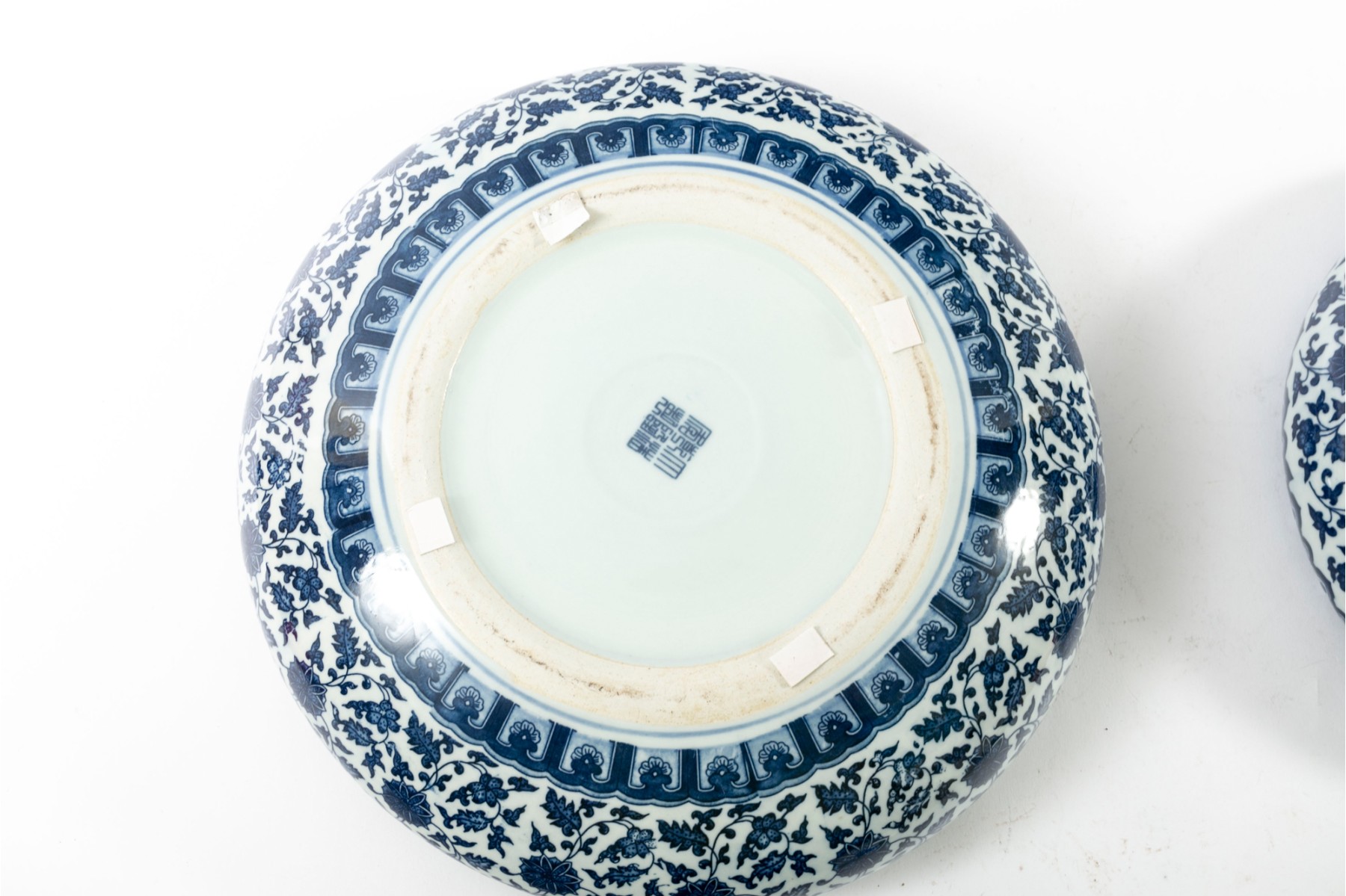Two porcelain bowls boasting the Qianlong reign mark in underglaze blue in addition to sprawling floral and foliate vine patterns. Antique — Qing Dynasty (1644 - 1912).