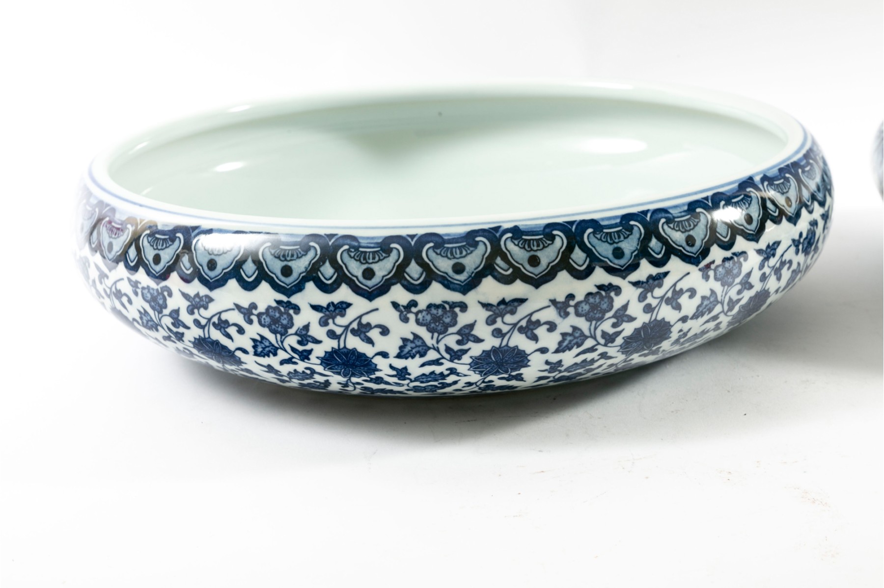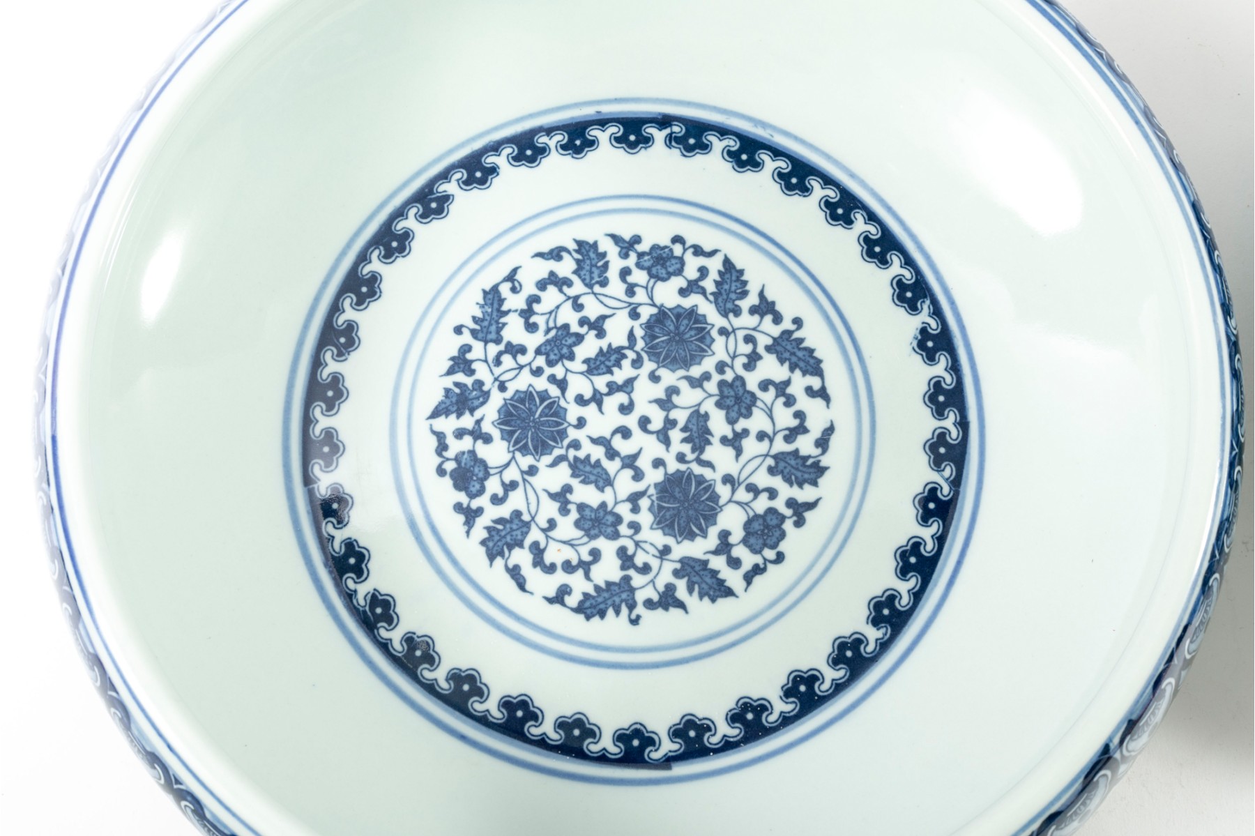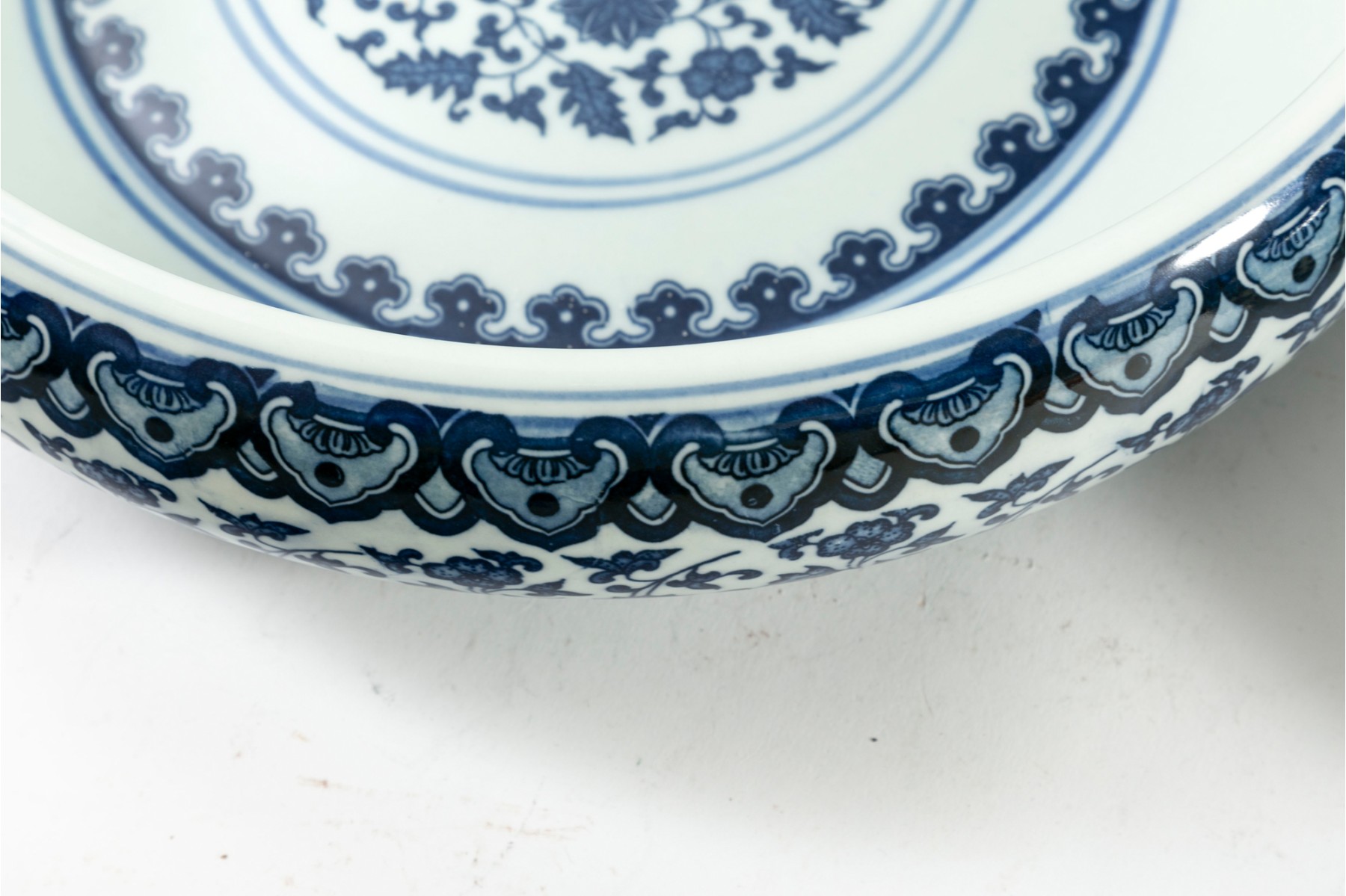 Two porcelain bowls boasting the Qianlong reign mark in underglaze blue in addition to sprawling floral and foliate vine patterns. Antique — Qing Dynasty (1644 - 1912).