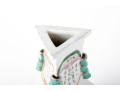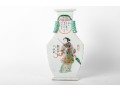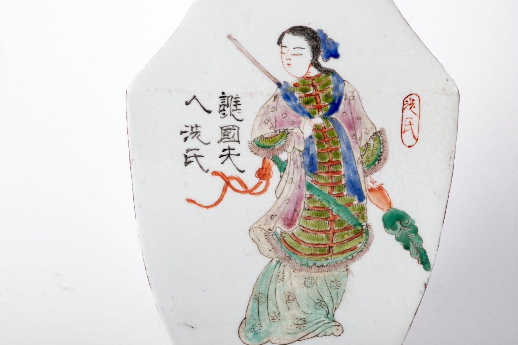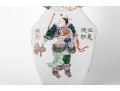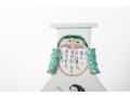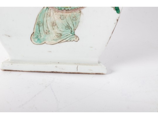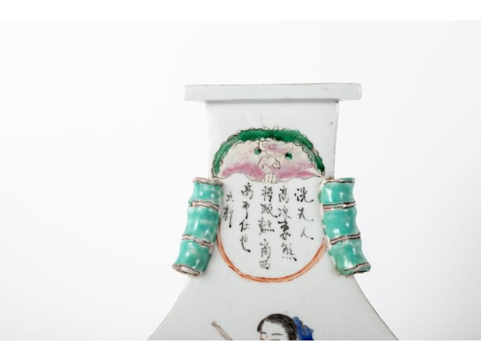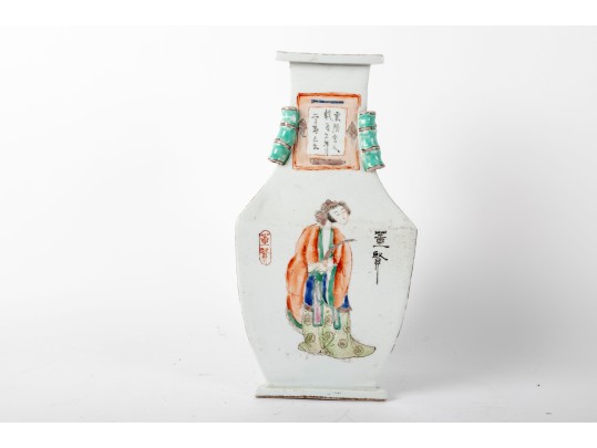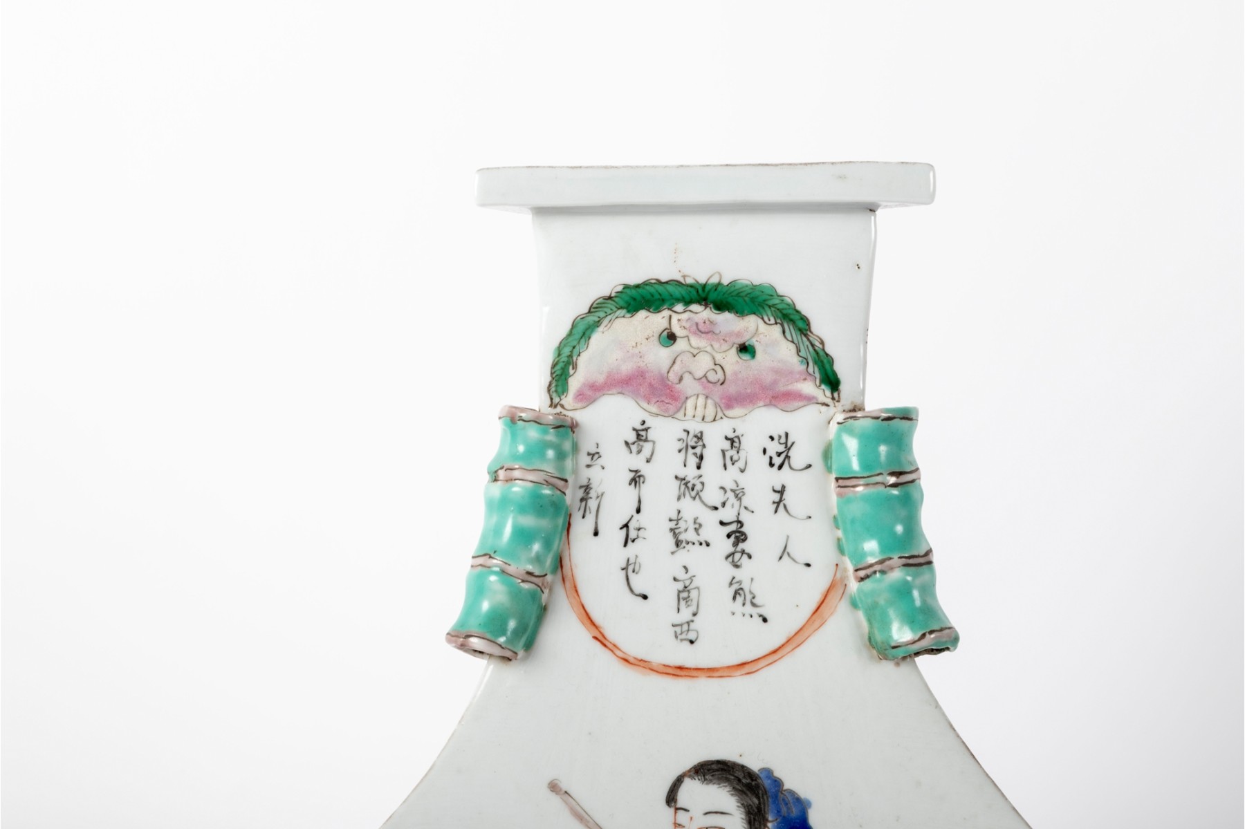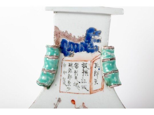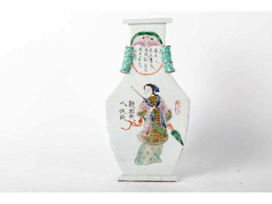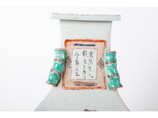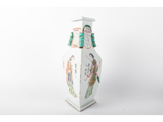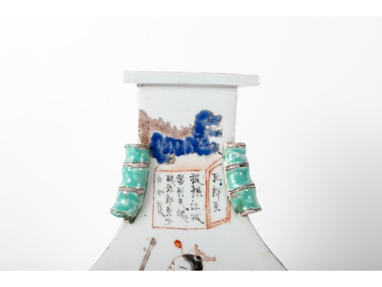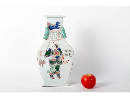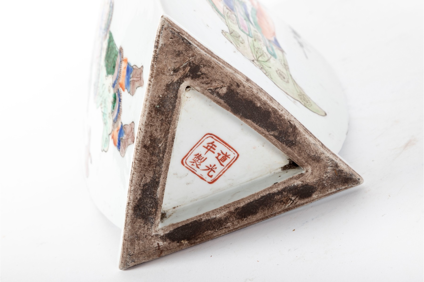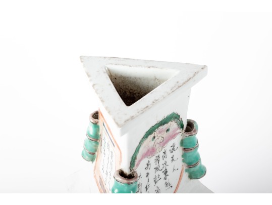 Late 19th-century Qing Dynasty porcelain vase with a triangular form. Each side features hand-painted scenes of nobles and warriors, along with calligraphic elements. an iron red mark can be found at the bottom -- see photos for details.