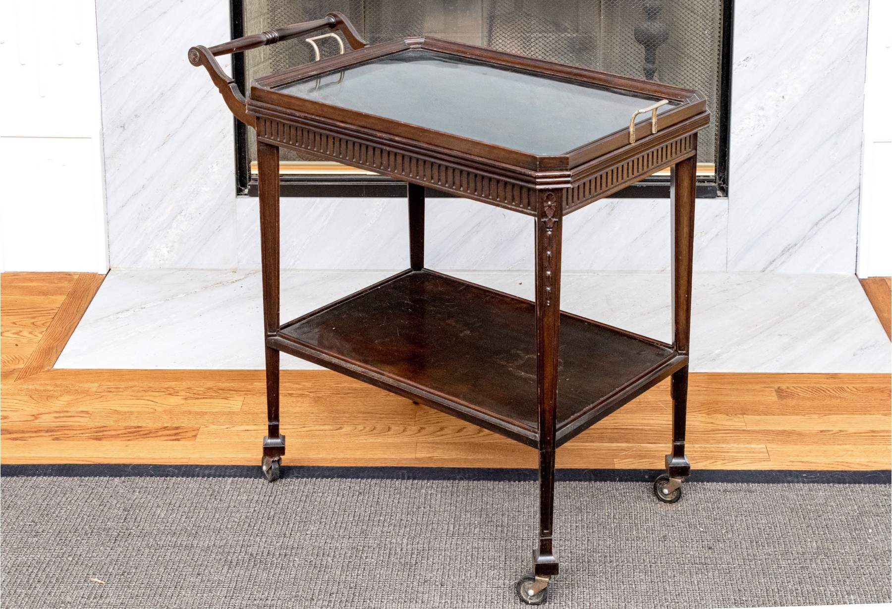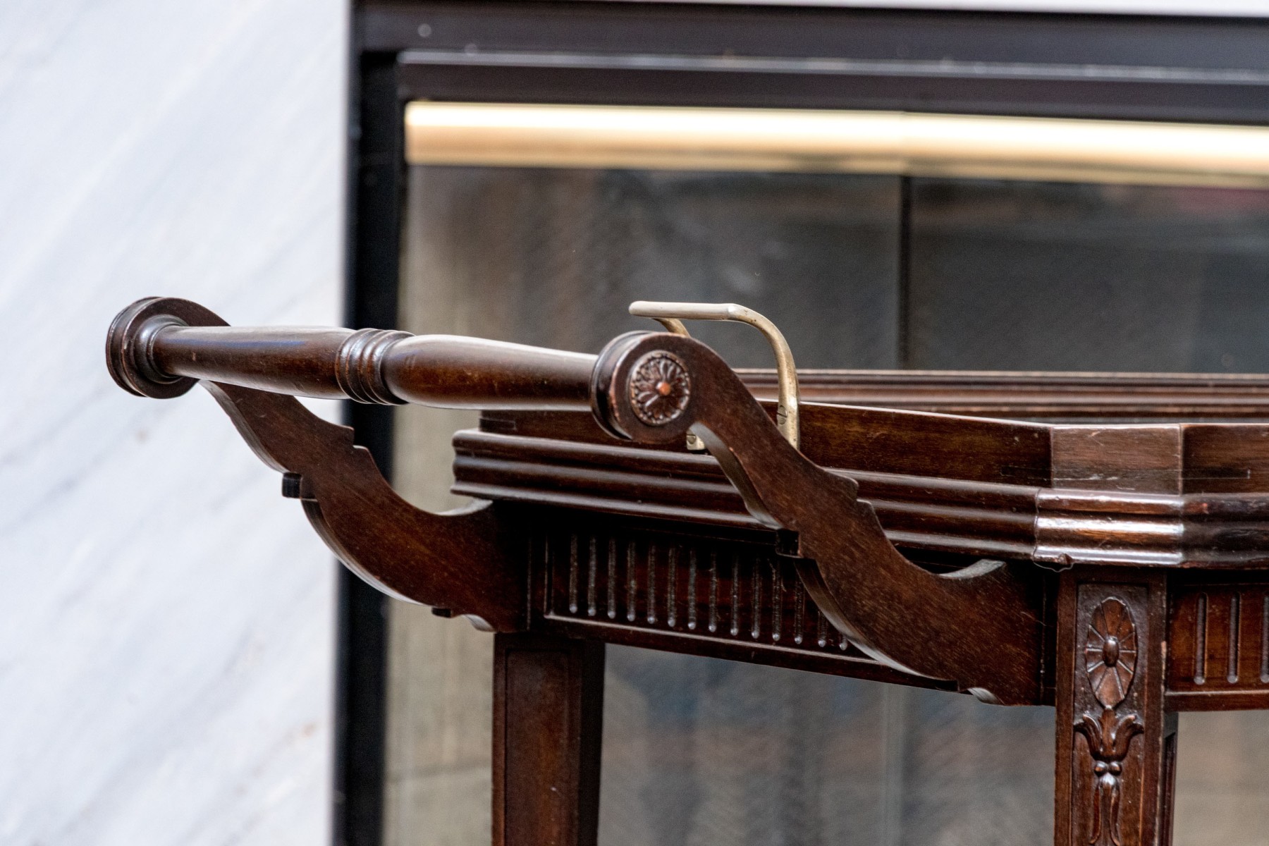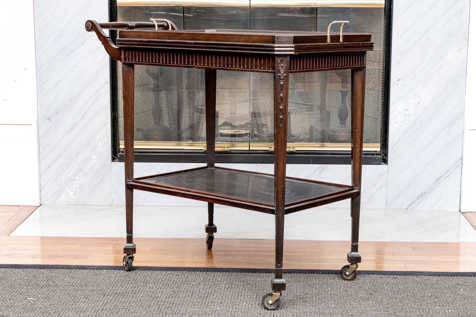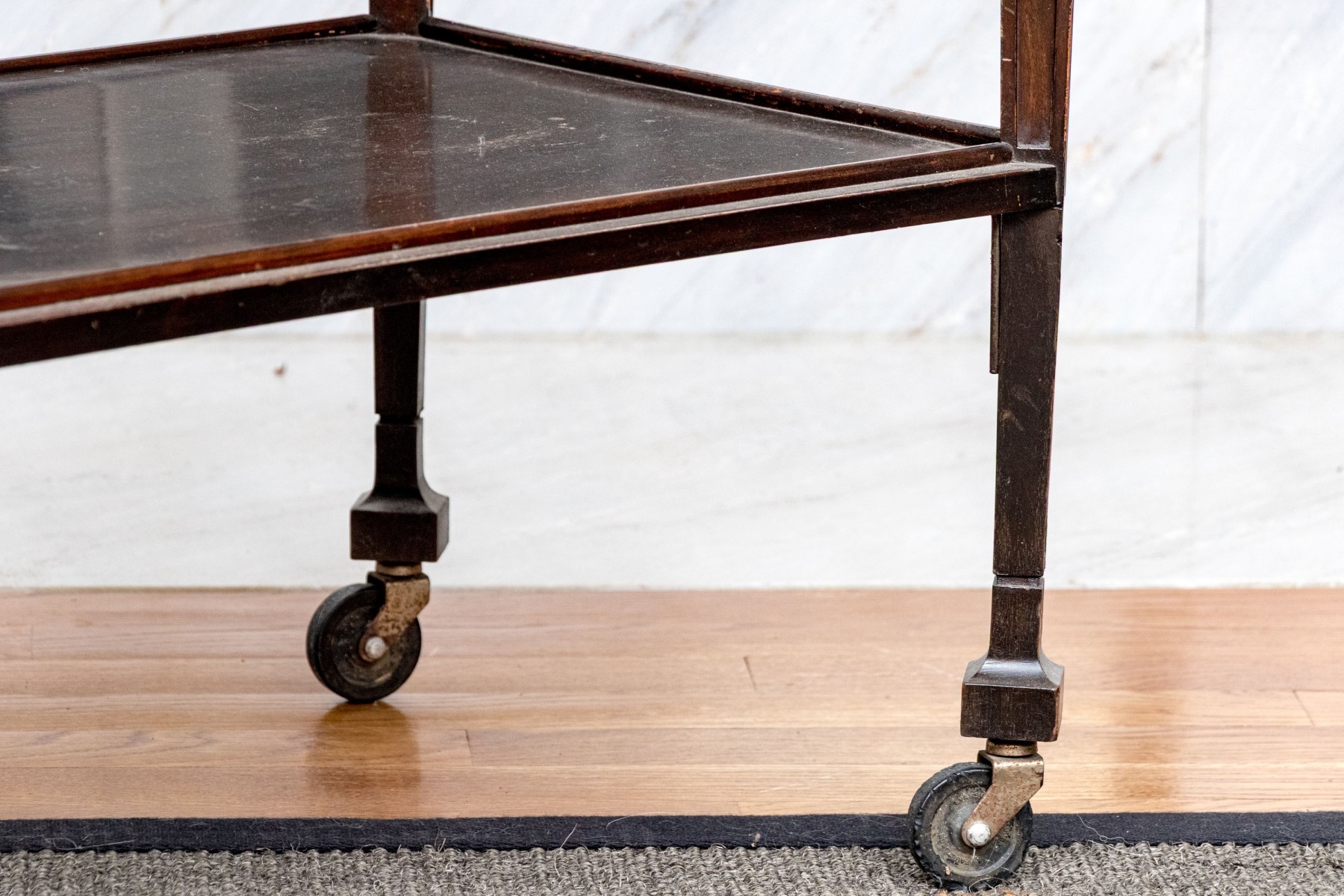 On four carved legs terminating in squared feet mounted with casters. The cart has two tiers with the lower shelf having a low gallery and the upper tier holding a fitted glass mounted wooden serving tray with two brass handles. Carved decoration to the side trims with a nicely carved handle extending from one end with turned handle to push.