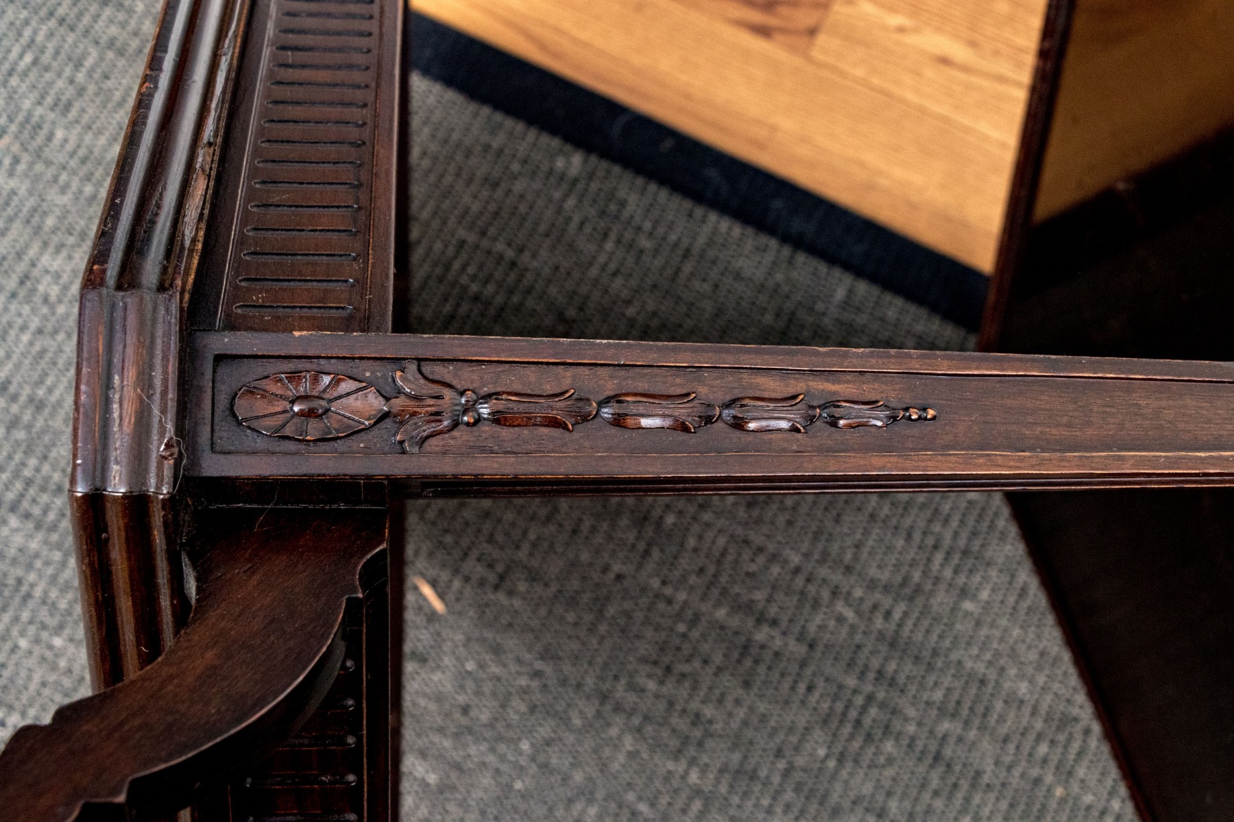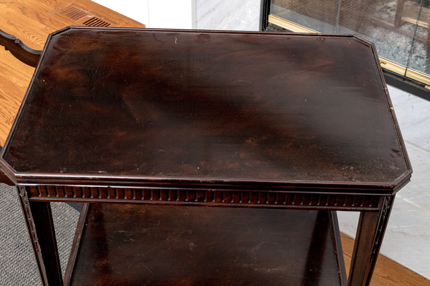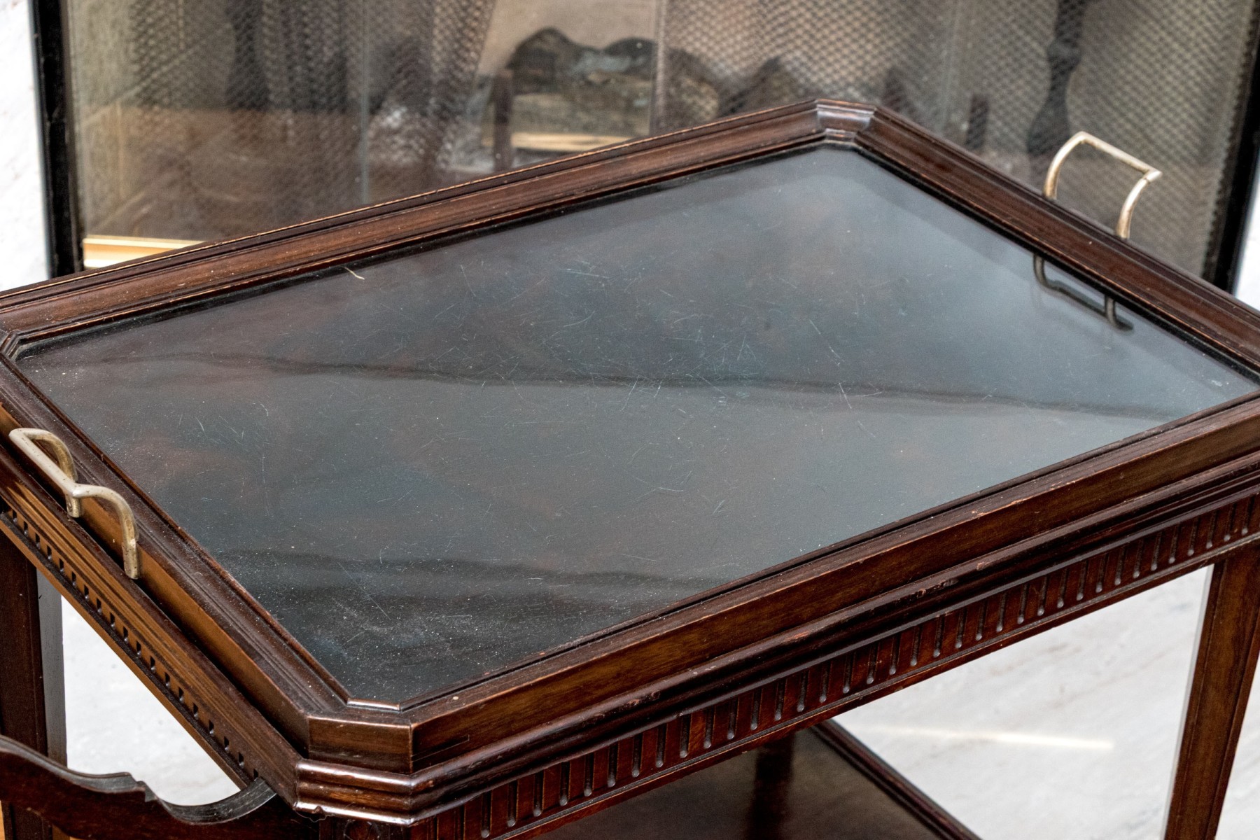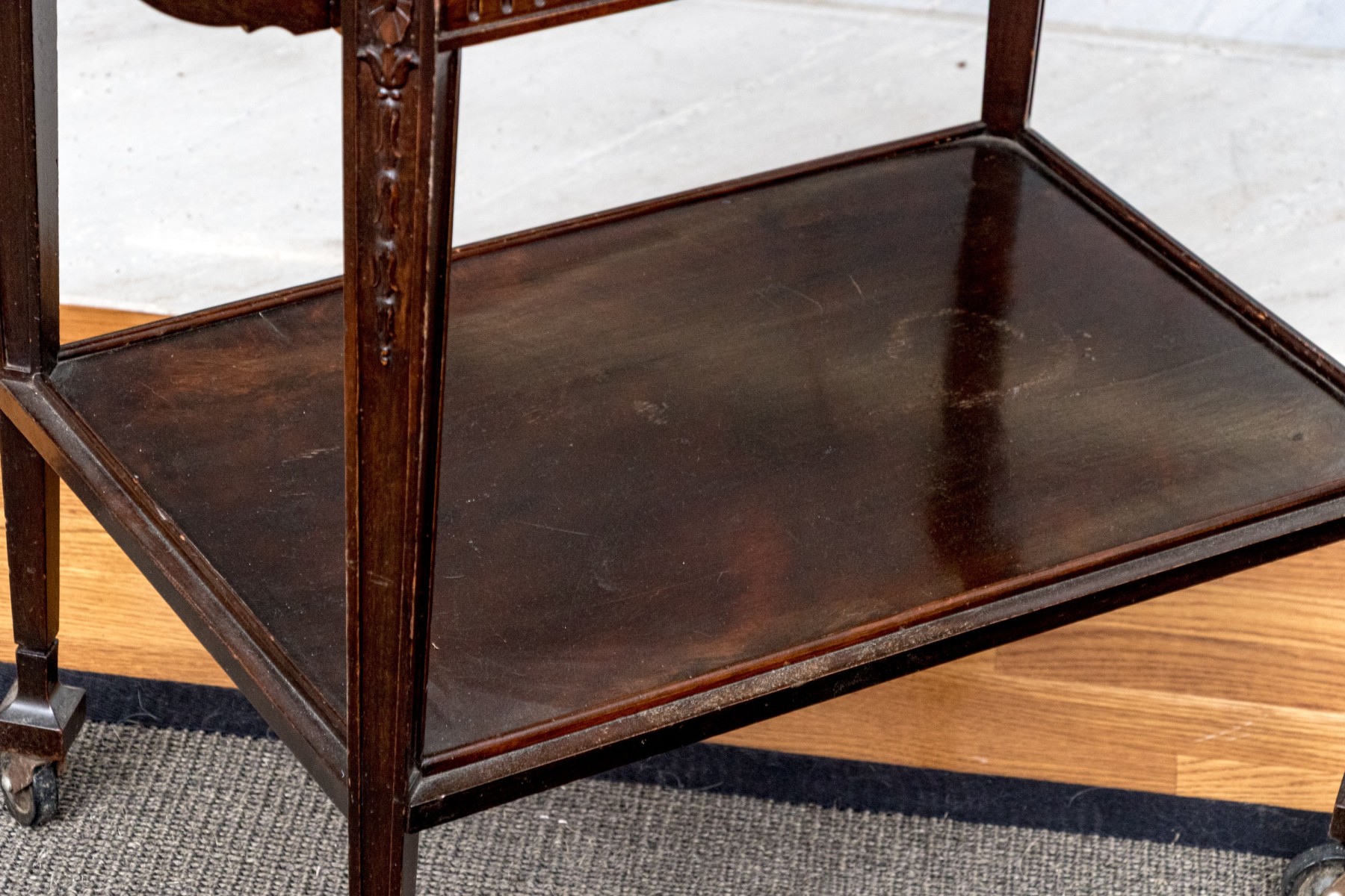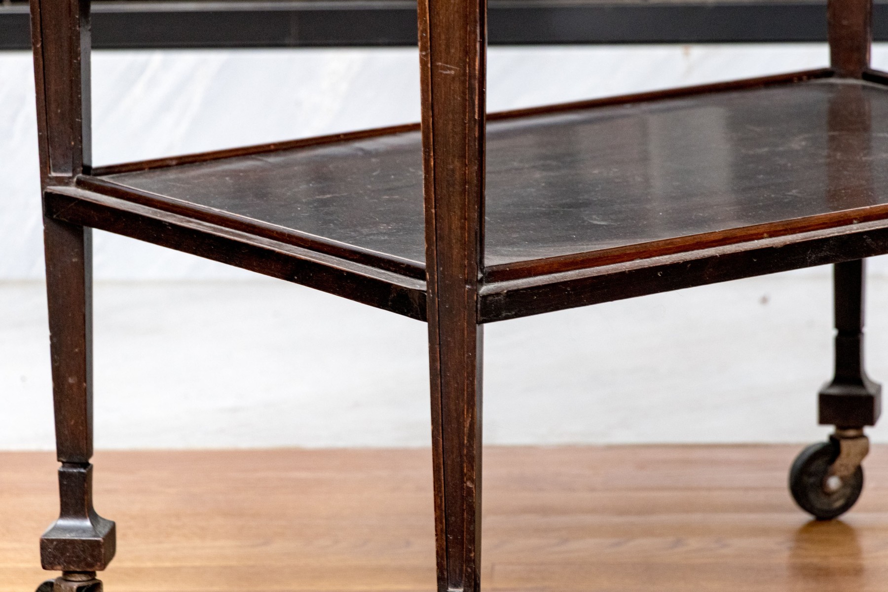 On four carved legs terminating in squared feet mounted with casters. The cart has two tiers with the lower shelf having a low gallery and the upper tier holding a fitted glass mounted wooden serving tray with two brass handles. Carved decoration to the side trims with a nicely carved handle extending from one end with turned handle to push.