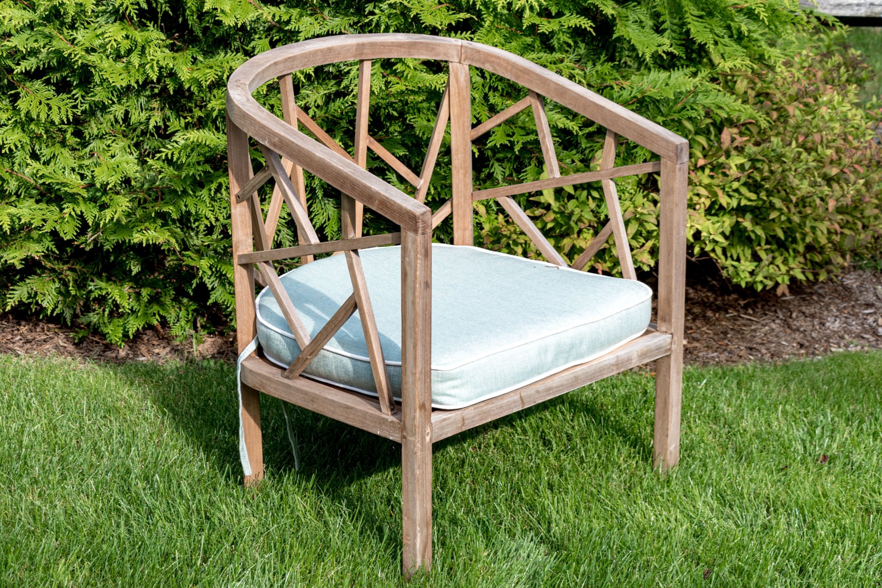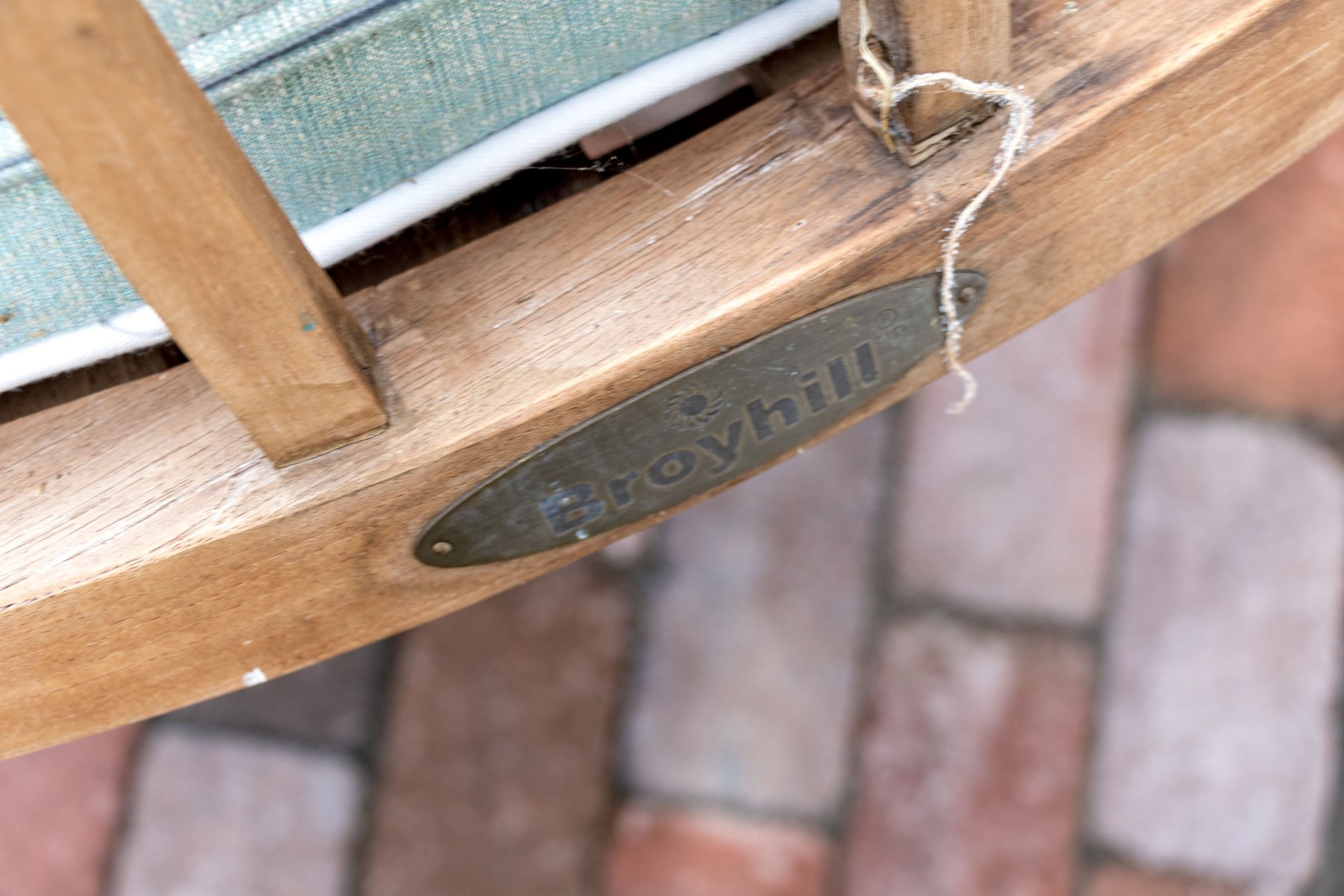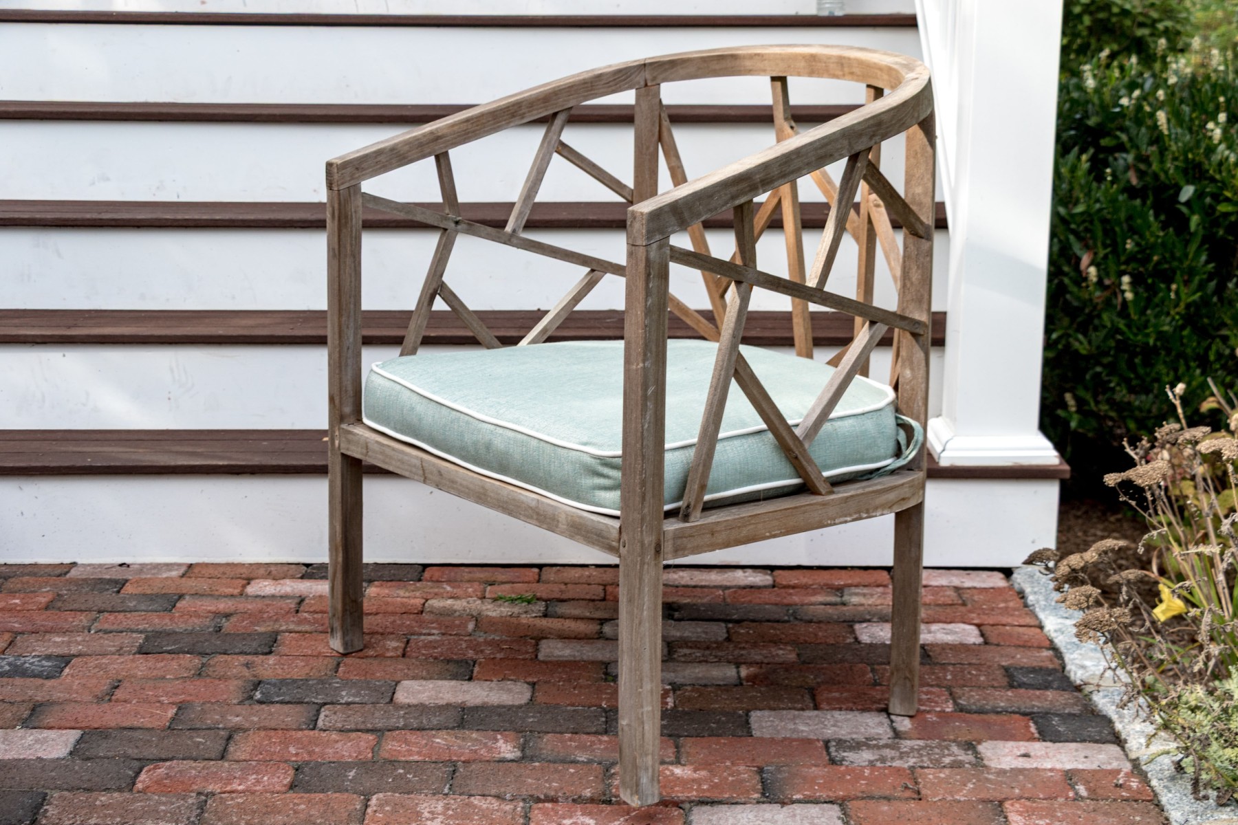 Supported on four legs, the Broyhill teak barrel back armchair features stylish "cracked ice" pattern stretcher supports to the seat back and arms. The quality teak armchair has a loose upholstered seat cushion with white piped trim. Perfect for a patio, porch or garden, this is a fabulous chair perfectly suited for outdoor use.
