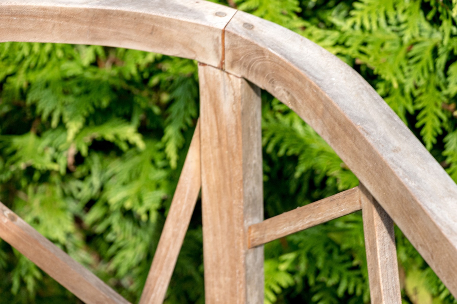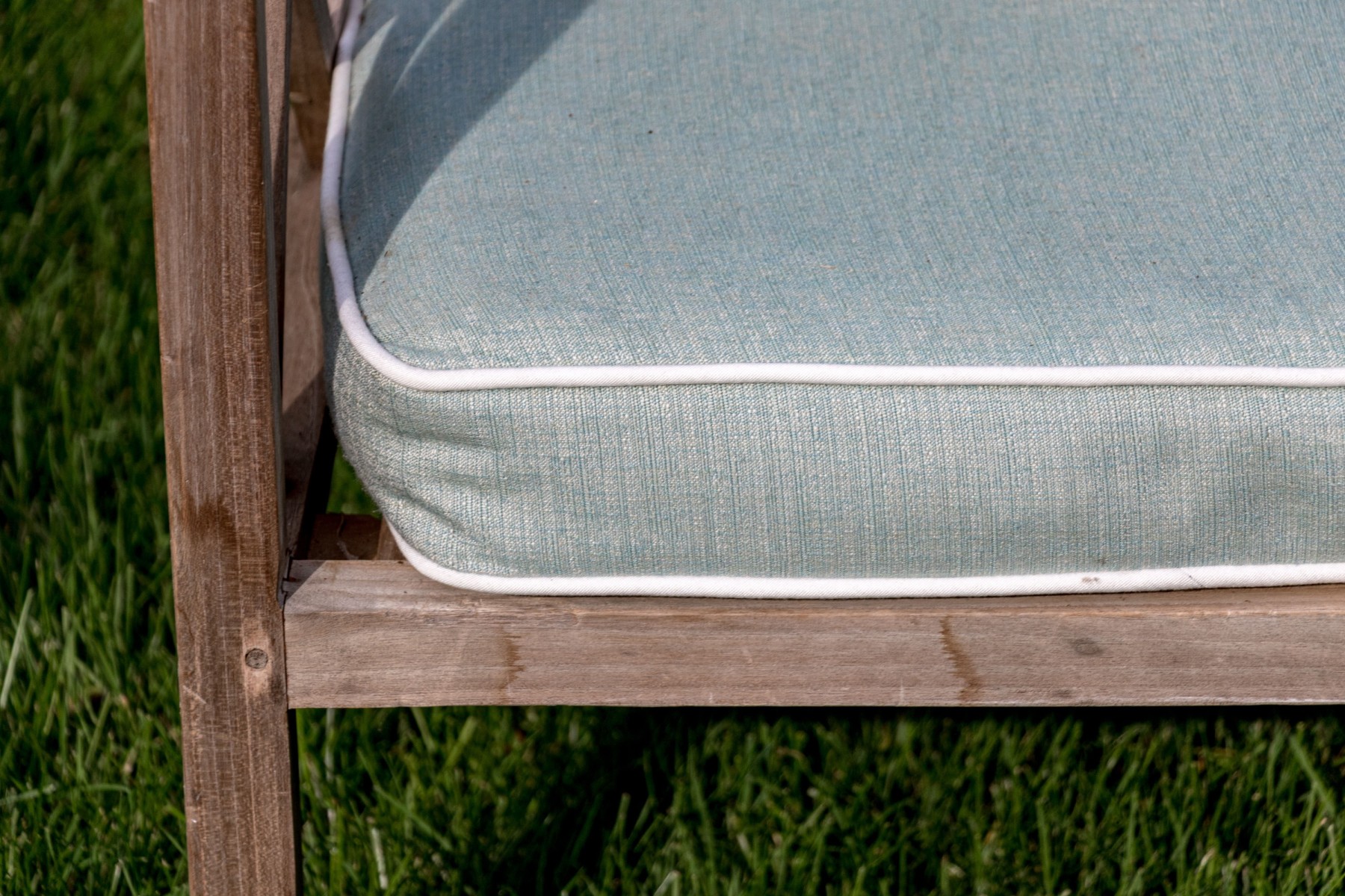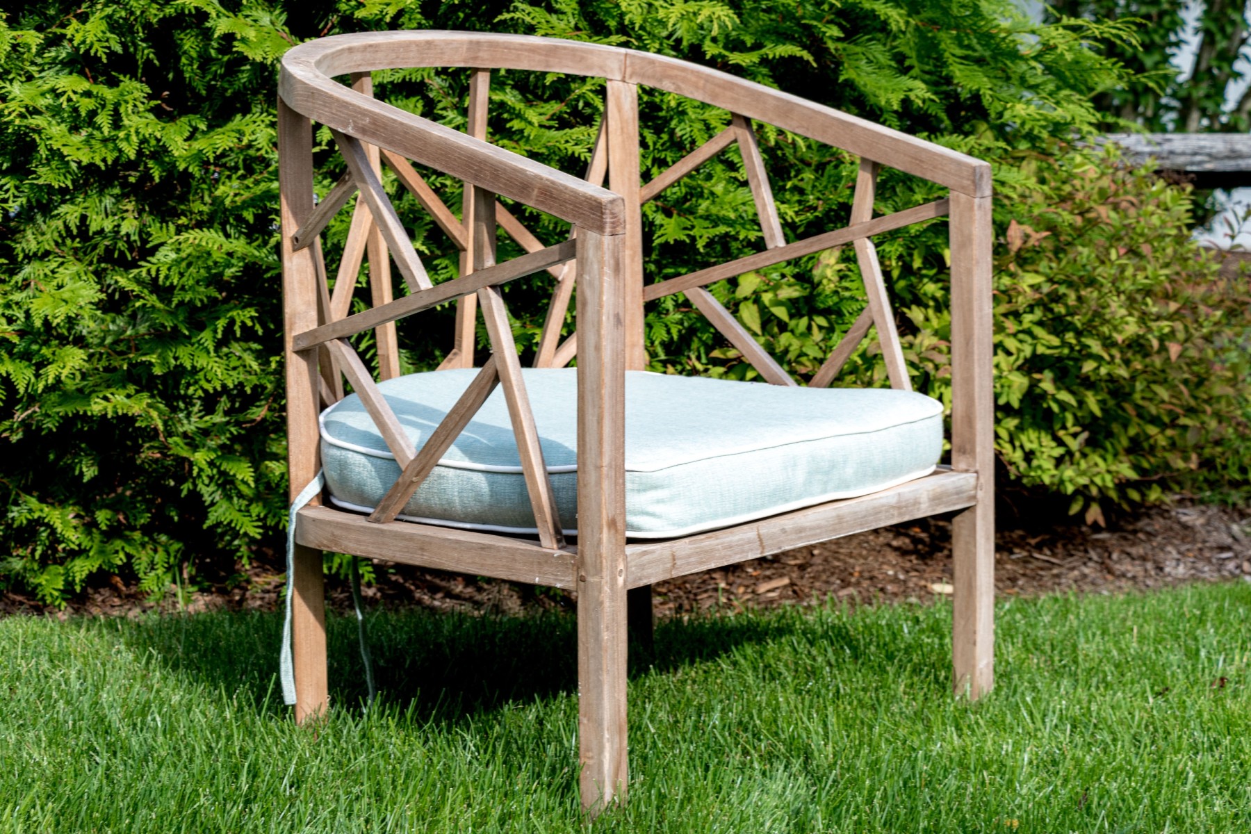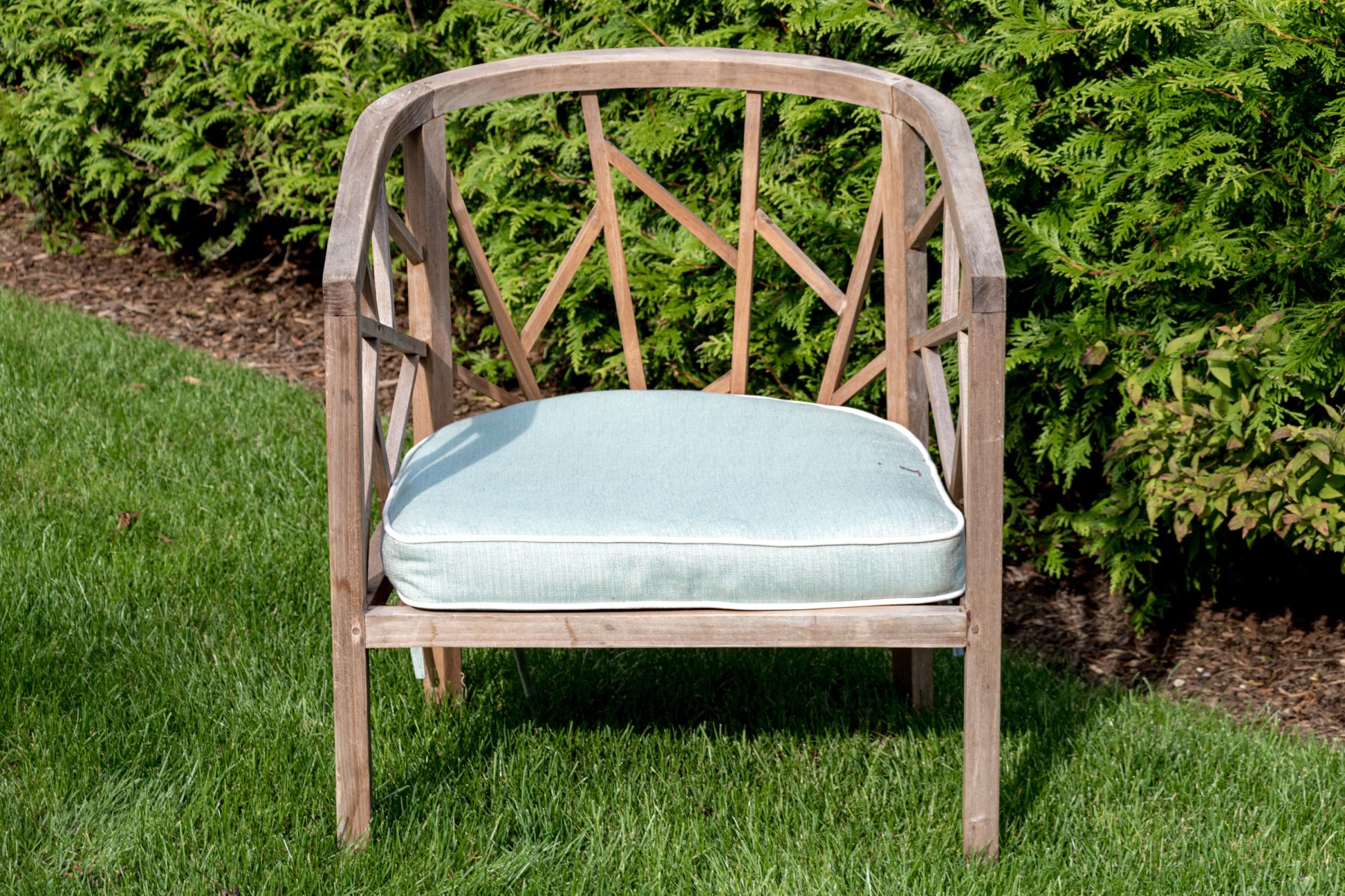 Supported on four legs, the Broyhill teak barrel back armchair features stylish "cracked ice" pattern stretcher supports to the seat back and arms. The quality teak armchair has a loose upholstered seat cushion with white piped trim. Perfect for a patio, porch or garden, this is a fabulous chair perfectly suited for outdoor use.