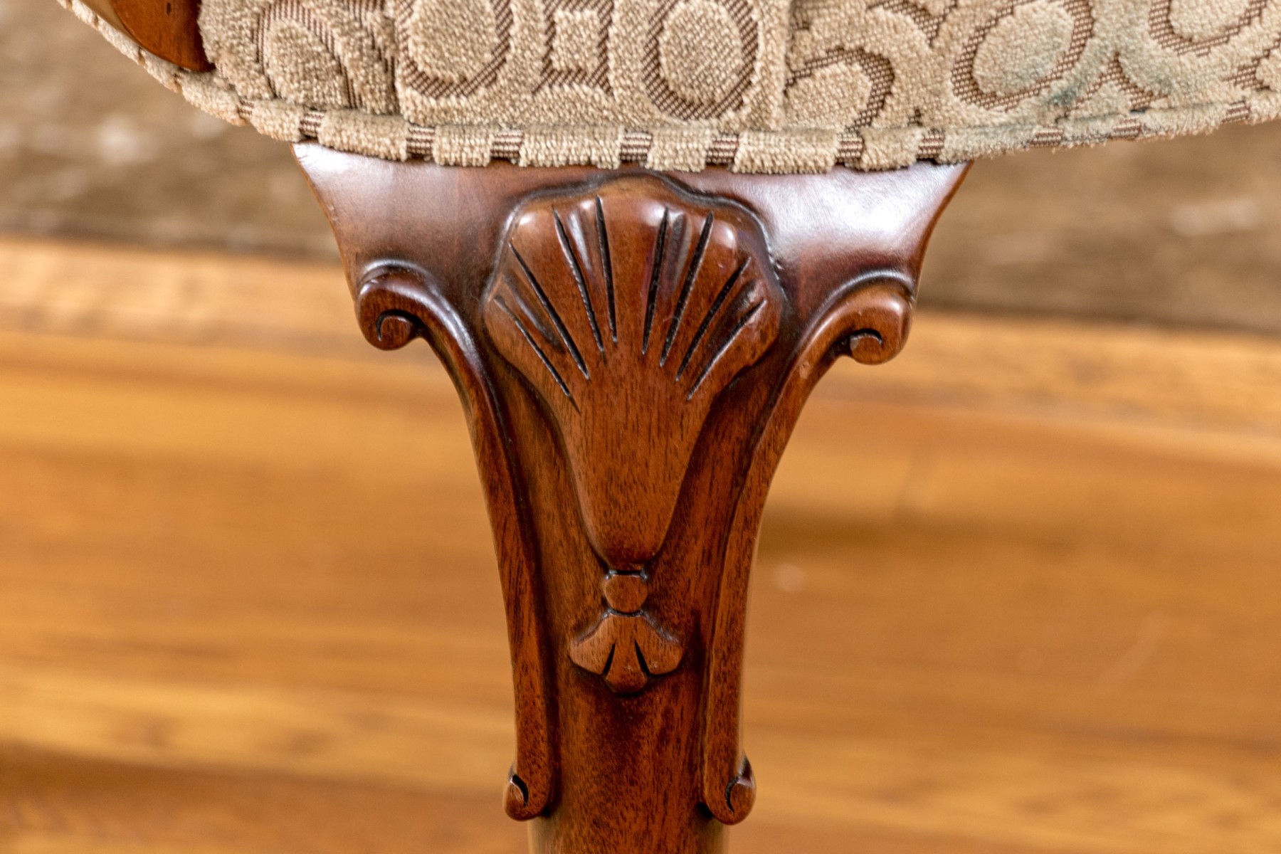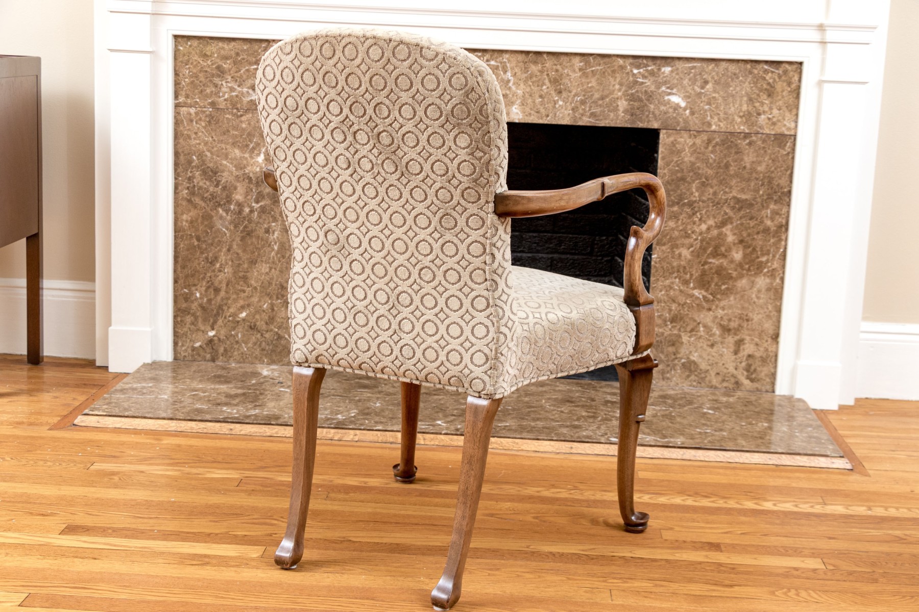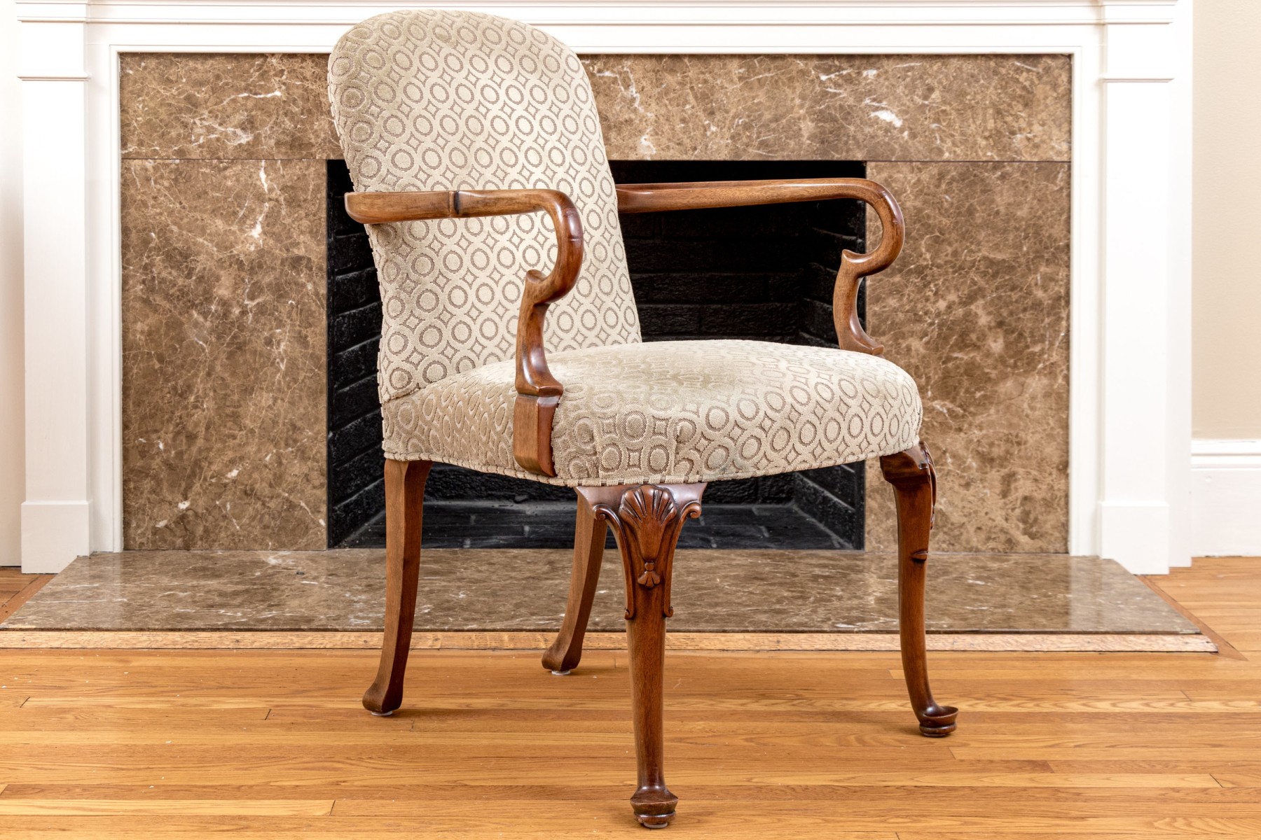 A high quality armchair in classic Queen Anne style designed with a rounded back and seat upholstered in beige fabric with a unique circle and diamond pattern. Nicely carved with medium brown mahogany swan neck arms and shell flourishes on the knees of cabriole front legs terminating with pad feet.