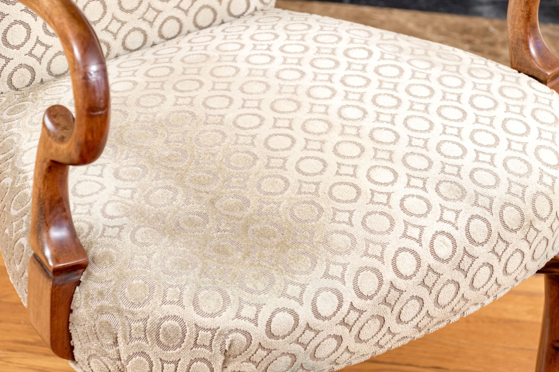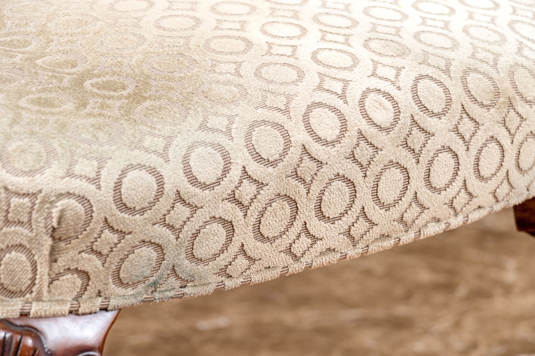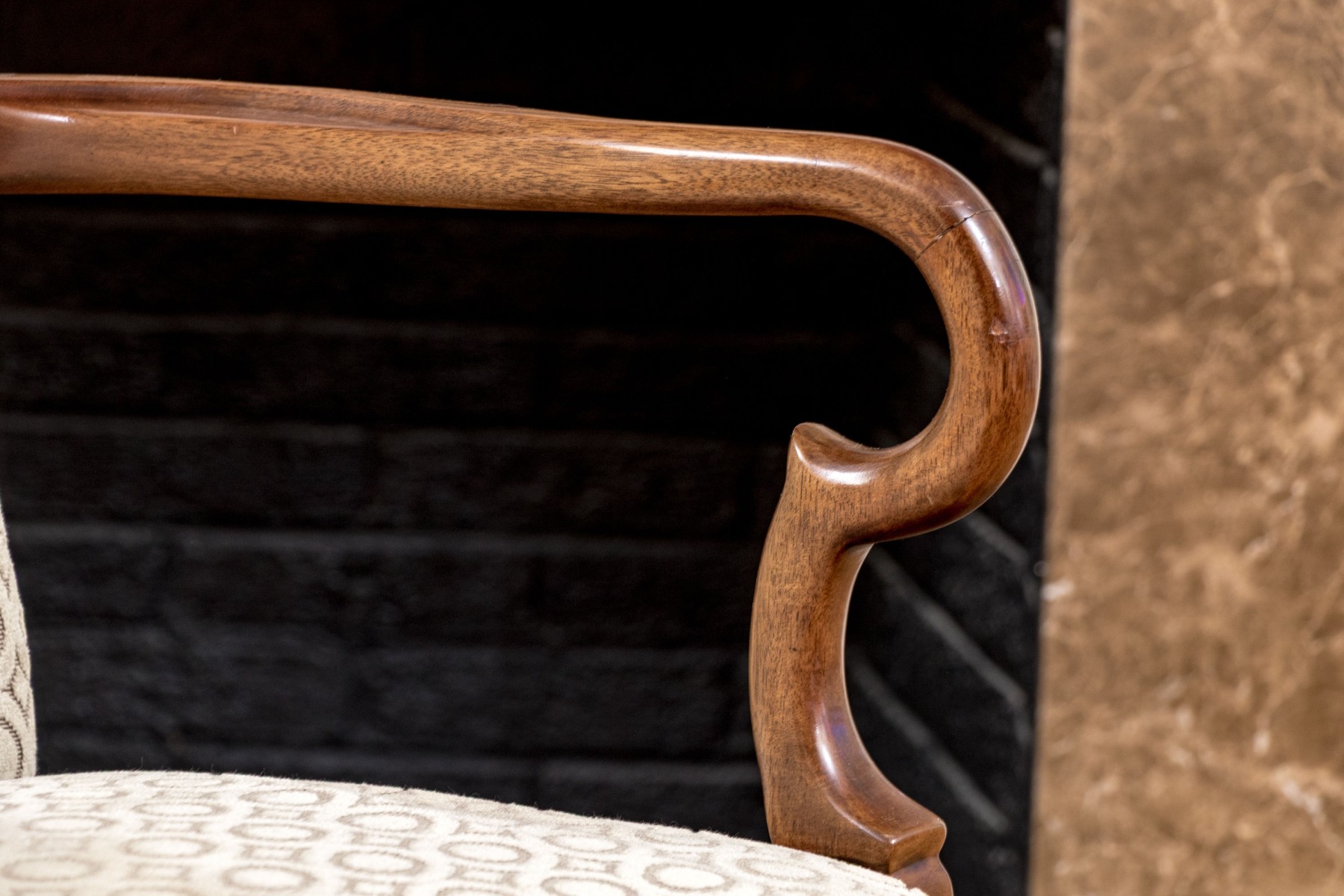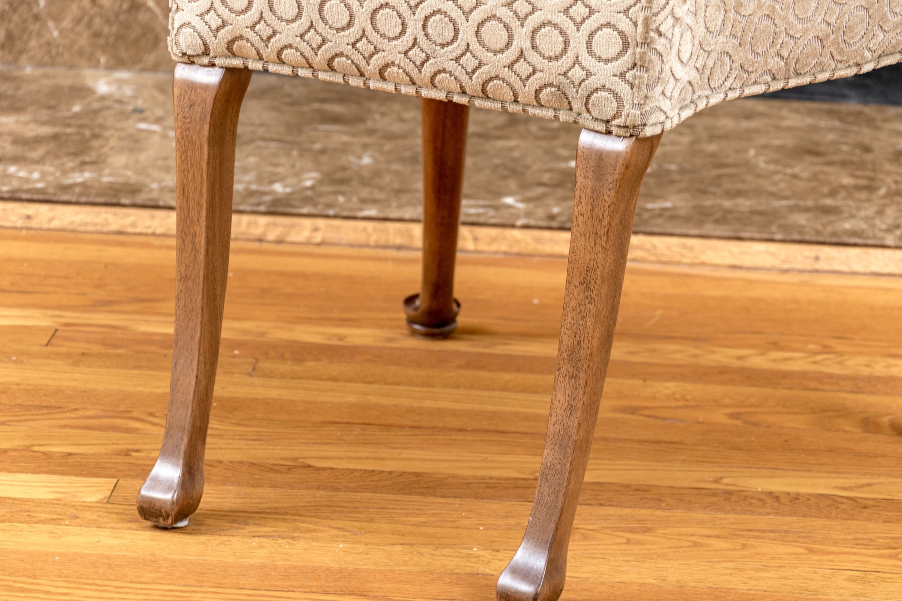A high quality armchair in classic Queen Anne style designed with a rounded back and seat upholstered in beige fabric with a unique circle and diamond pattern. Nicely carved with medium brown mahogany swan neck arms and shell flourishes on the knees of cabriole front legs terminating with pad feet.
