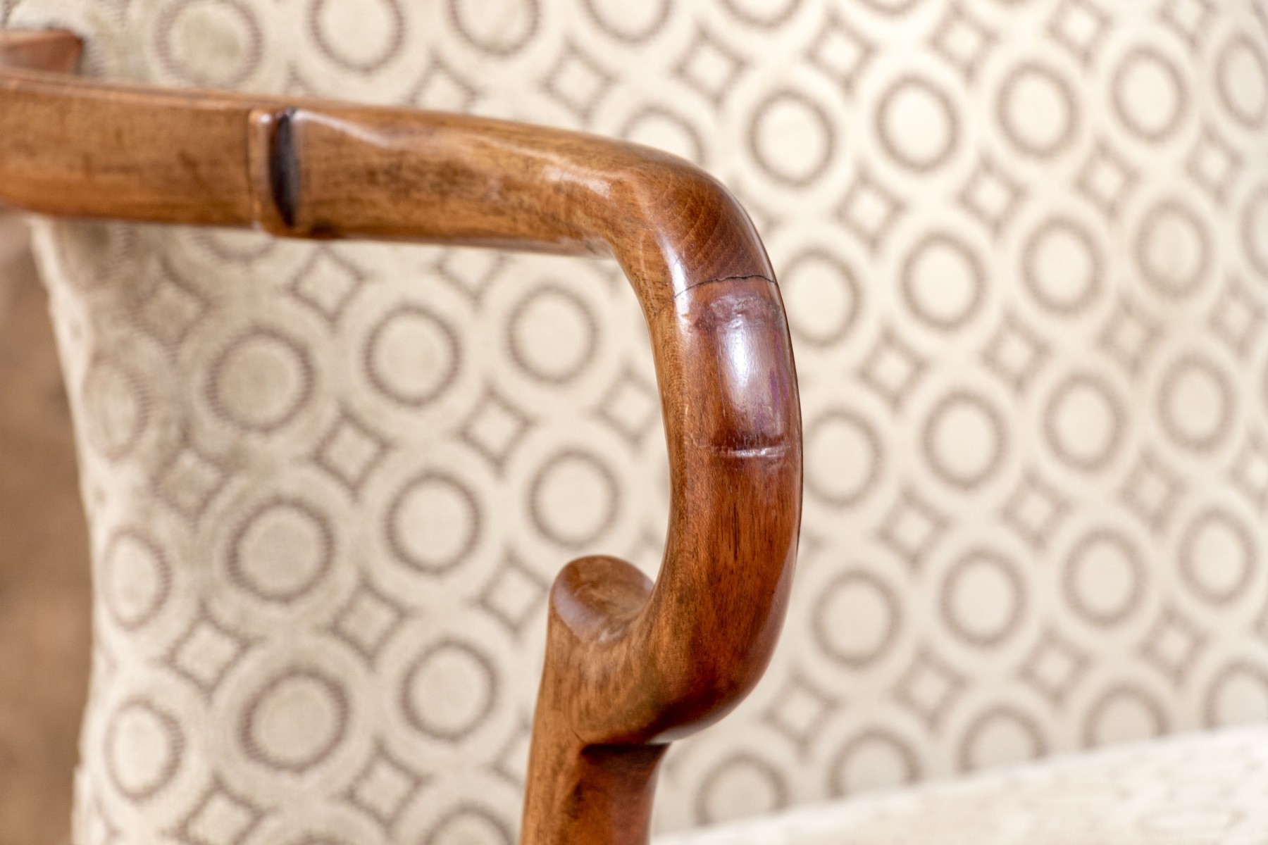 Good overall, sunned finish to frame and upholstery. Left arm is more sunned than right and wear to upholstery is commensurate with age ands.