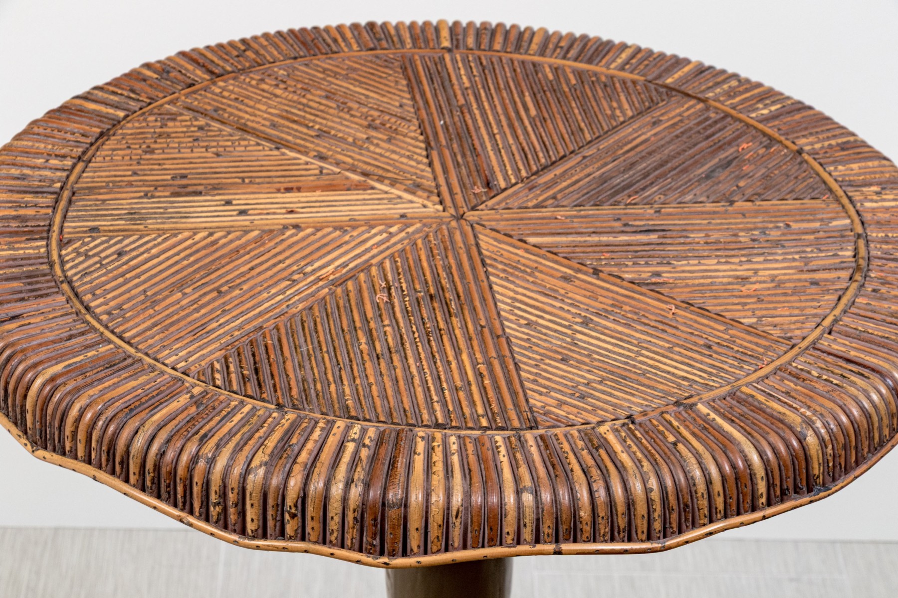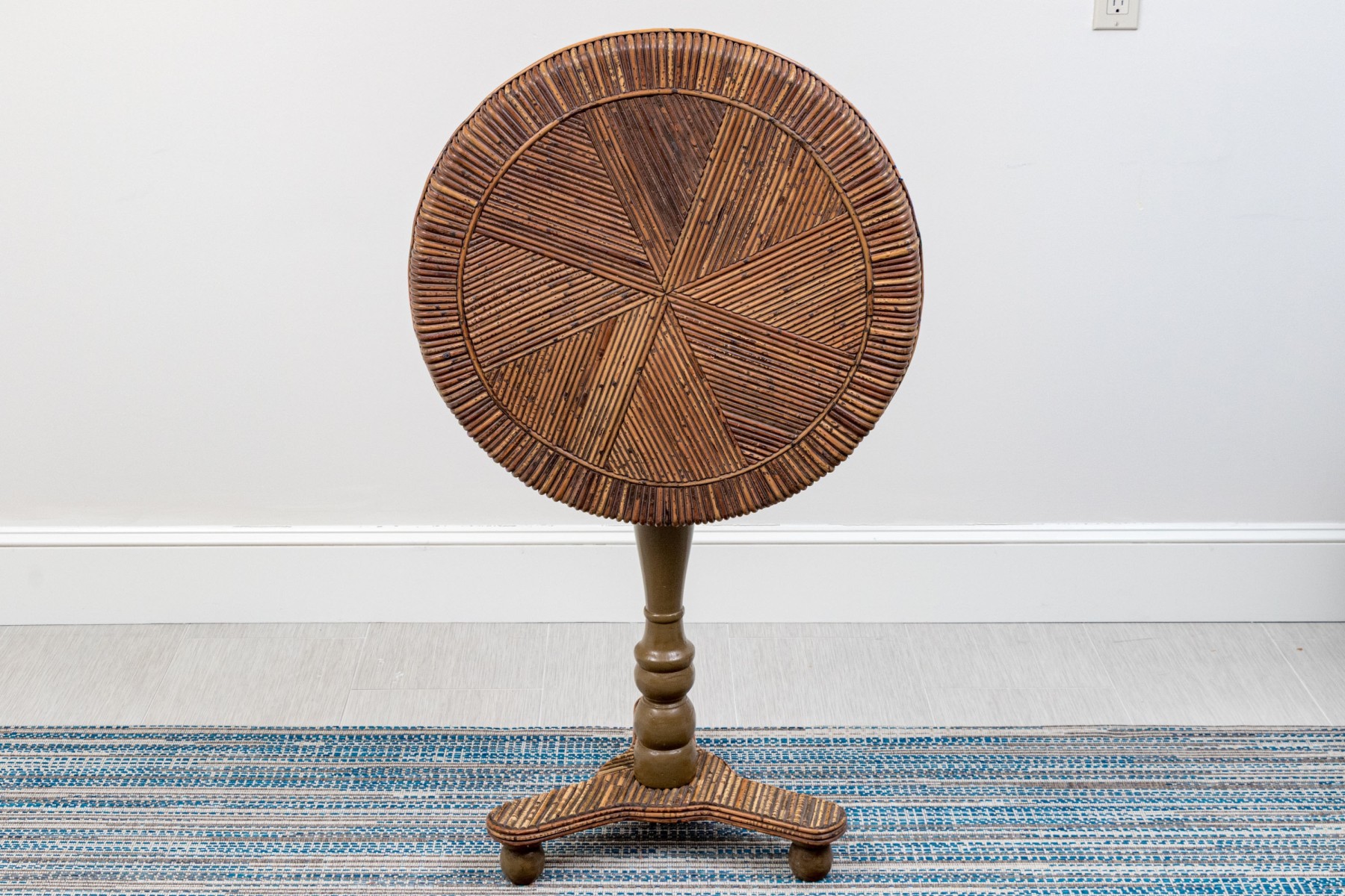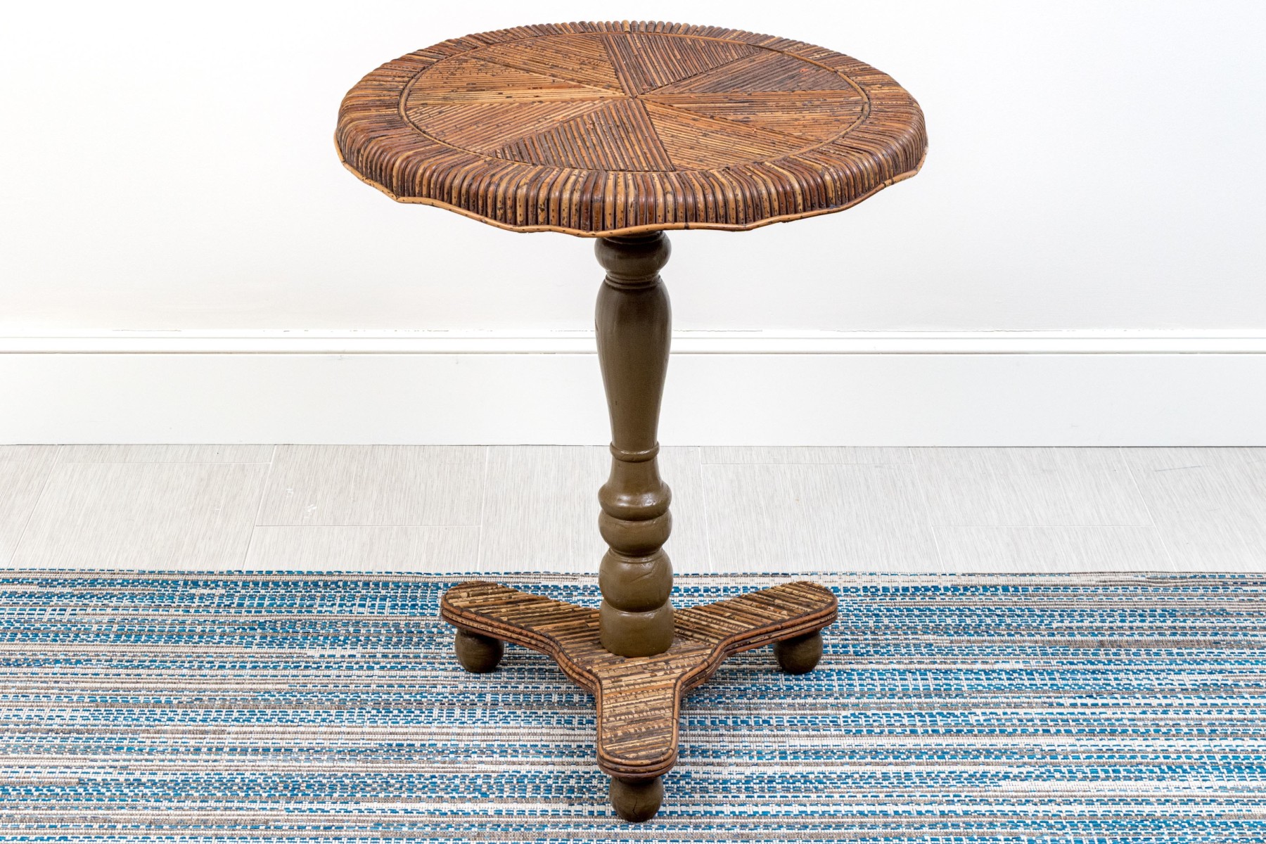 A charming accent gueridon table with a touch of naturalistic appeal, showcasing a circular tilt top with a reeded marquetry style design in warm-toned light and medium brown leading to a banded edge and undulating trim. raised on a baluster turned pedestal leading down to a trefoil base on bun feet.