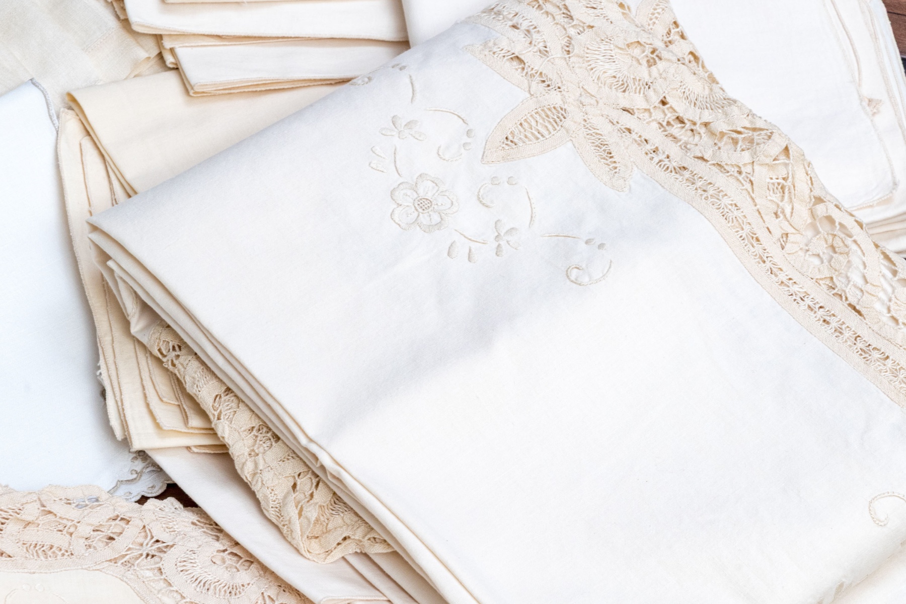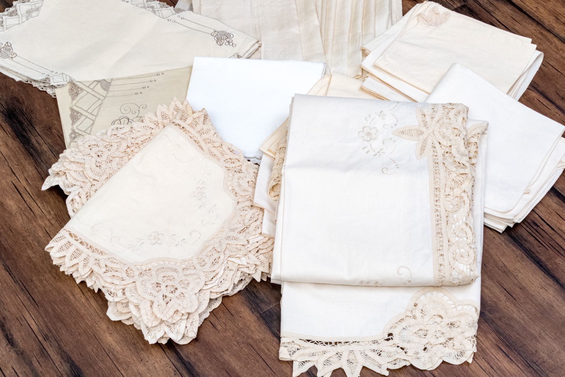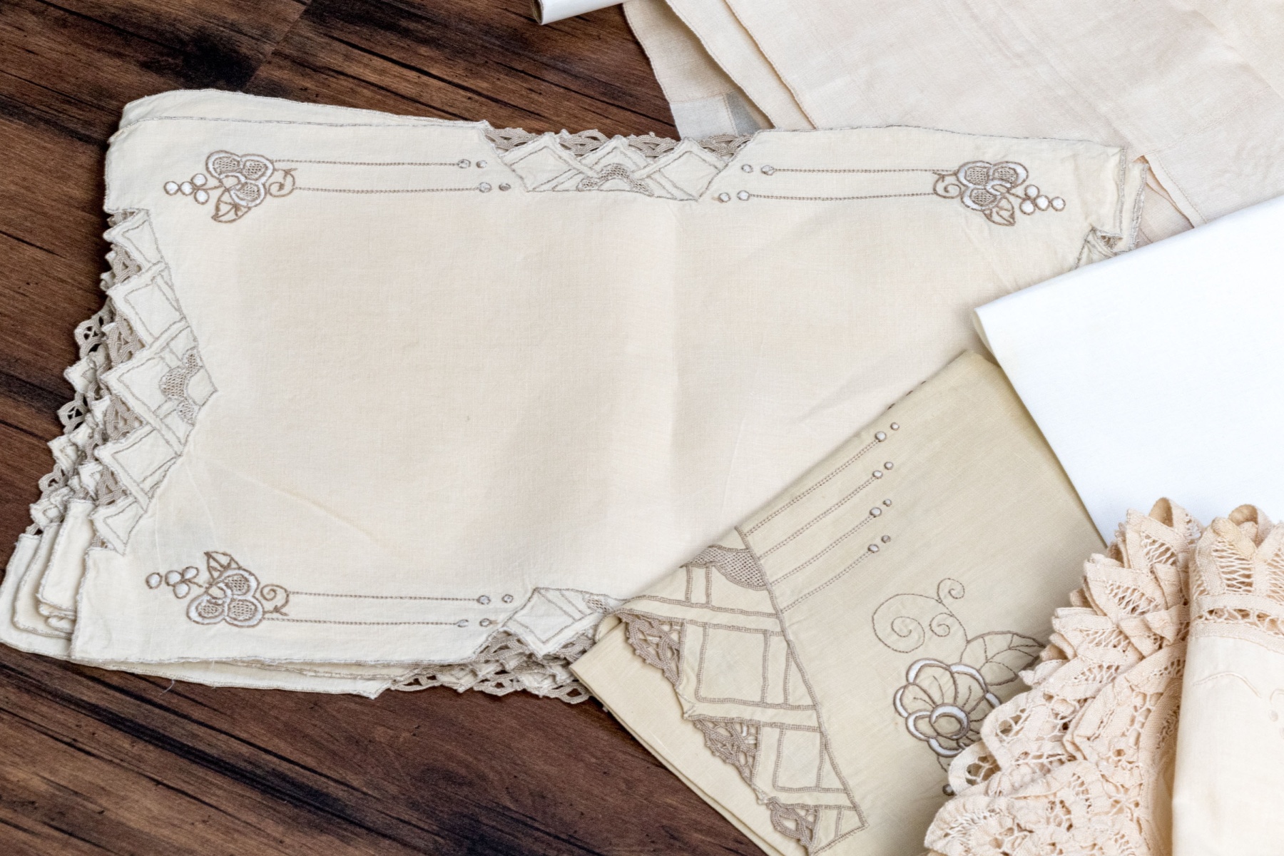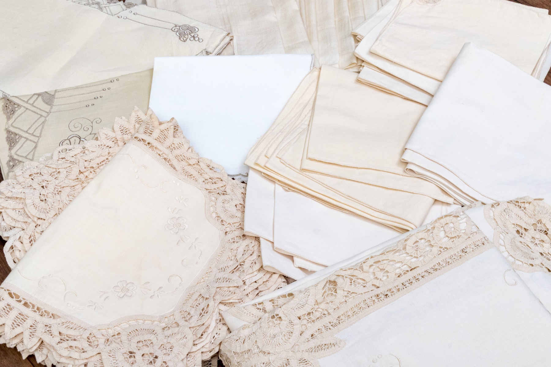 An excellent assortment of table linens including some with lace borders, along with a tablecloth.