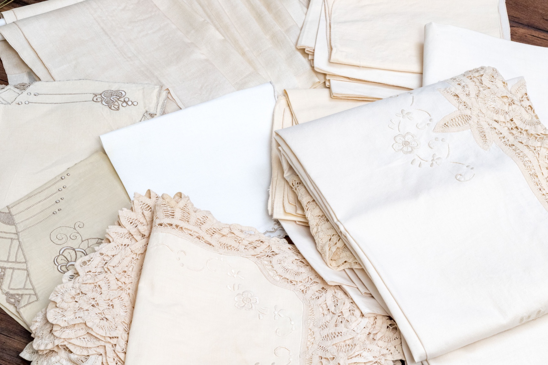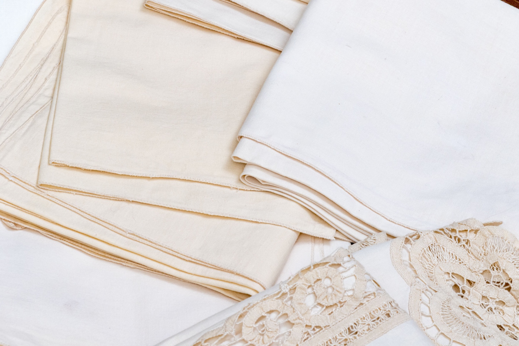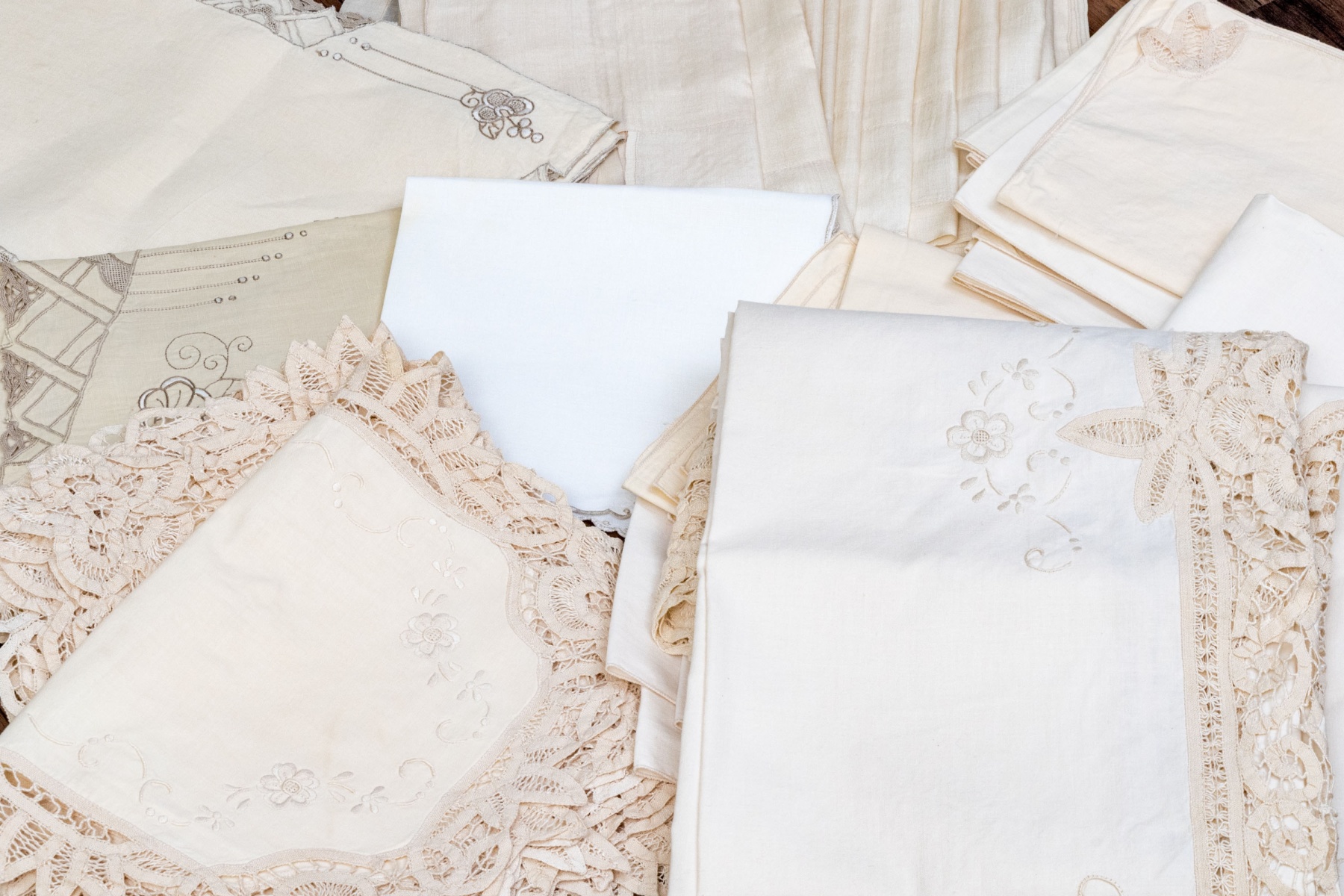 An excellent assortment of table linens including some with lace borders, along with a tablecloth.