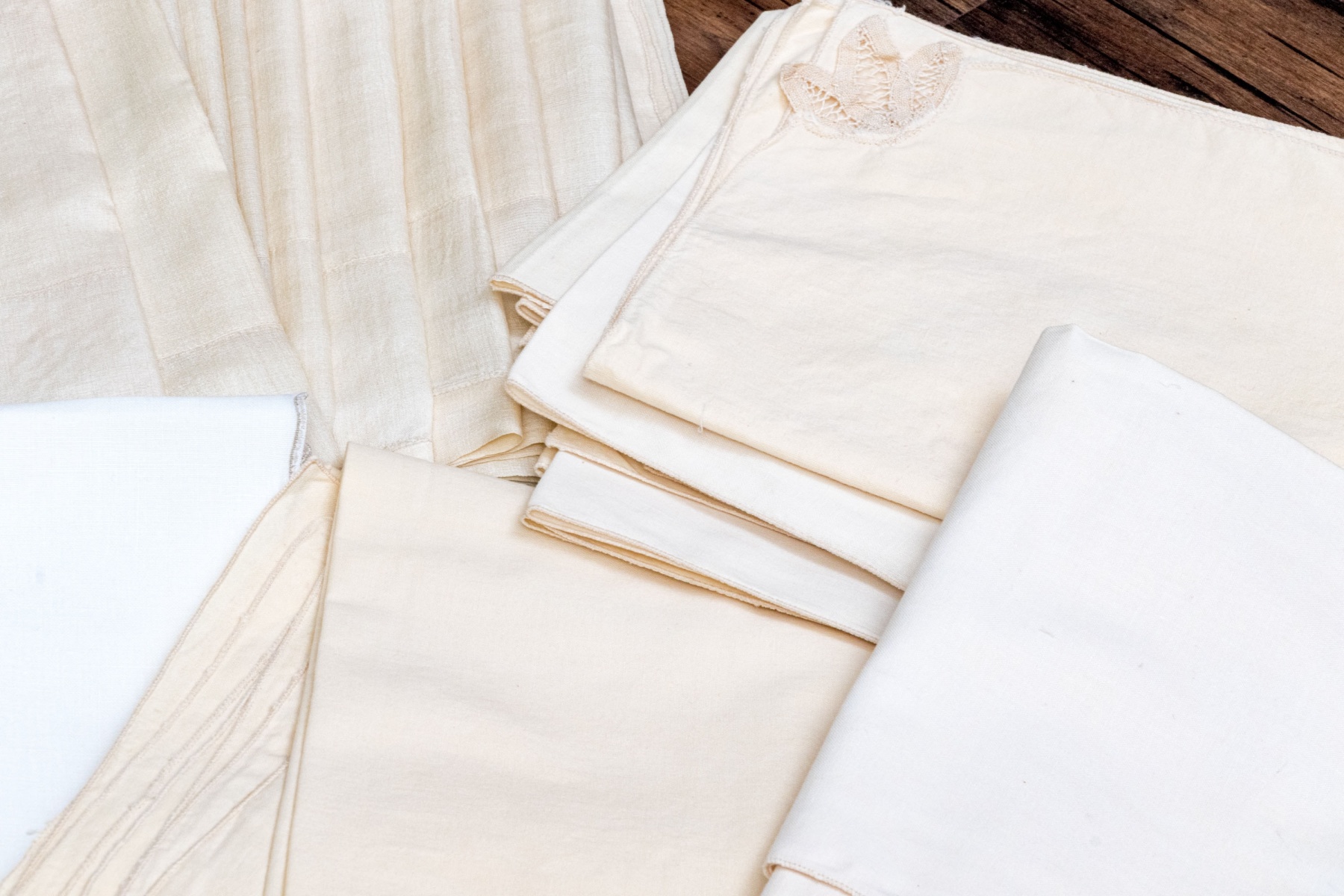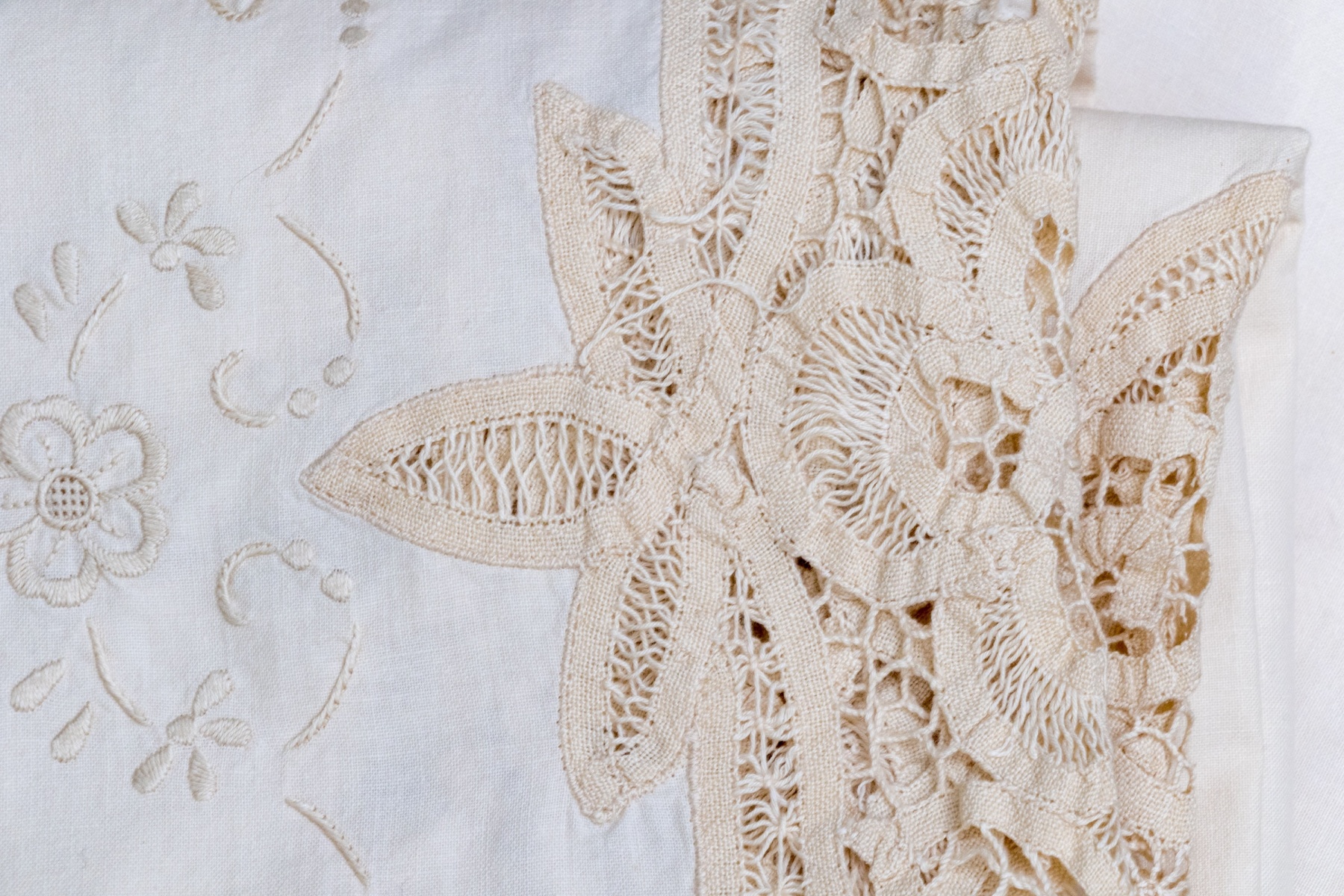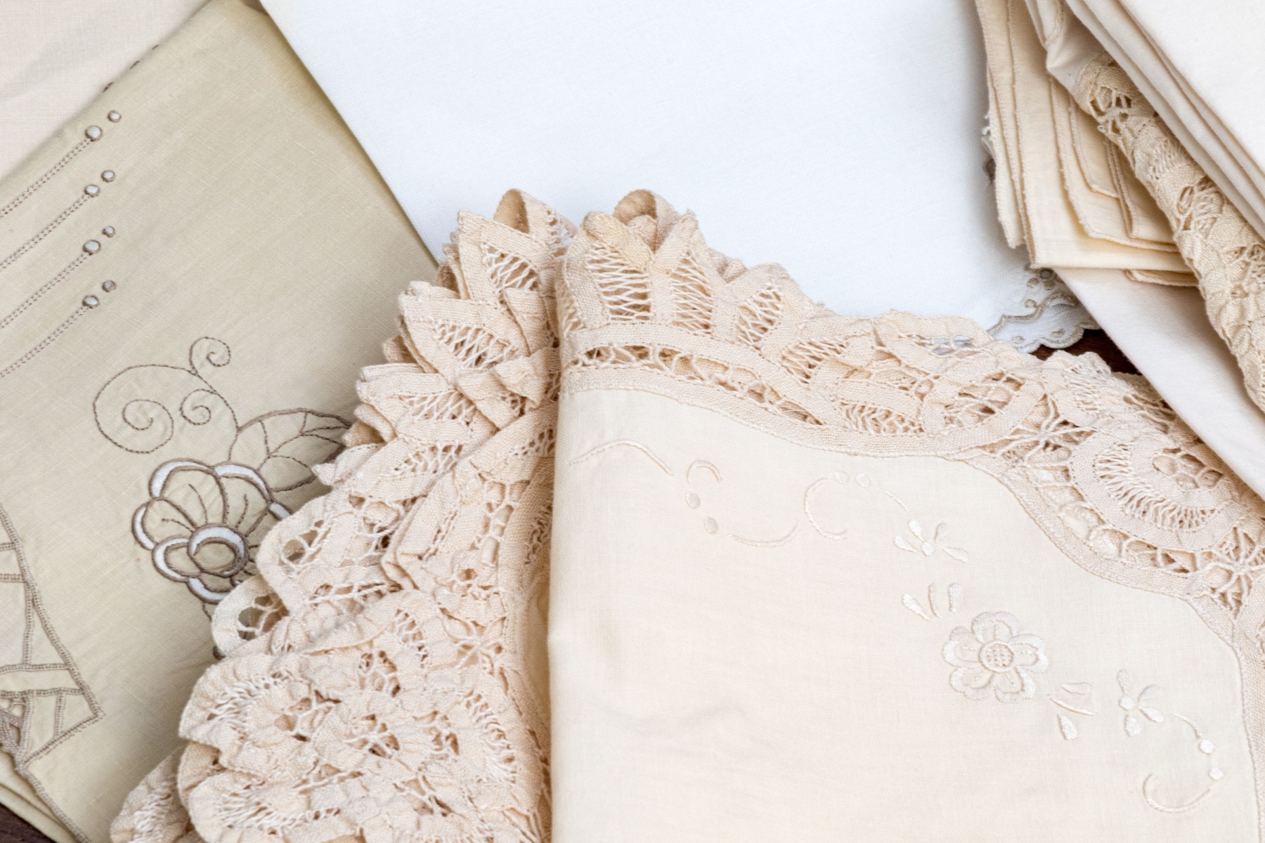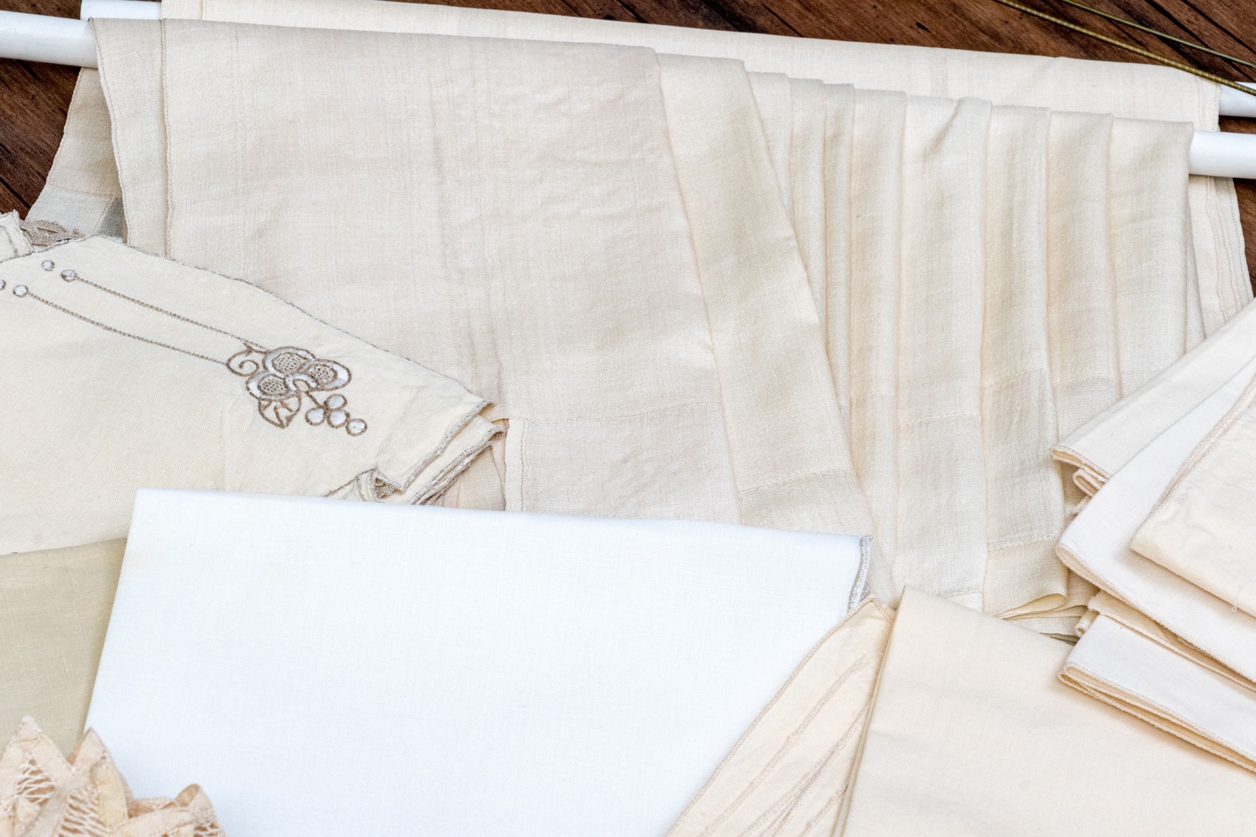 An excellent assortment of table linens including some with lace borders, along with a tablecloth.