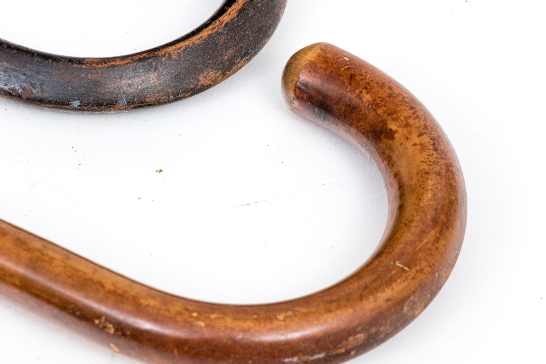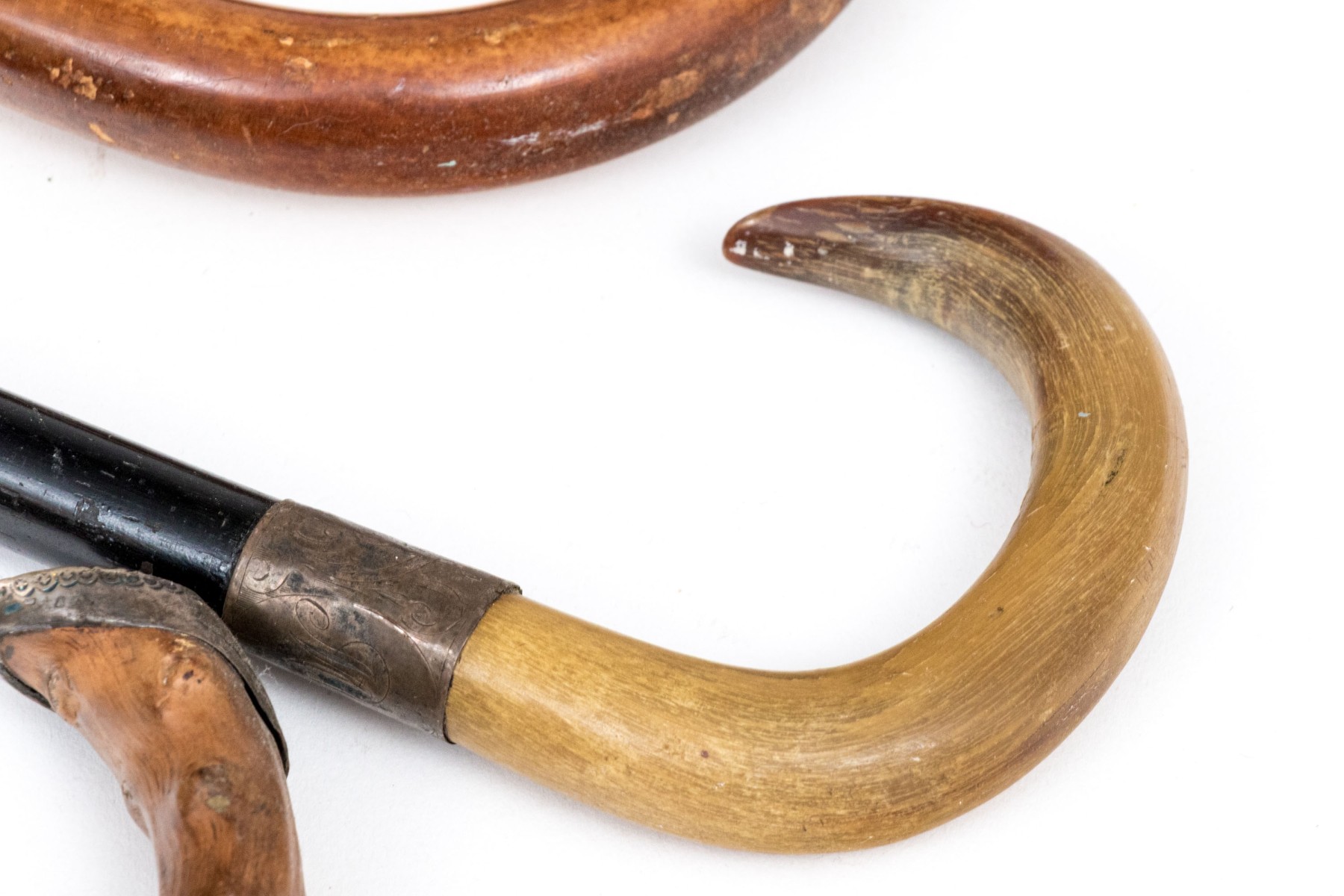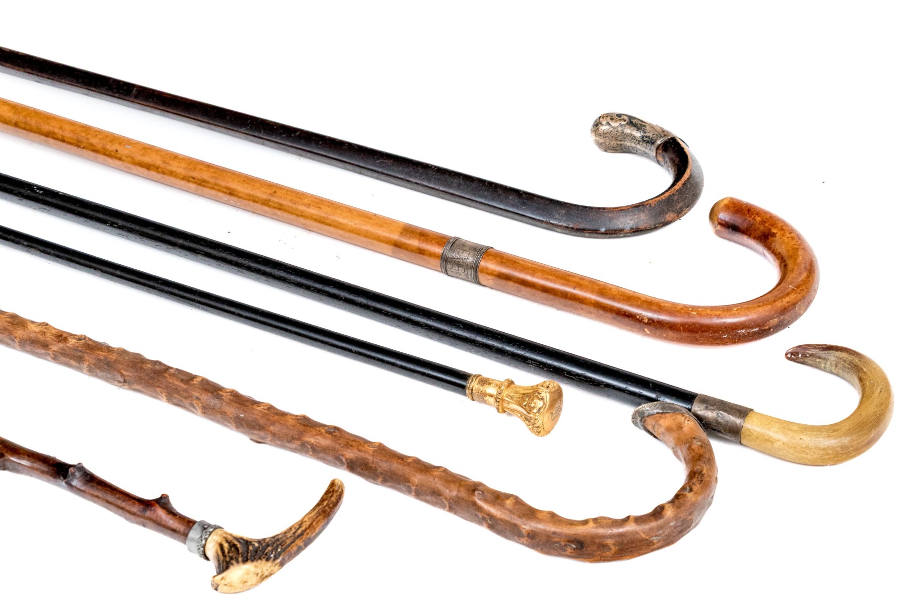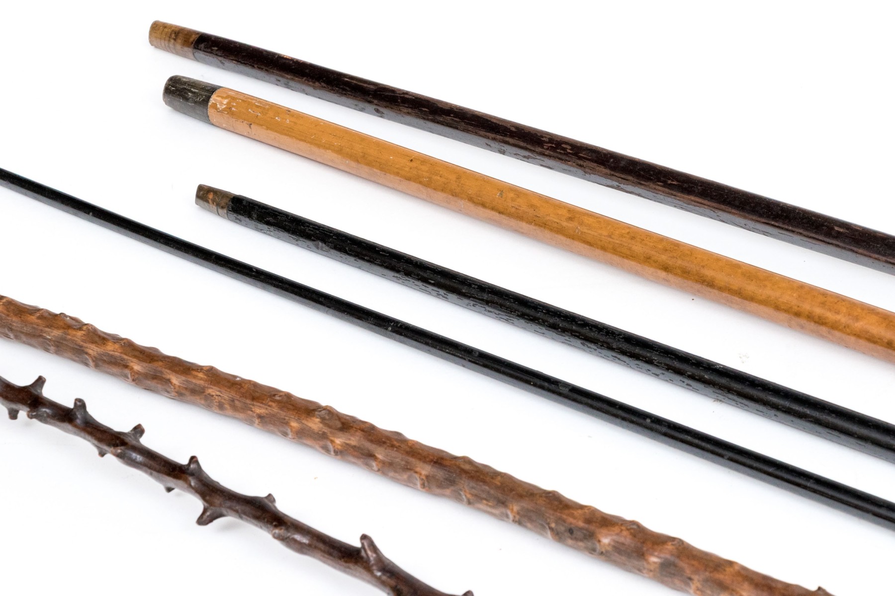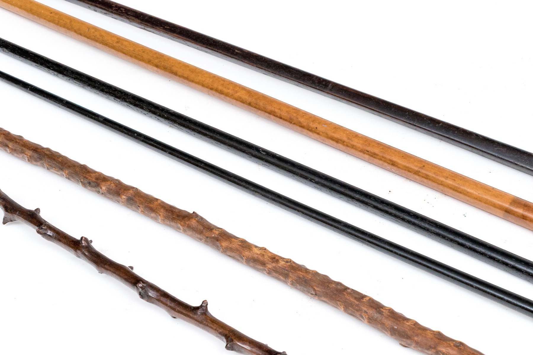 A fabulous collection of six semi-antique wood canes in a variety of designs, including one in Irish black thorn.