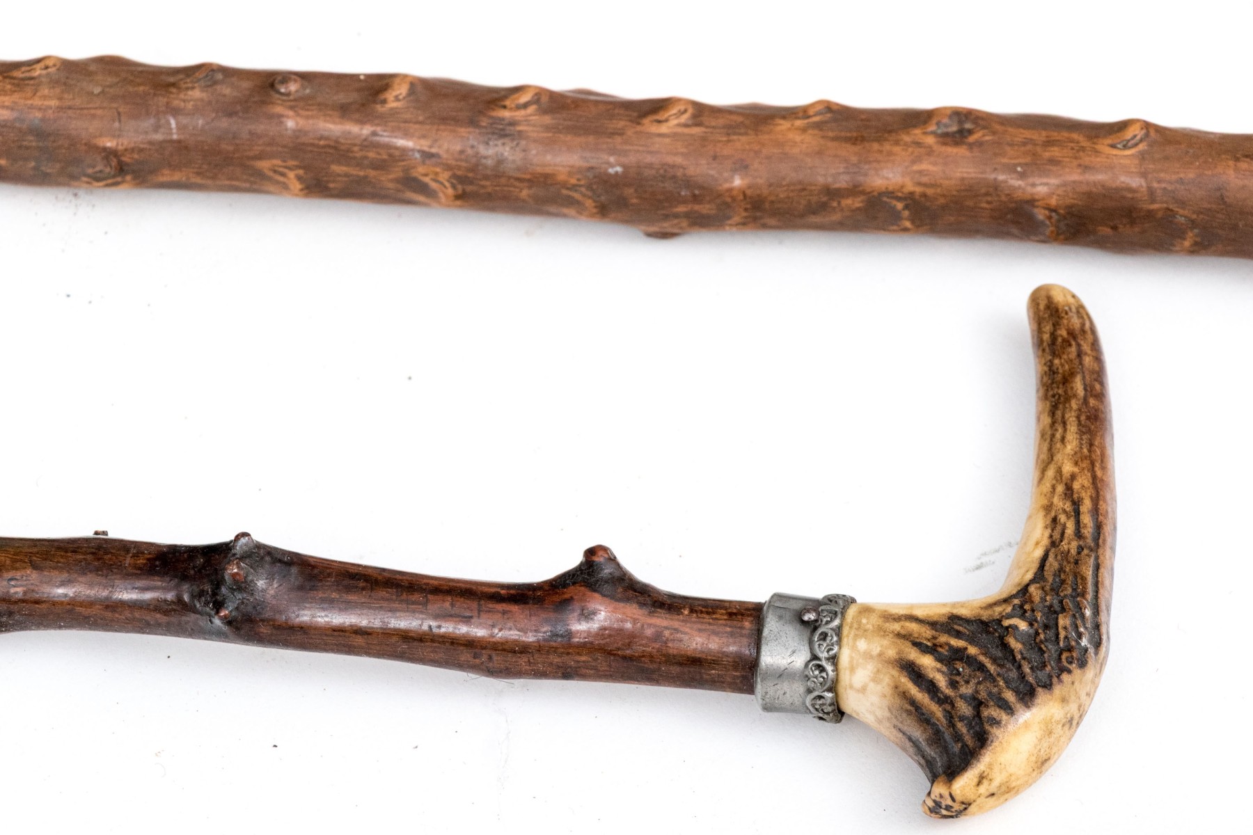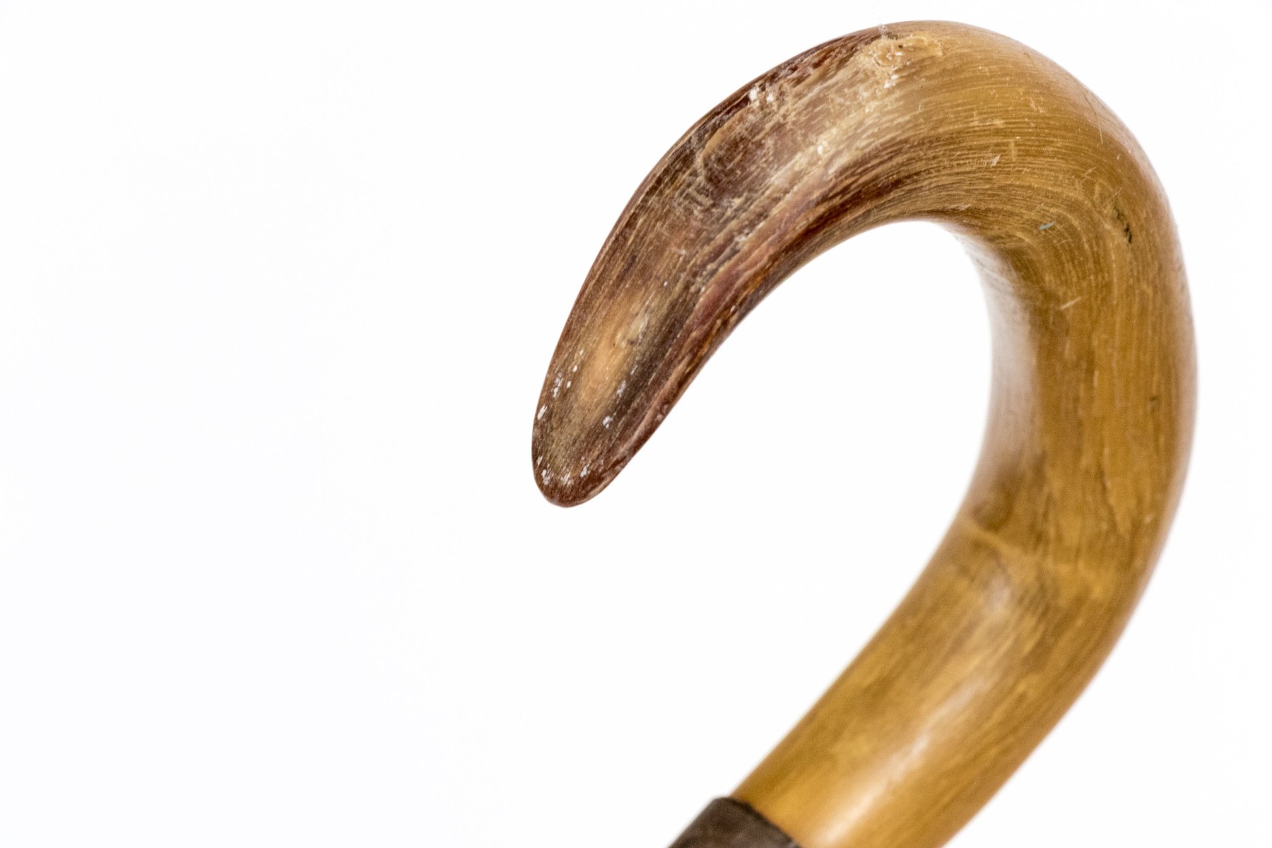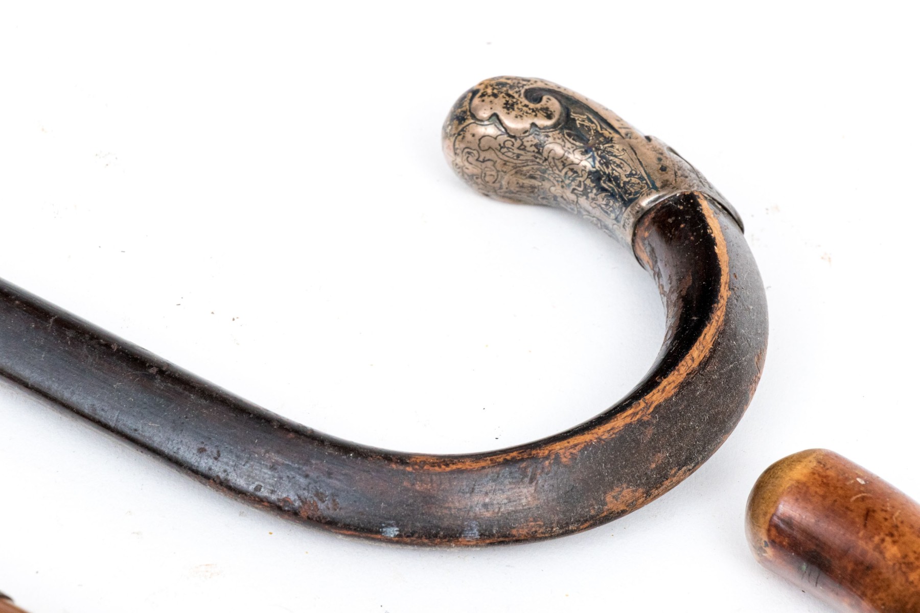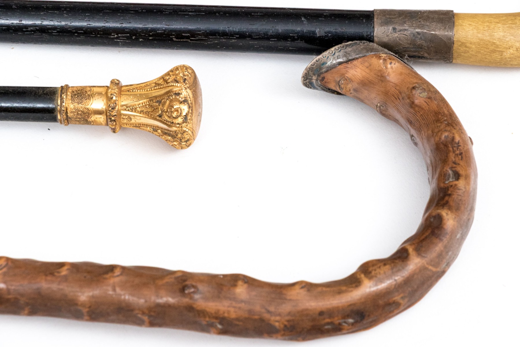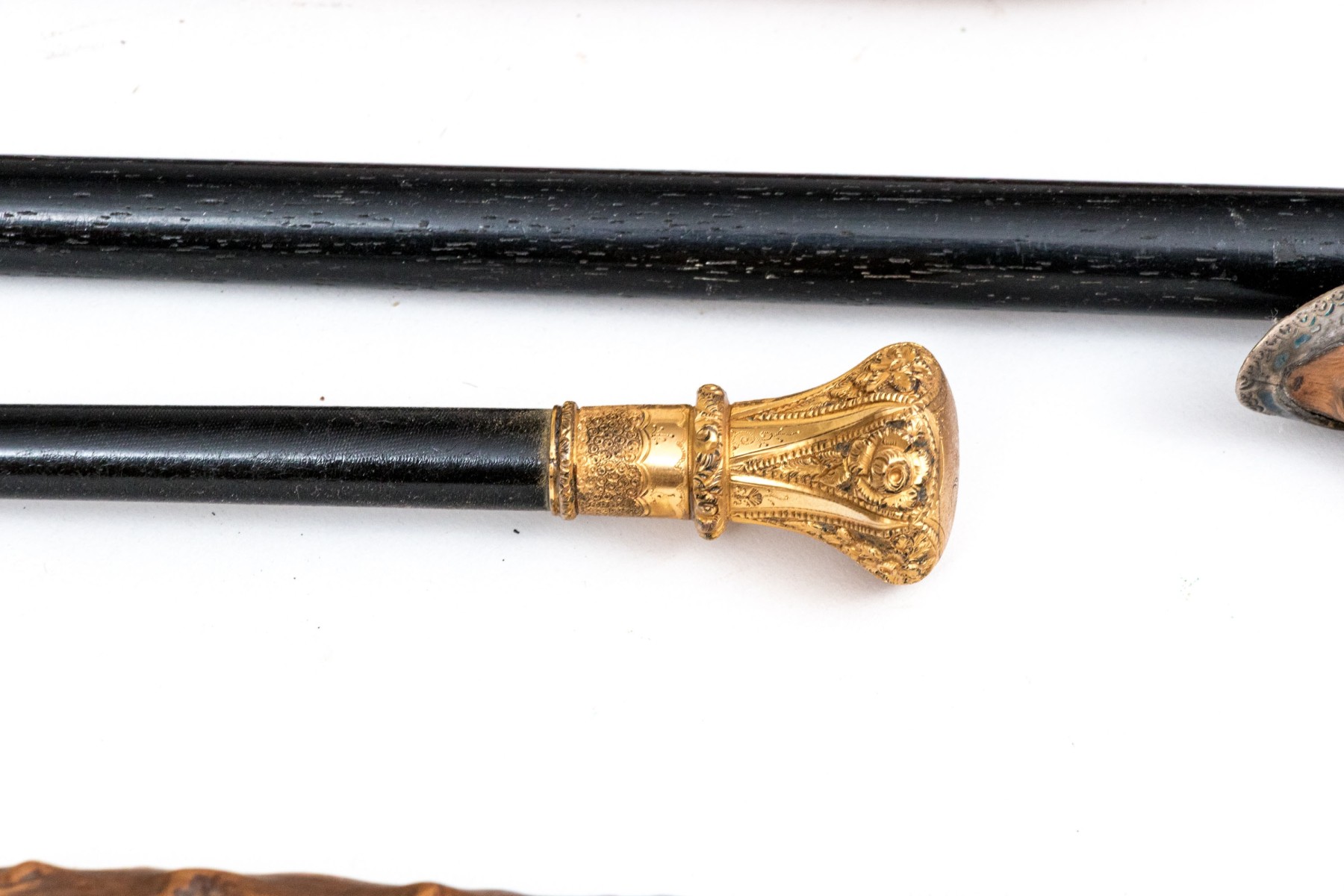 A fabulous collection of six semi-antique wood canes in a variety of designs, including one in Irish black thorn.